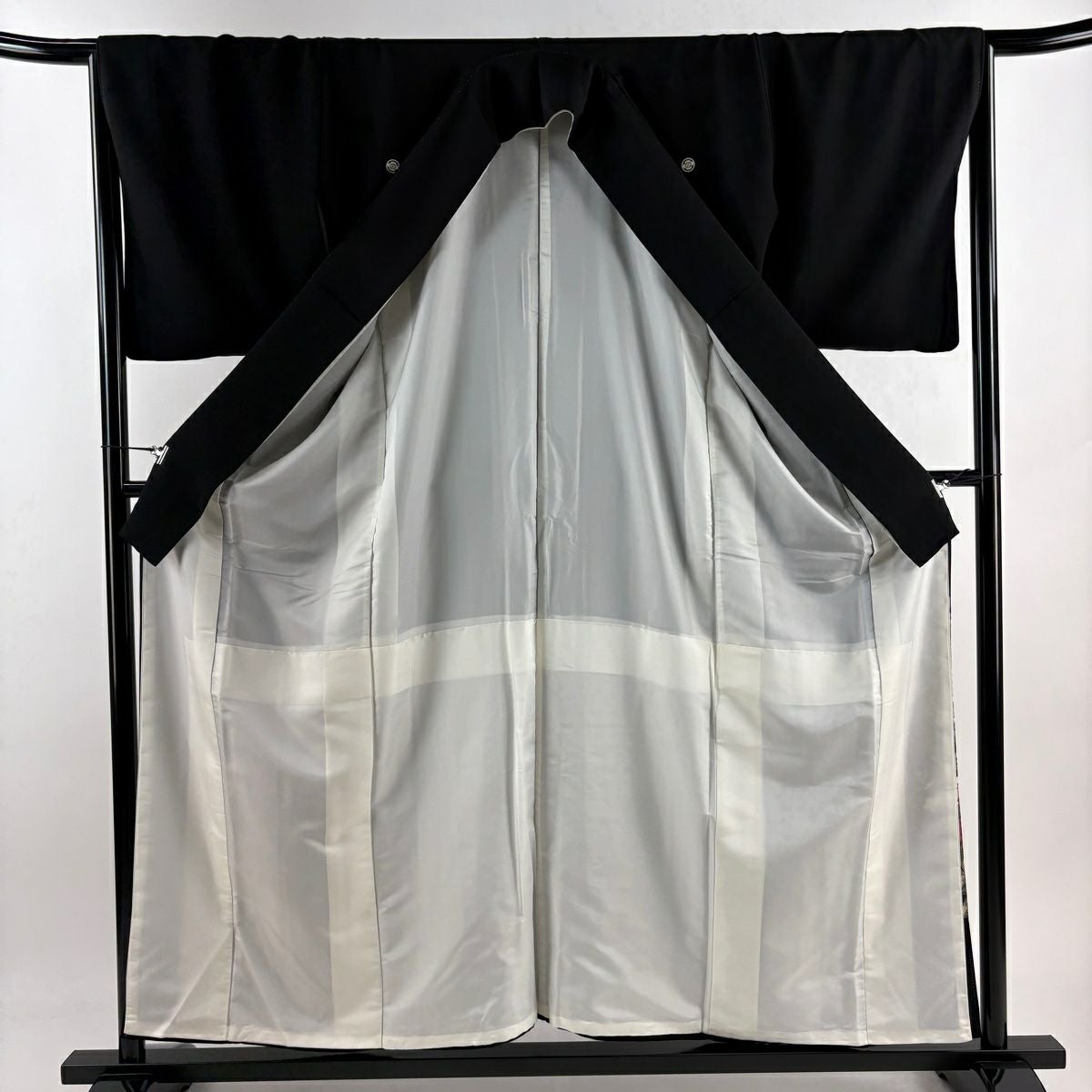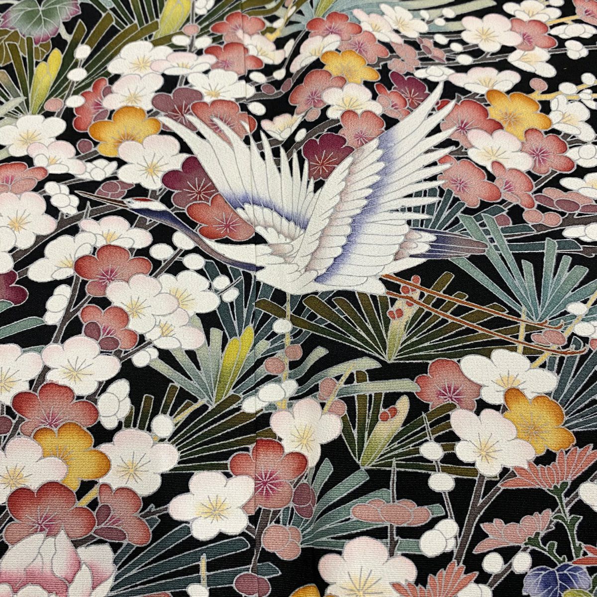留袖は柄付けが裾にのみ絵羽模様で入っており、黒留袖と色留袖という二つに分ける事ができ、色留袖は1、3、5と紋の数が増えるほど格式が上がり比較的に様々なシーンでご着用が出来ます。 黒留袖は五つ紋で既婚女性の第1礼装となり最もフォーマルな着物です。 黒留袖は現代では結婚式で着用されるのがほとんどですので一度は見かけた事のある着物かと思います。 その昔は女性が18歳になった時、又は結婚した時に大人の女性になったとして、振袖の長い袖を切って短くした事で出来たと言われており、この風習が『留袖』と言われておりそのまま留袖という名前が定着していきました。