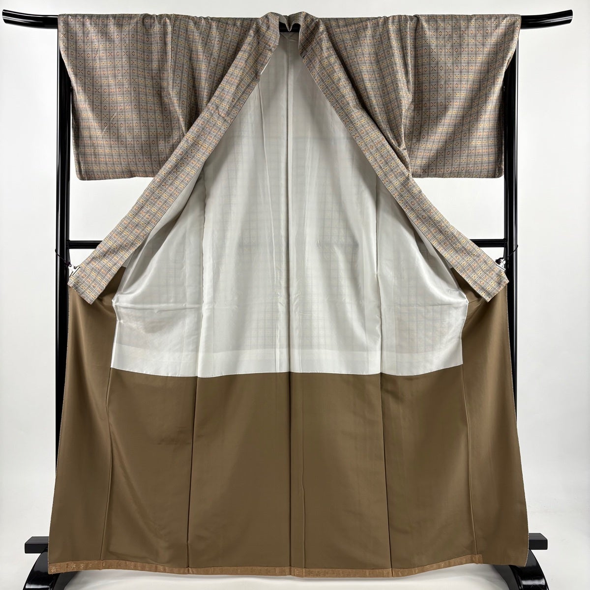 紬 身丈150cm 裄丈62.5cm S 袷 菱 松 灰茶 正絹 秀品