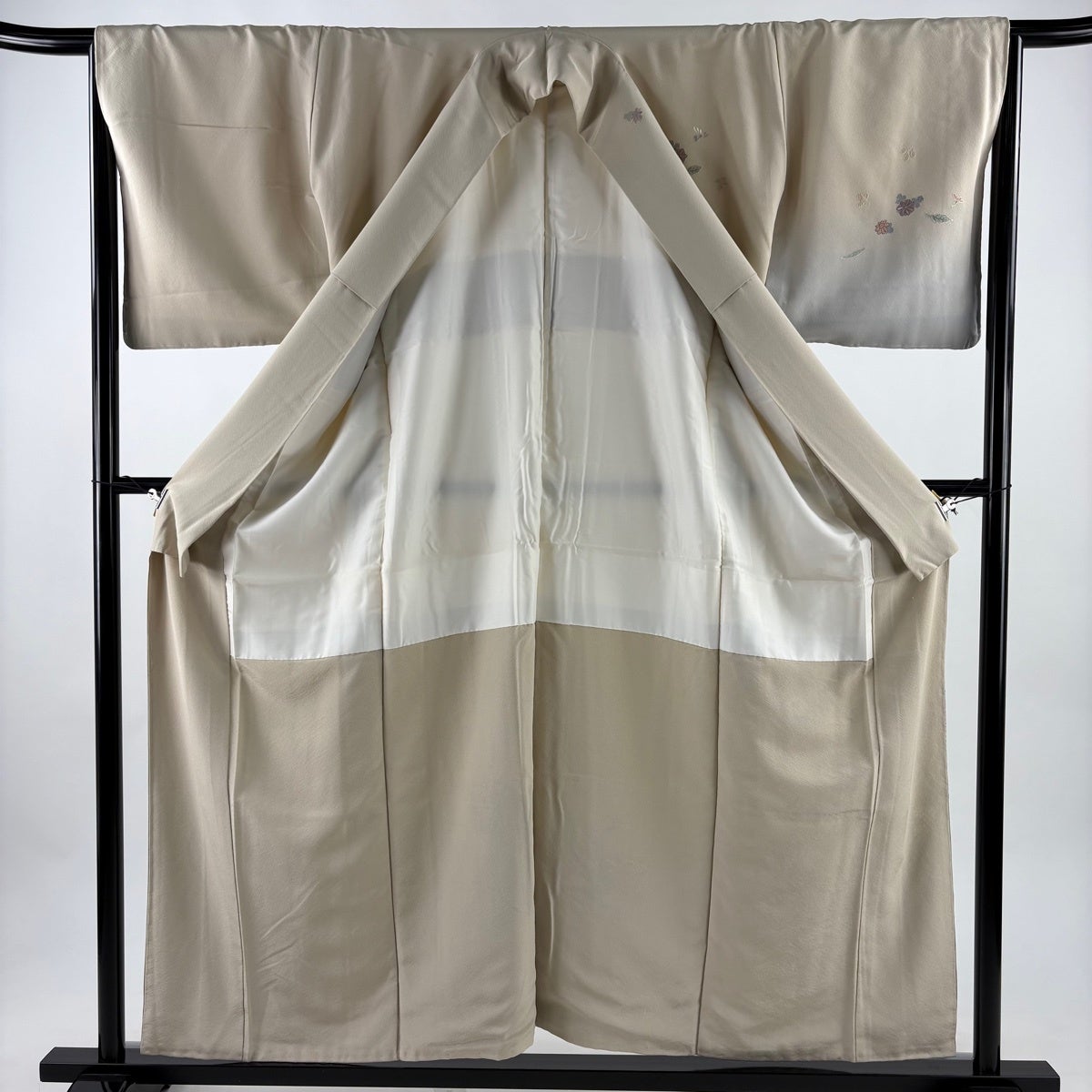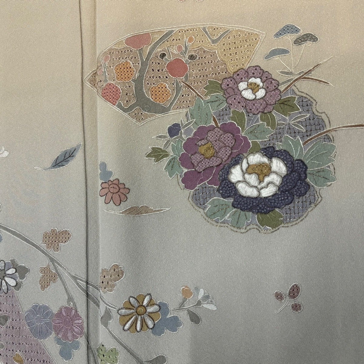 付下げ 身丈156cm 裄丈66cm M 袷 雪輪 枝花 刺繍 金糸 ベージュ 正絹 秀品
