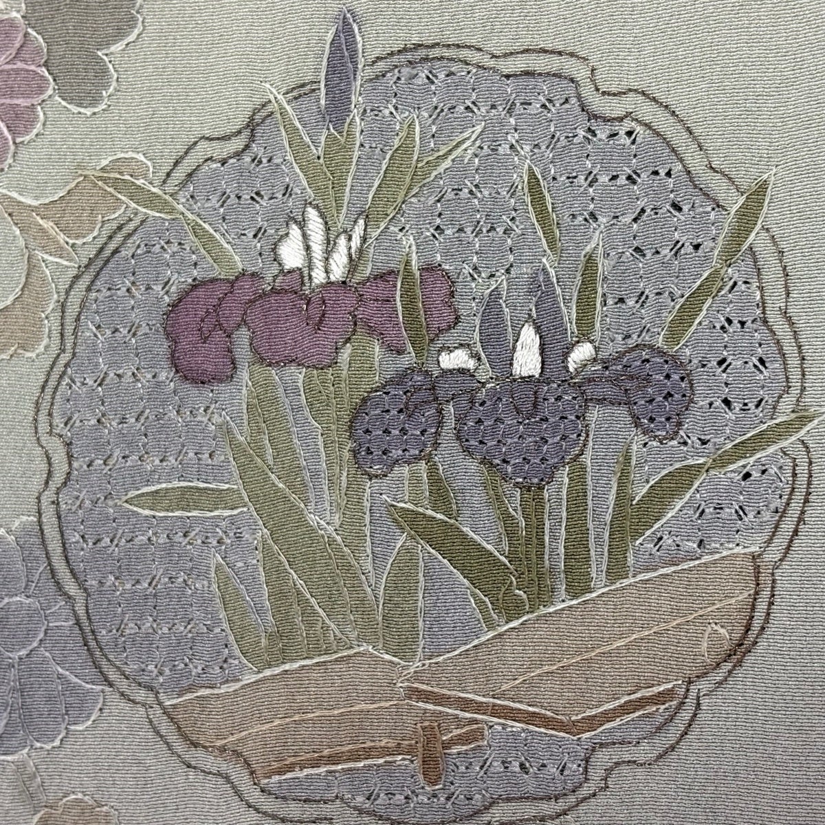 付下げ 身丈158cm 裄丈66cm M 袷 草花 籠目 金彩 灰緑 正絹 秀品