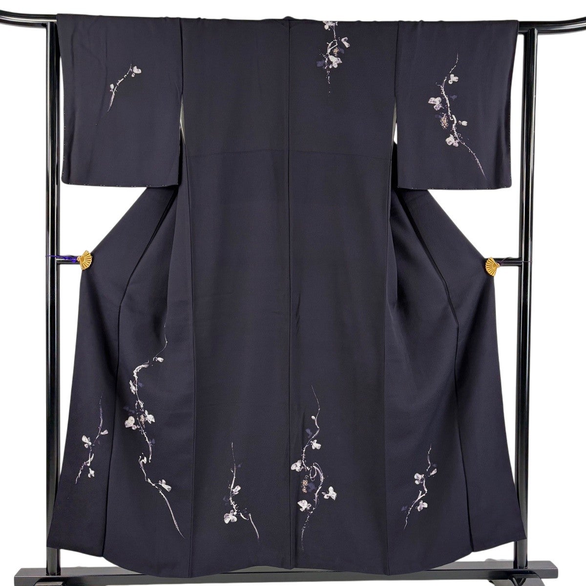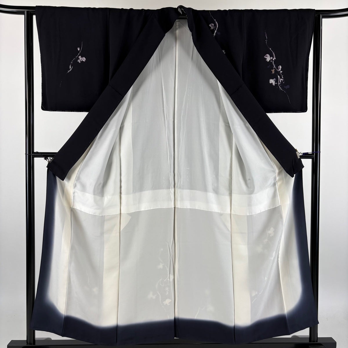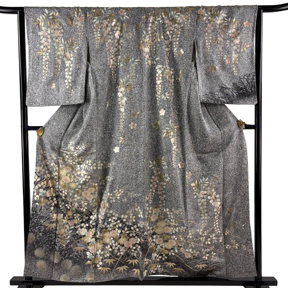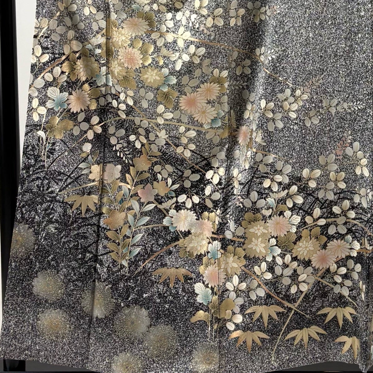 付下げ 身丈169.5cm 裄丈70.5cm L 袷 草花 地紋 刺繍 金糸 黒 正絹 秀品