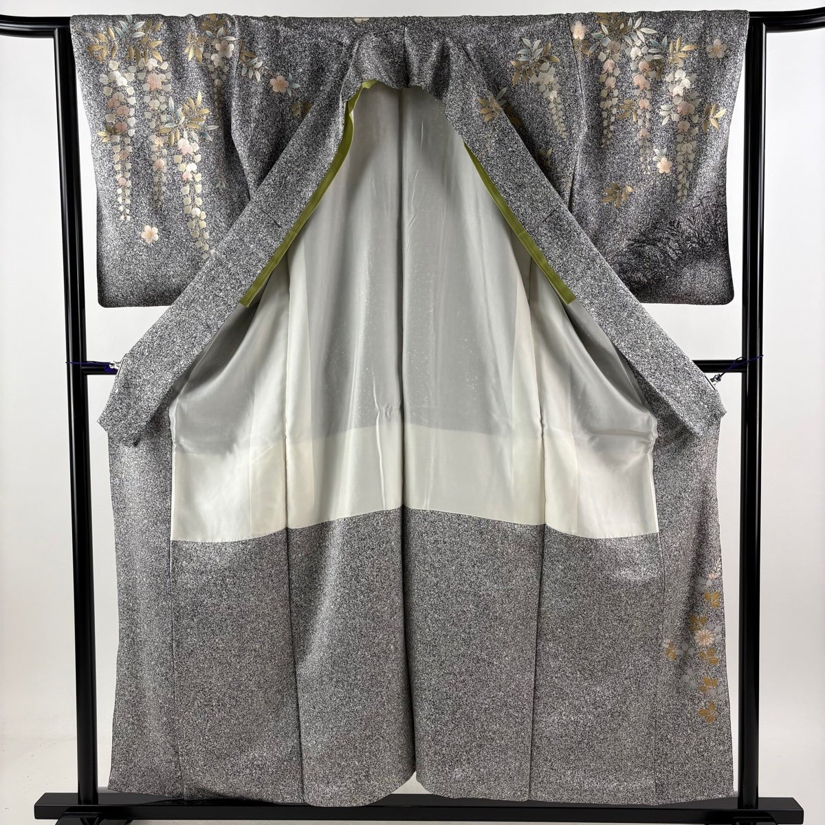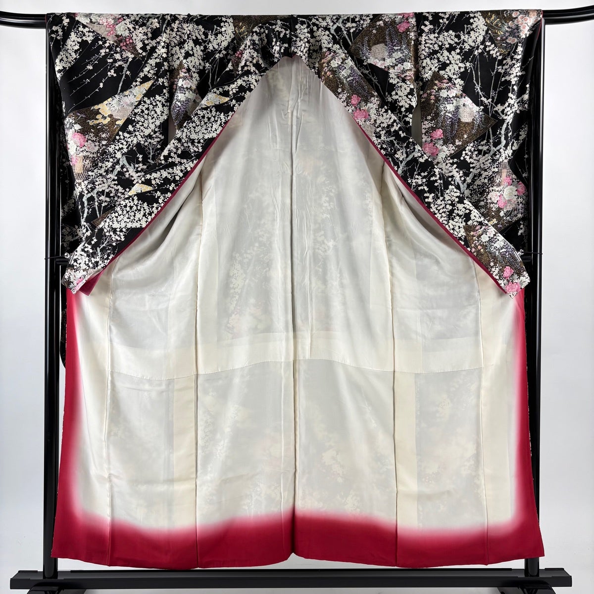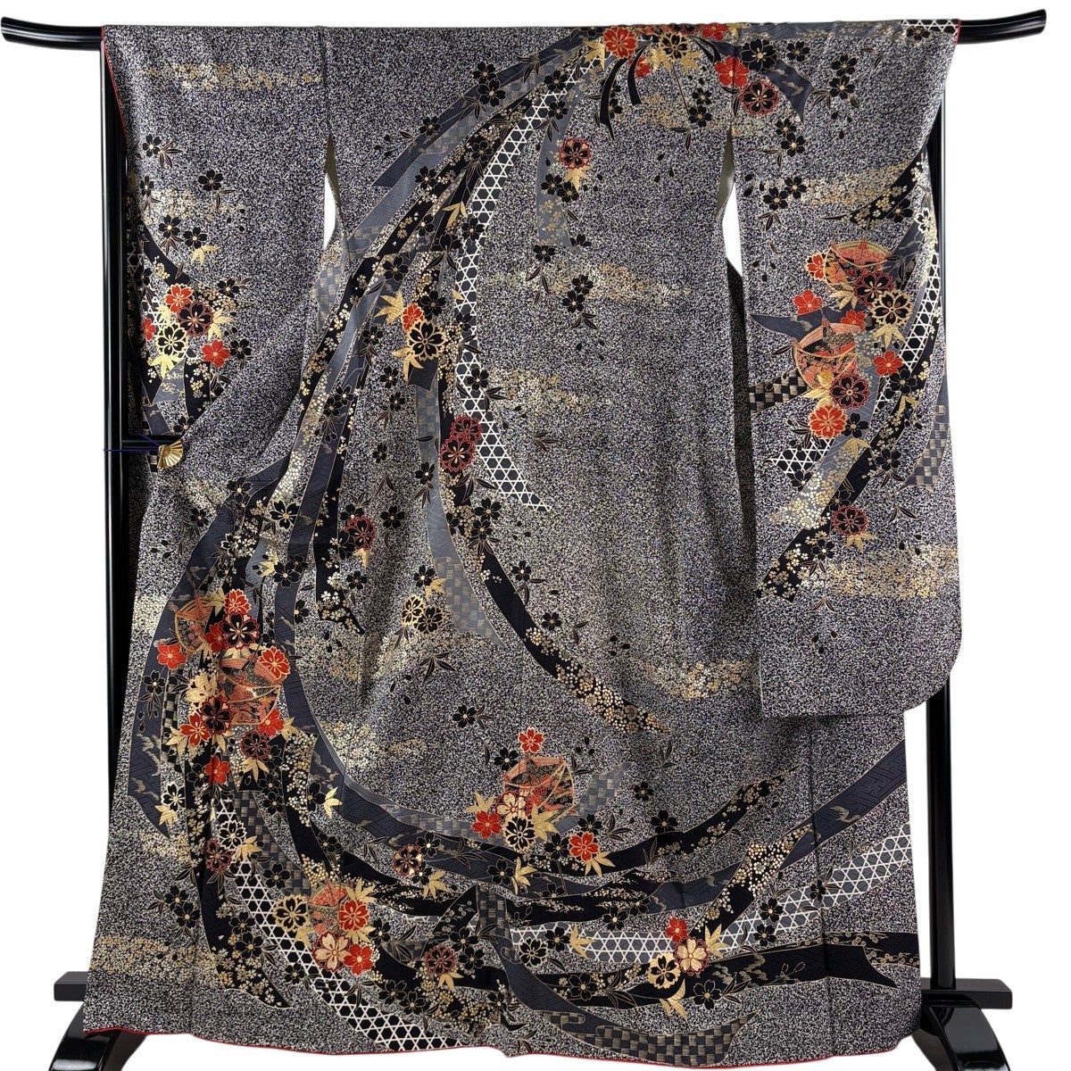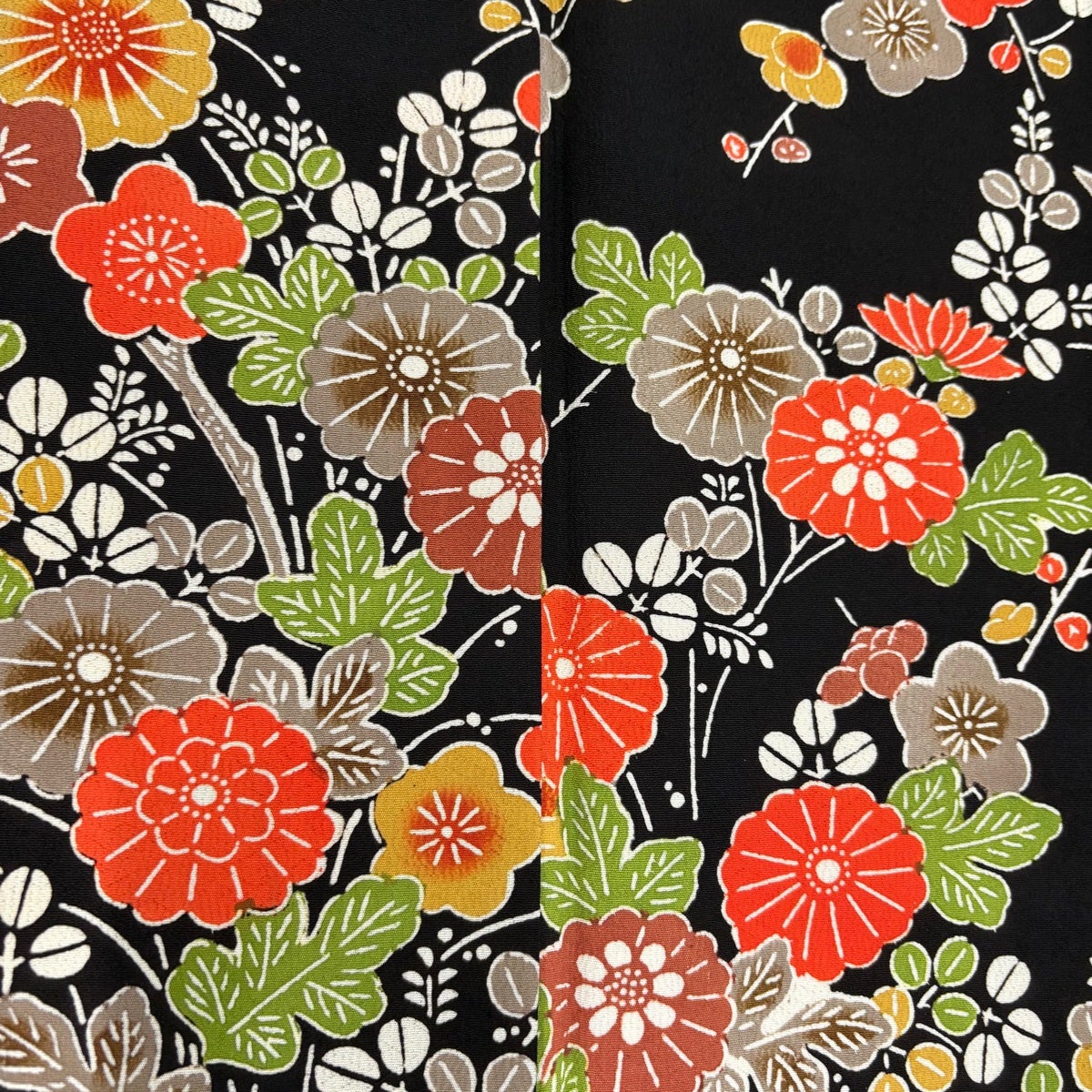 振袖 身丈162cm 裄丈65.5cm M 袷 御所車 草花 金彩 絞り 黒 正絹 名品