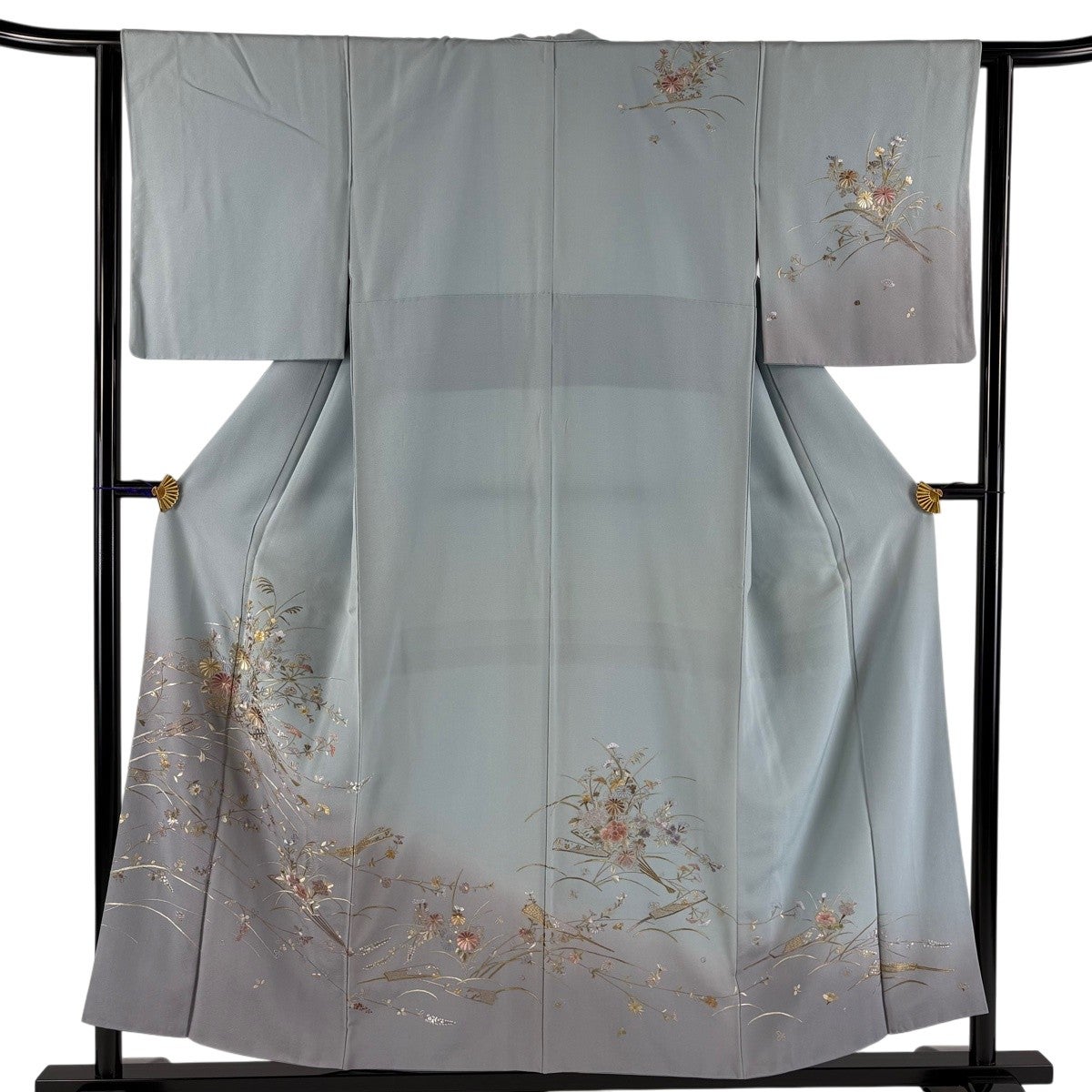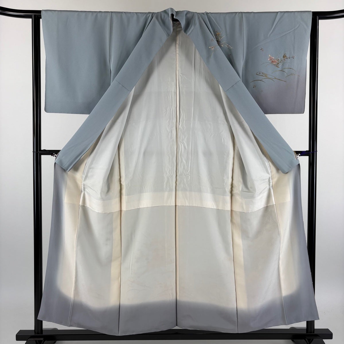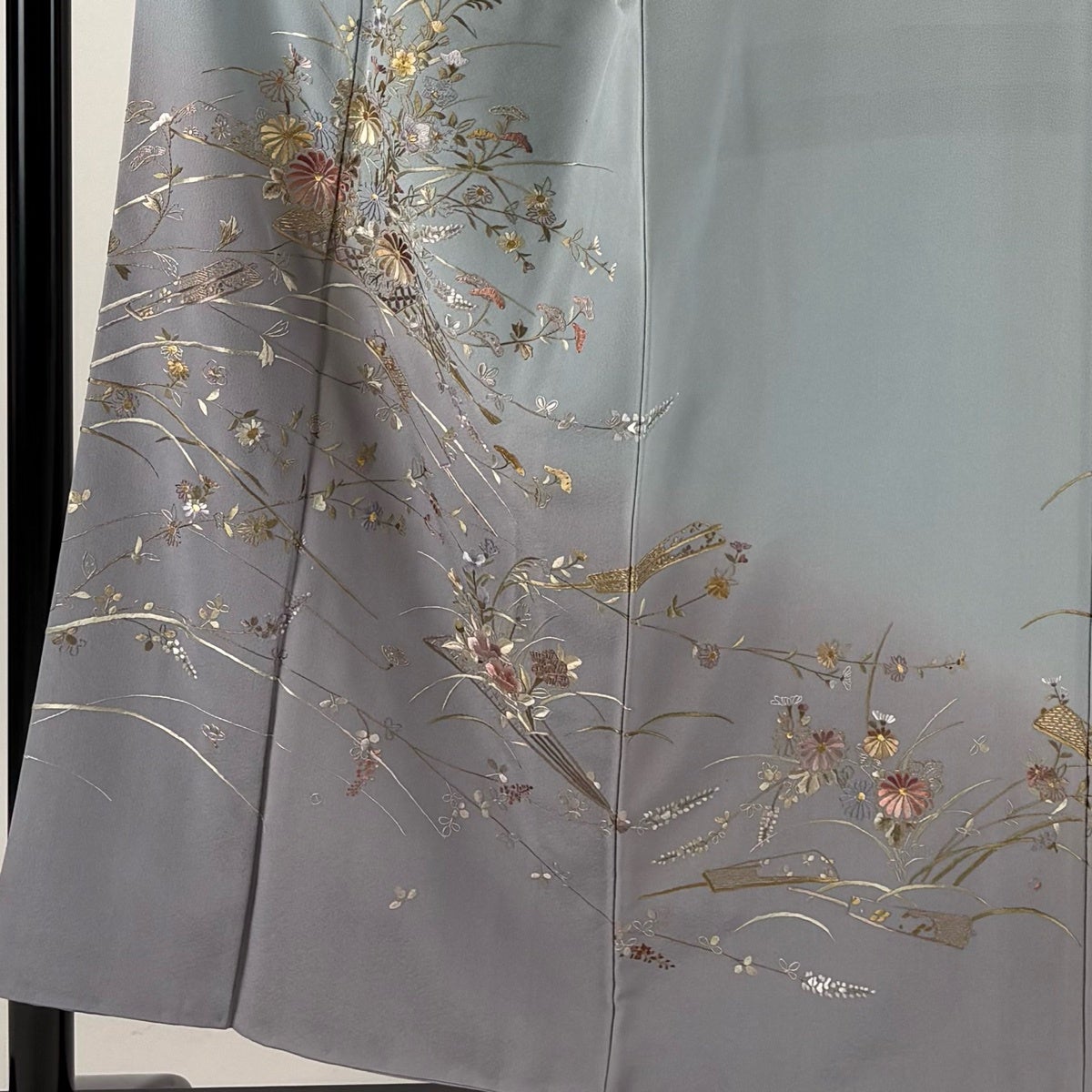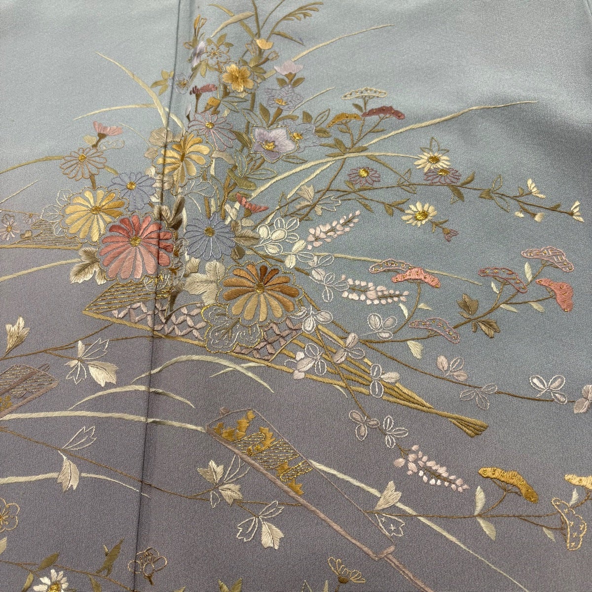 訪問着 身丈164cm 裄丈66cm M 袷 草花 動物 刺繍 金糸 青灰色 正絹 秀品