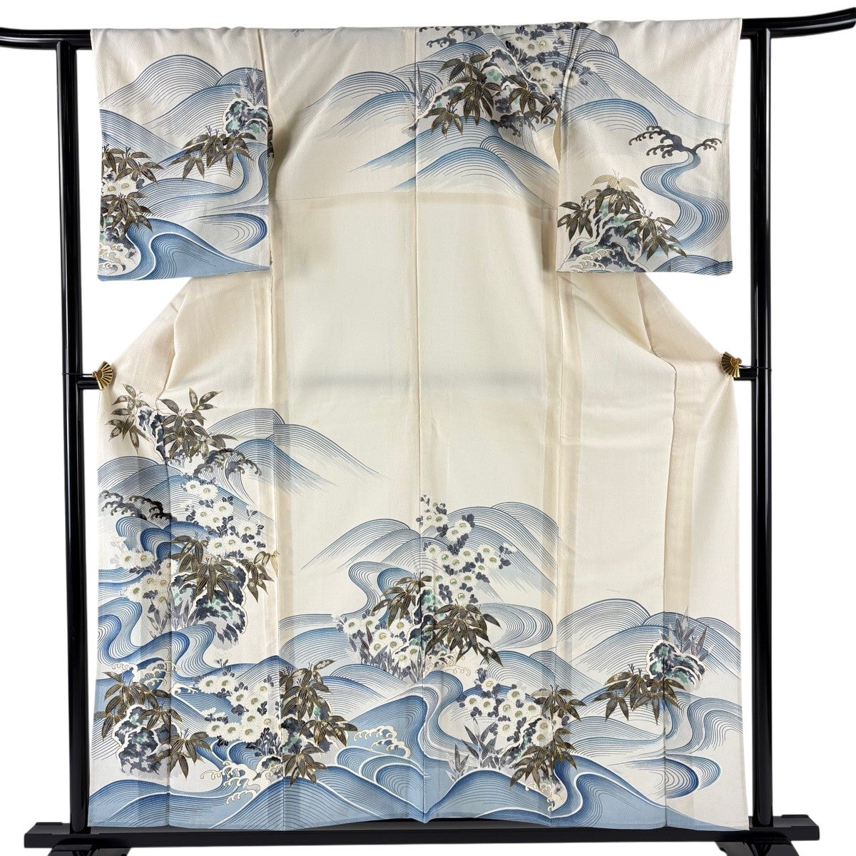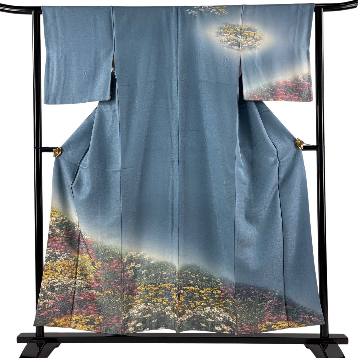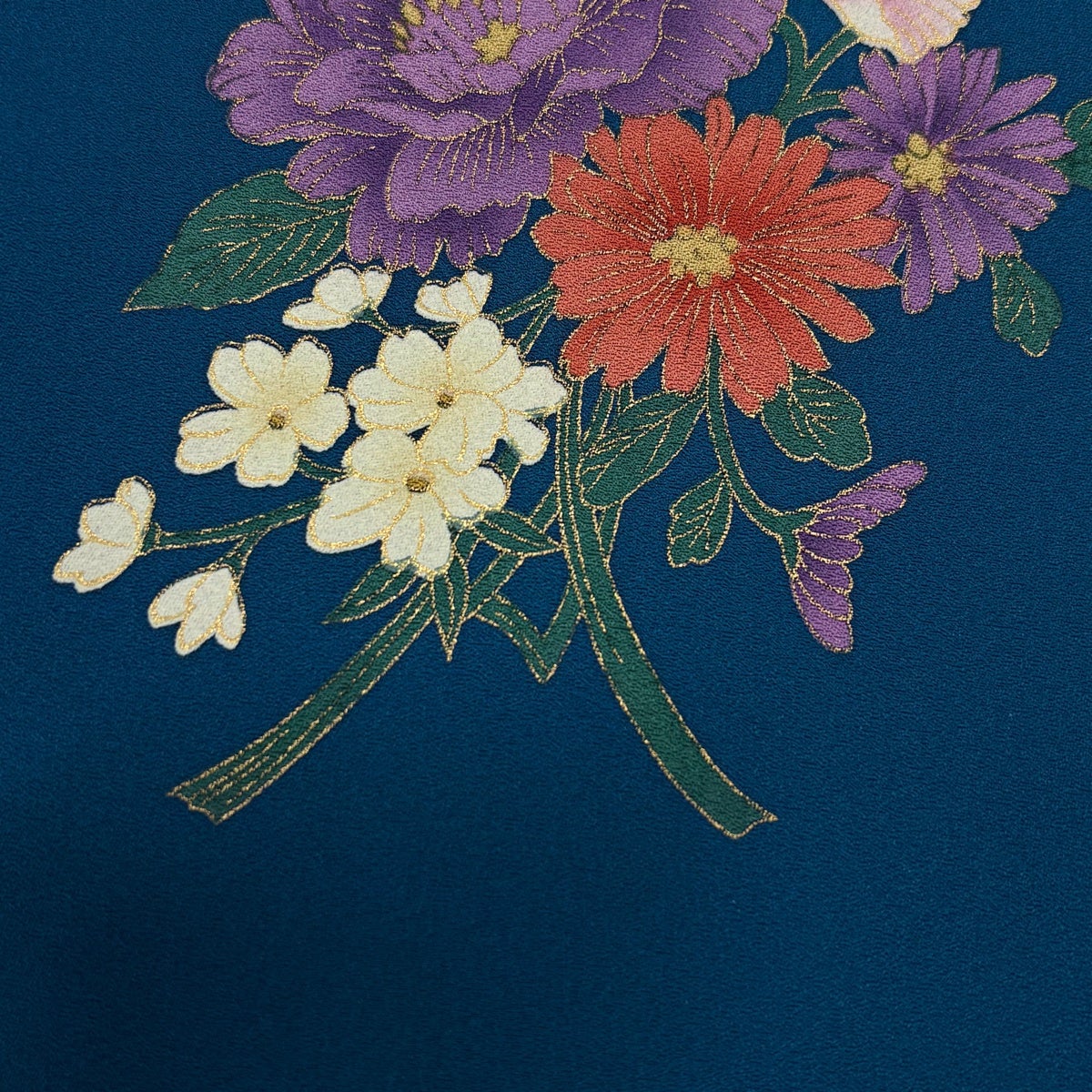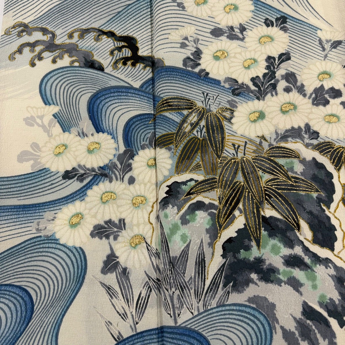 訪問着 身丈164cm 裄丈66cm M 袷 草花 動物 刺繍 金糸 青灰色 正絹 秀品