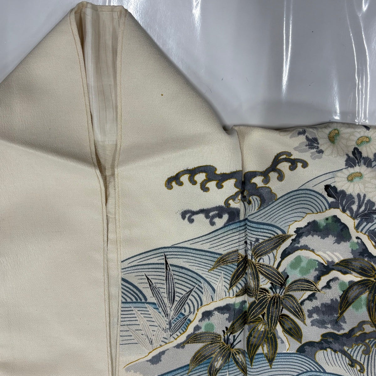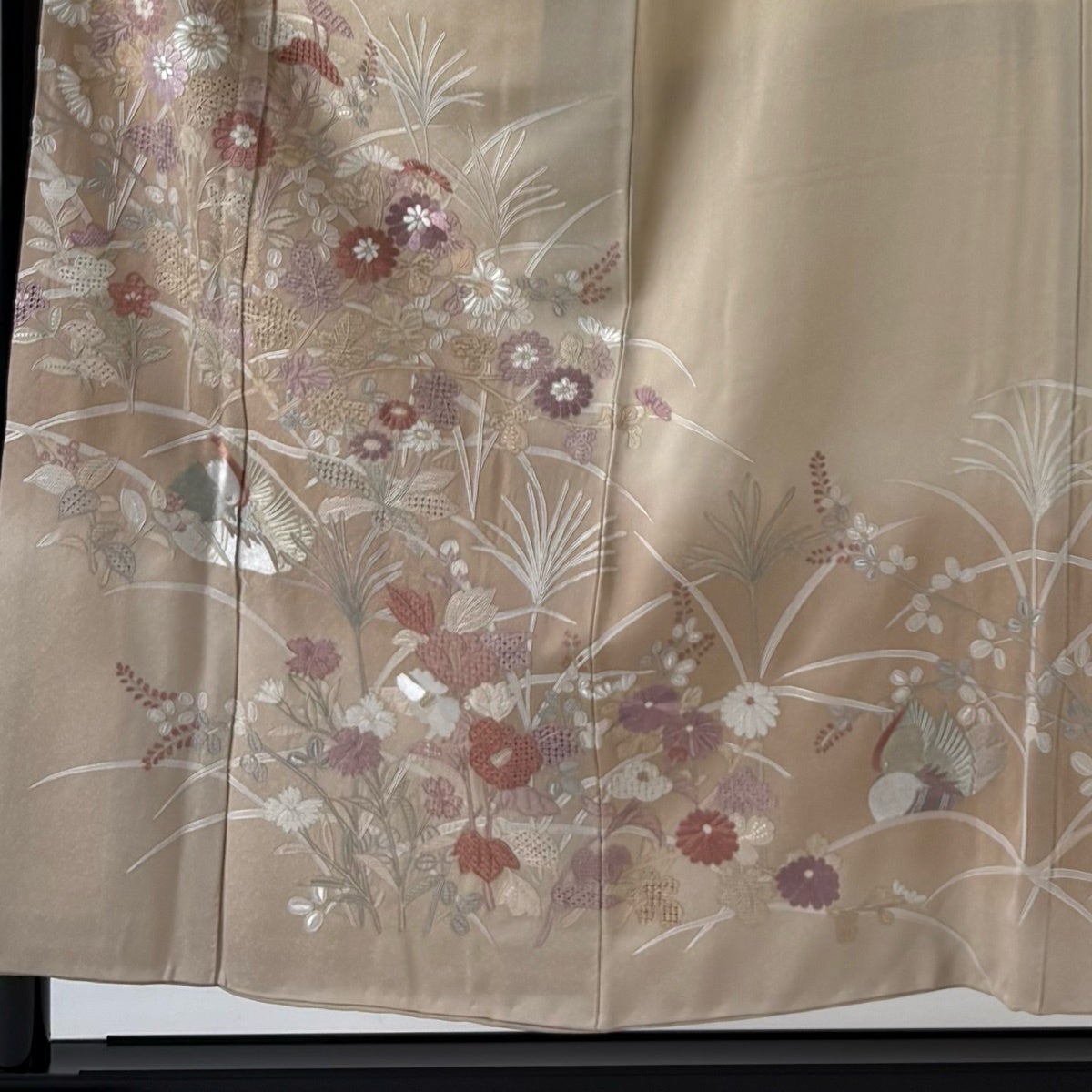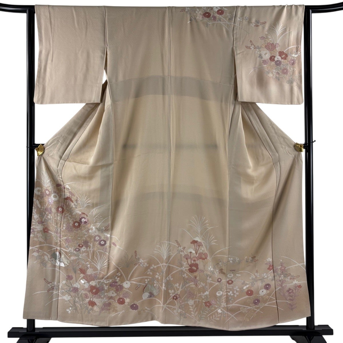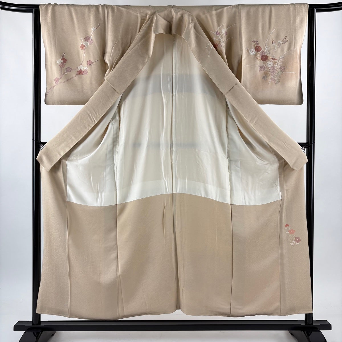 付下げ 身丈159cm 裄丈64.5cm M 袷 束ね熨斗 梅 箔 刺繍 ベージュ 正絹 秀品
