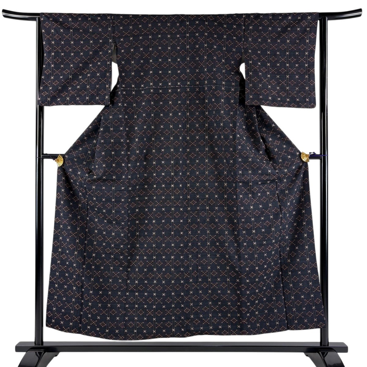 【美品】 小紋 身丈158.5cm 裄丈66.5cm M 袷 紬地 幾何学模様 焦茶色 正絹 秀品