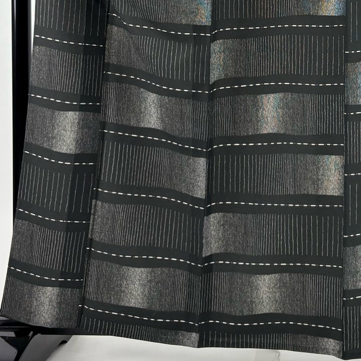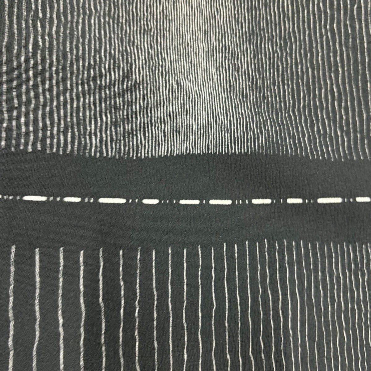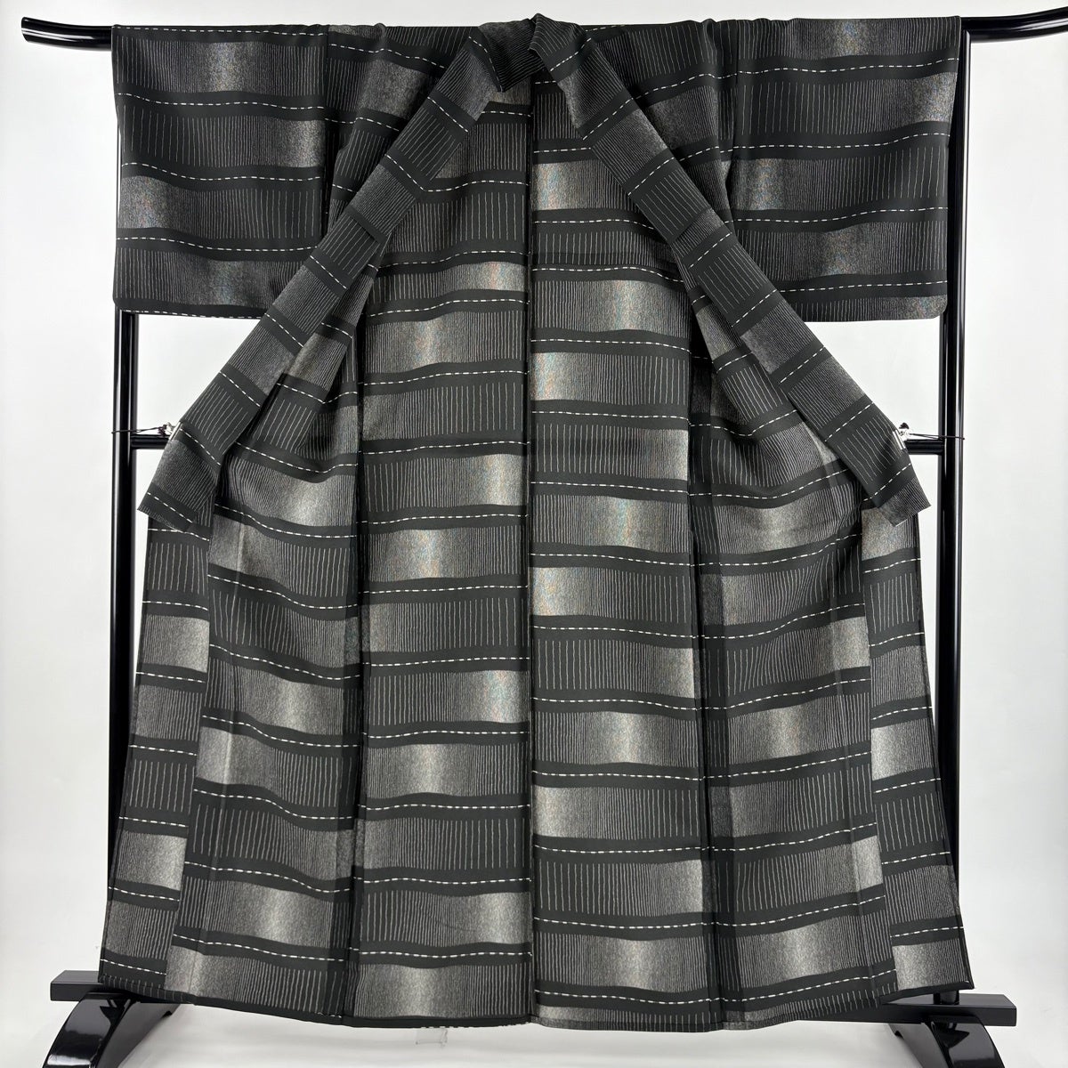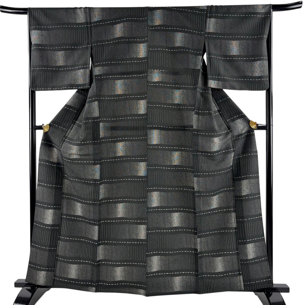 【美品】 紬 身丈154.5cm 裄丈63.5cm S 袷 花織 縦縞 幾何学模様 黒灰 正絹 逸品