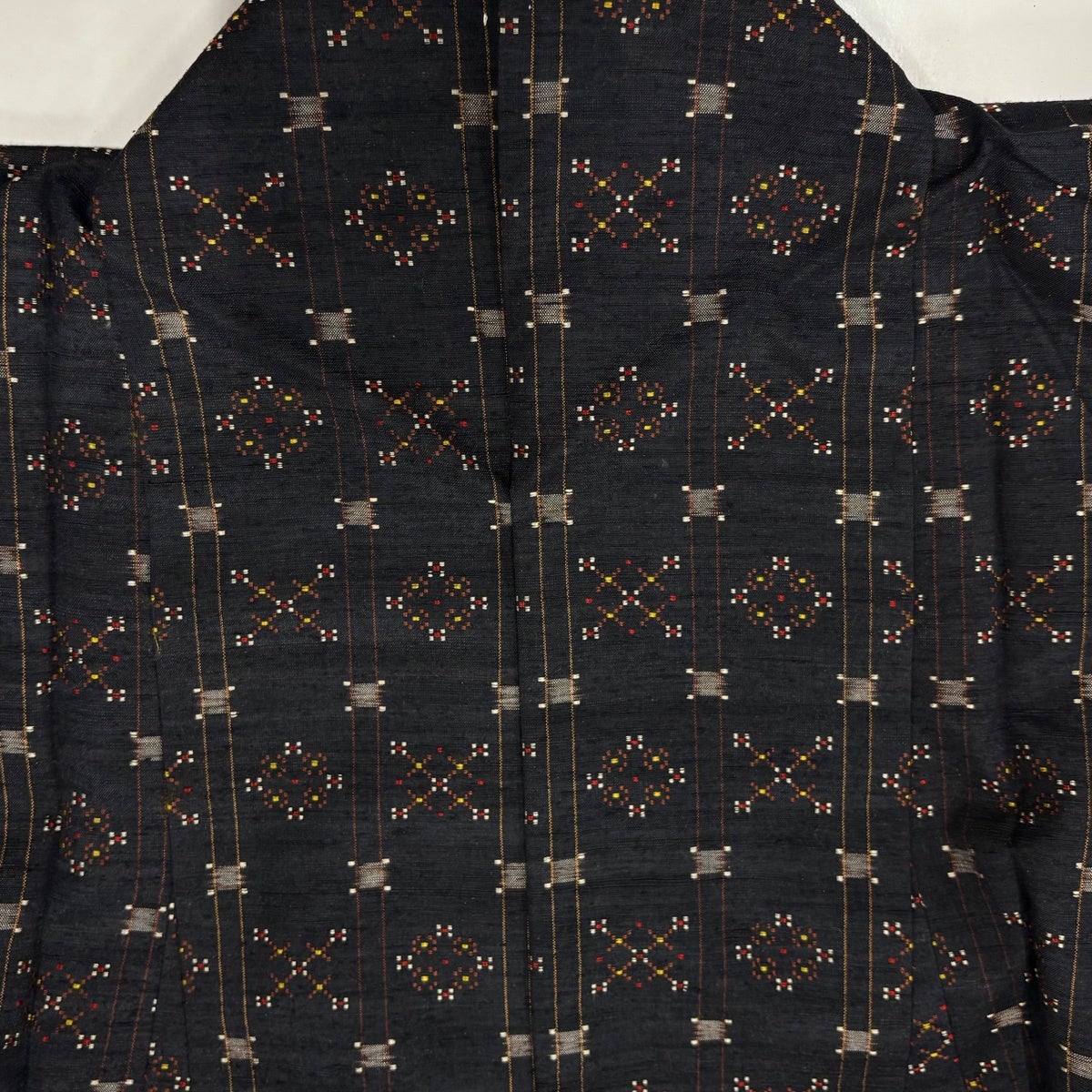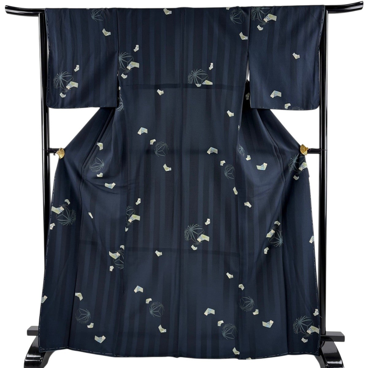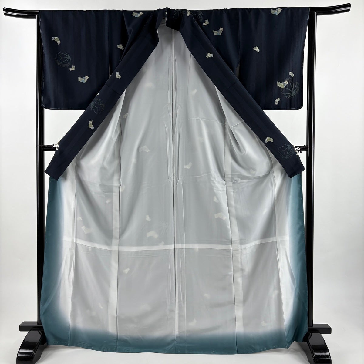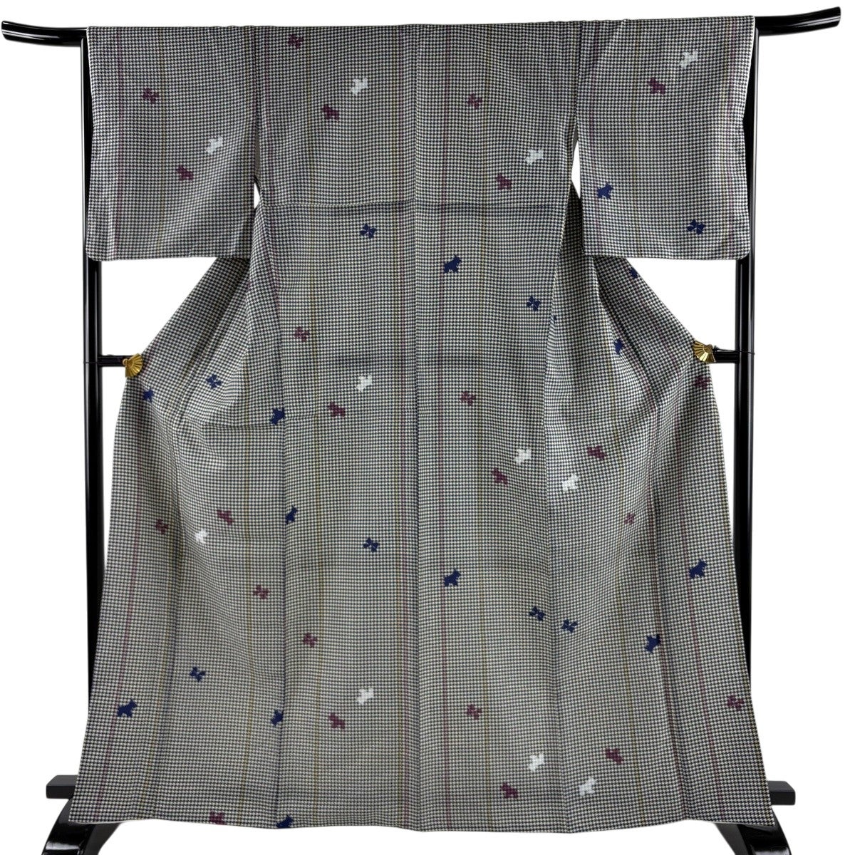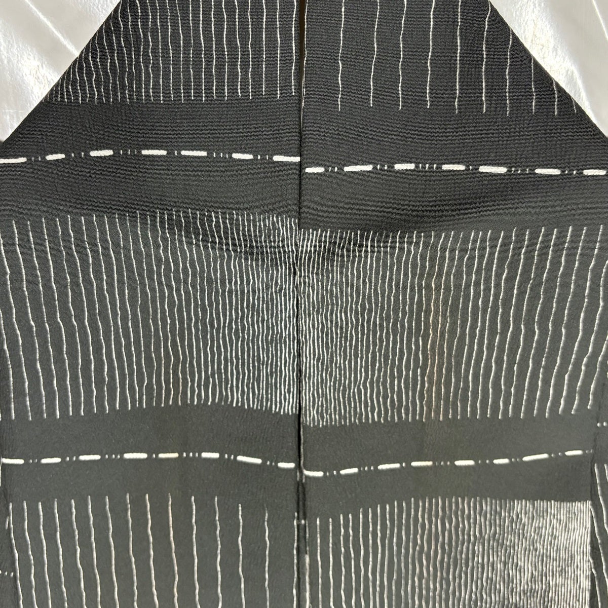 【美品】 紬 身丈154.5cm 裄丈63.5cm S 袷 花織 縦縞 幾何学模様 黒灰 正絹 逸品