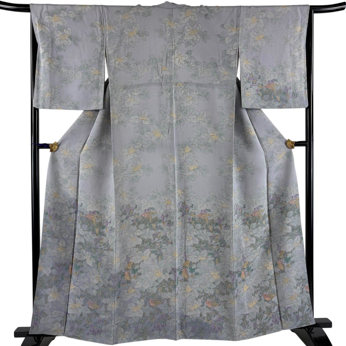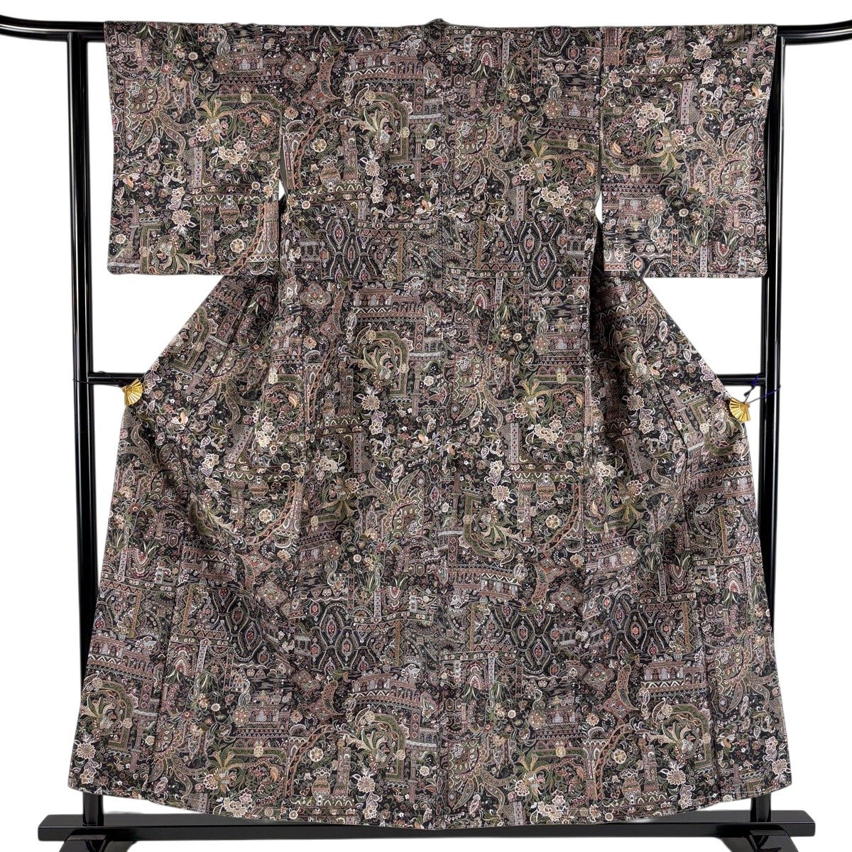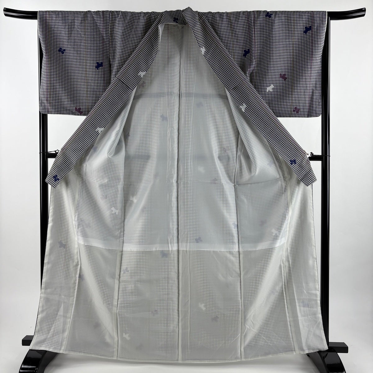 【美品】 小紋 身丈156.5cm 裄丈63cm S 袷 ますいわ屋 鳥 草花 刺繍 墨色 正絹 逸品