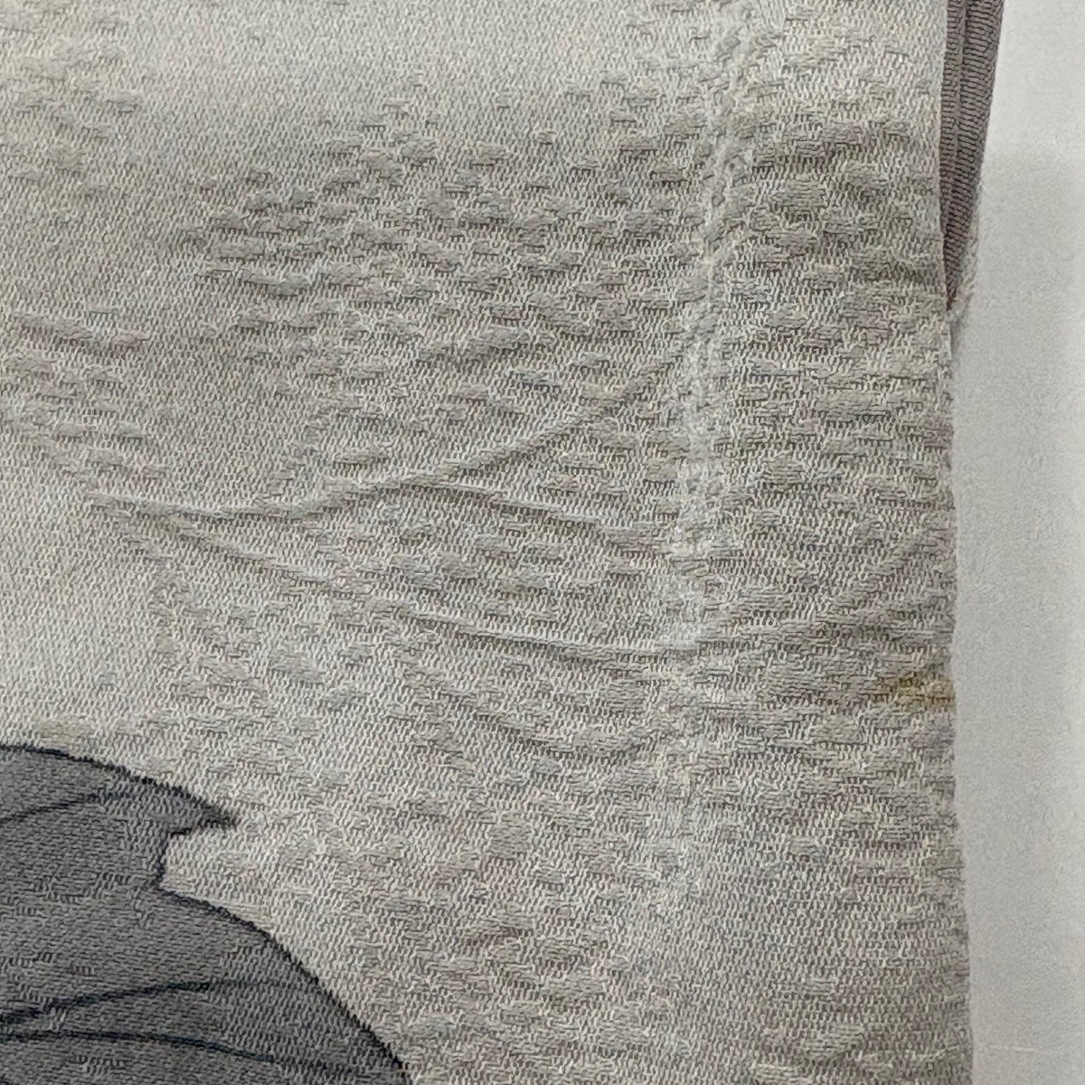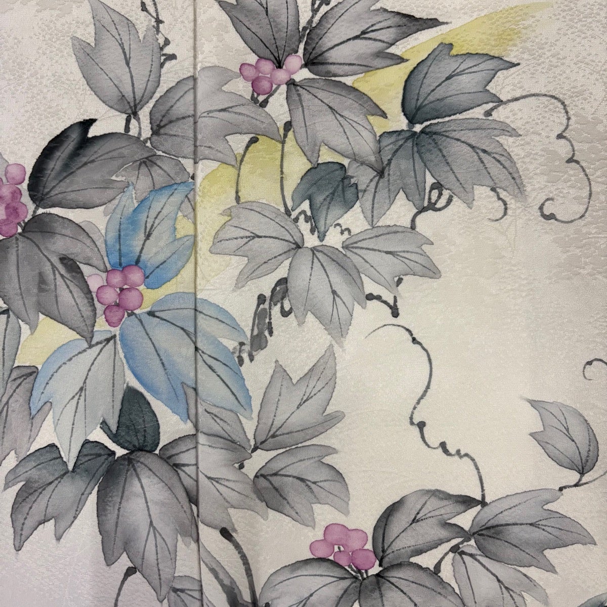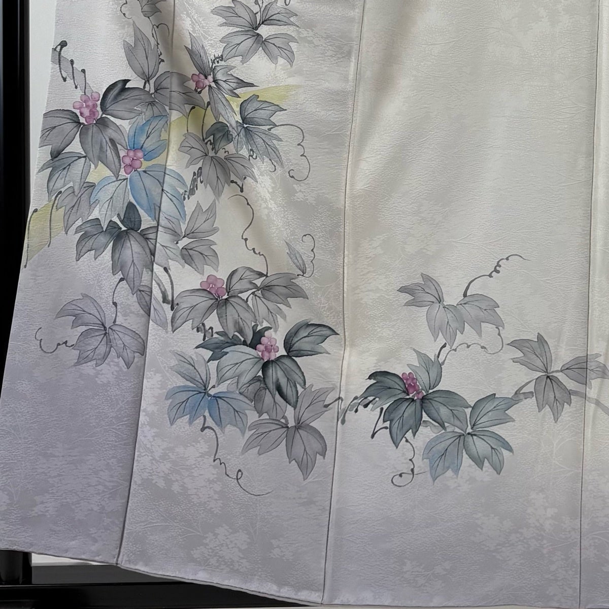 付下げ 身丈160.5cm 裄丈65cm M 袷 葉と実 鳥 縮緬 灰色 正絹 秀品