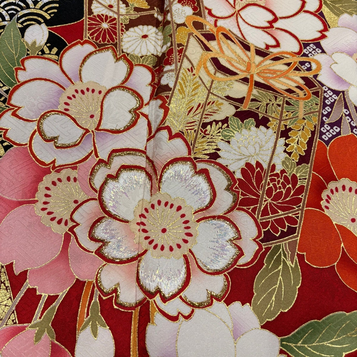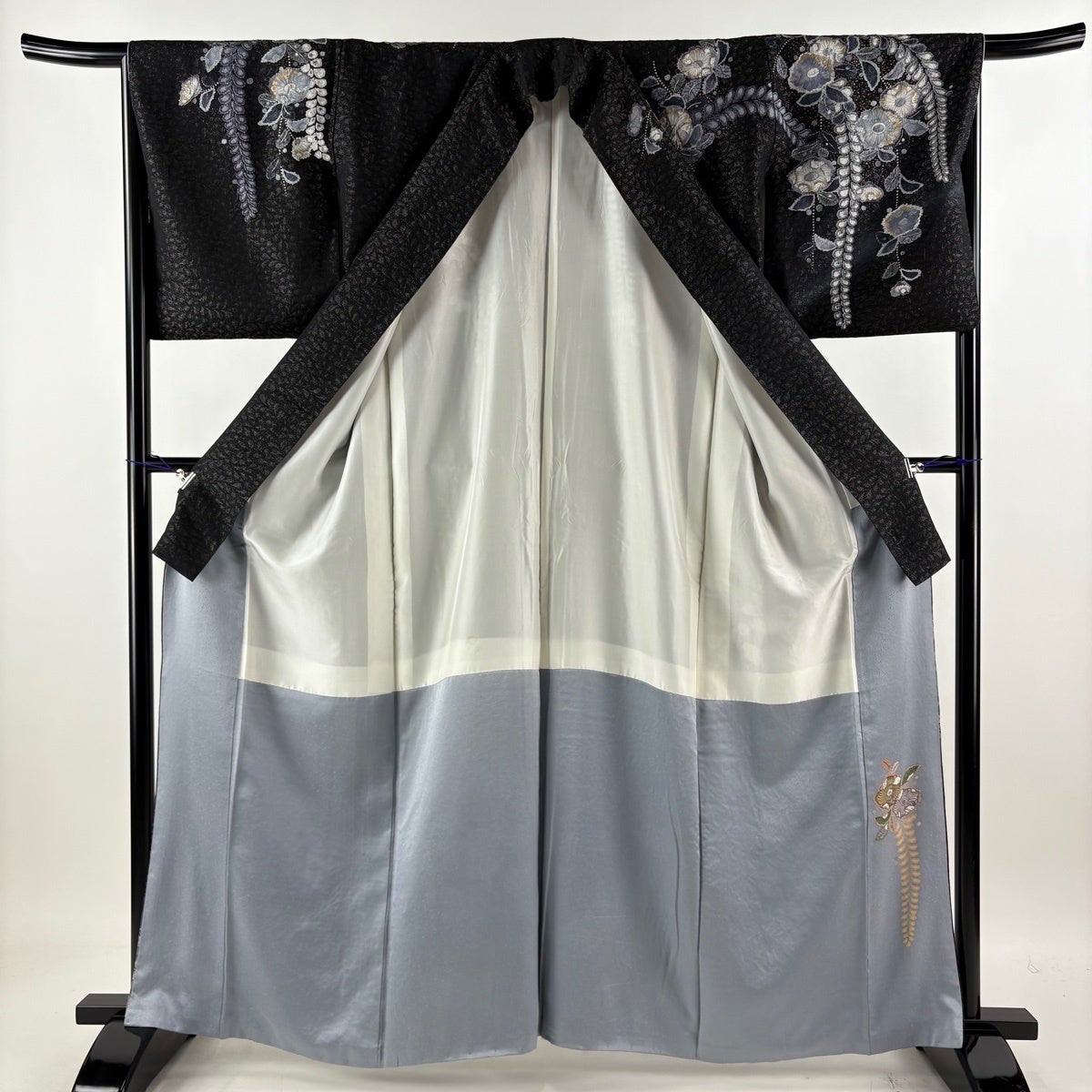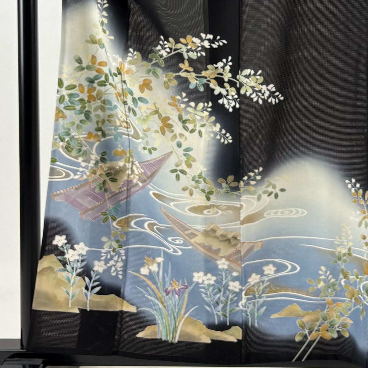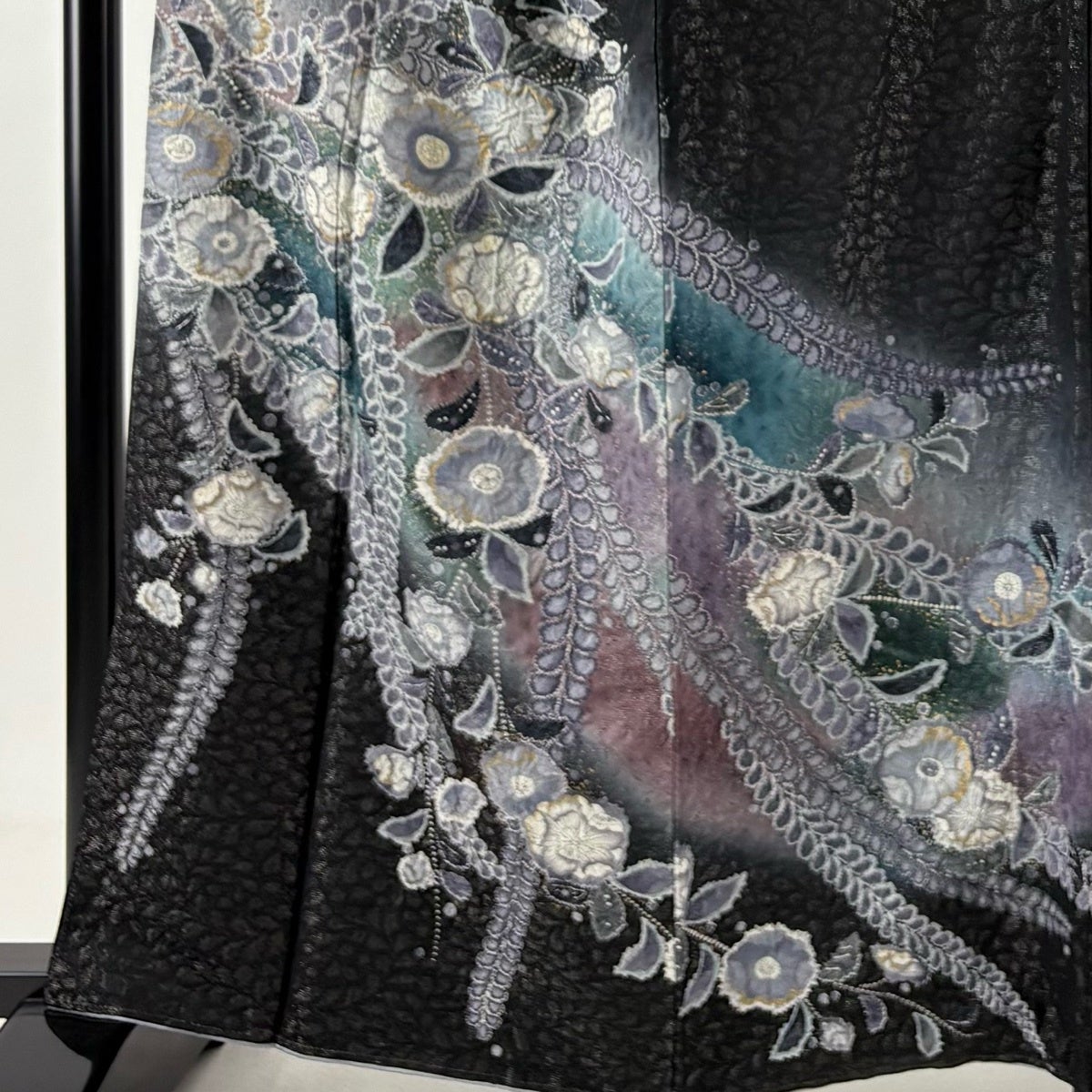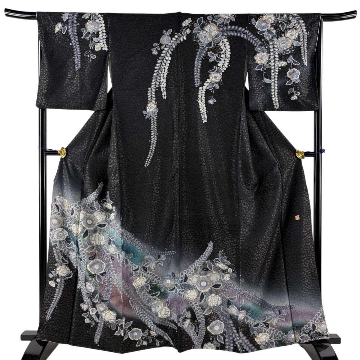 振袖 身丈156cm 裄丈63.5cm S 袷 草花 青海波 総絞り 黒 正絹 名品