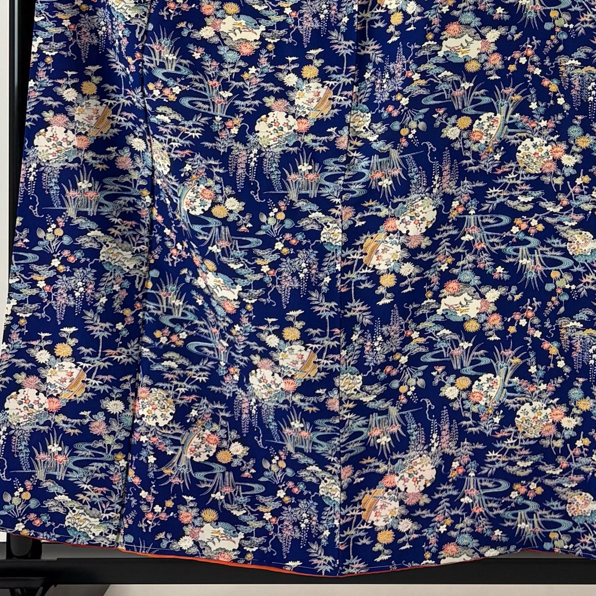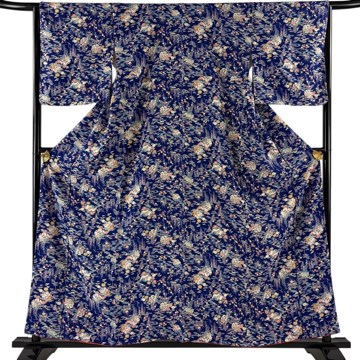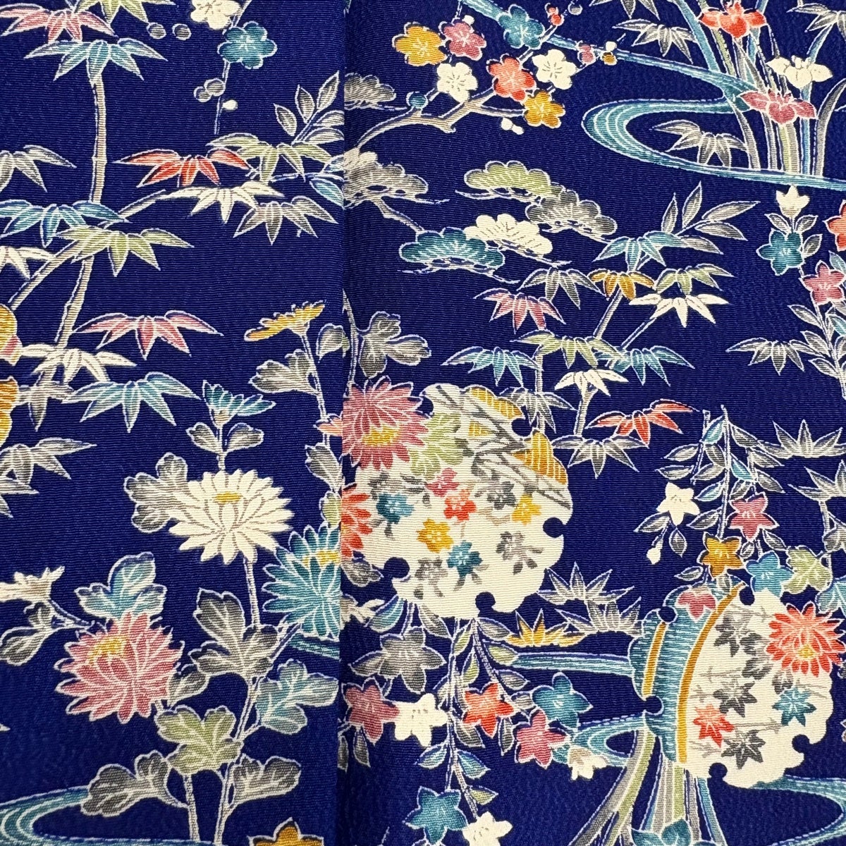 【美品】 小紋 身丈158cm 裄丈66cm M 袷 流水 草花 クリーム 正絹 名品