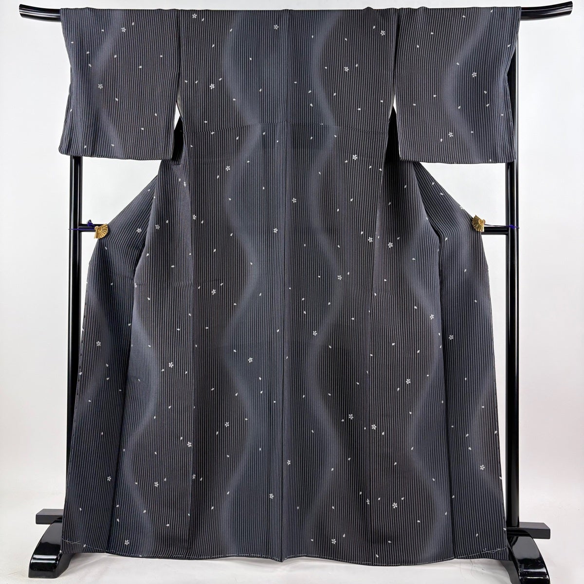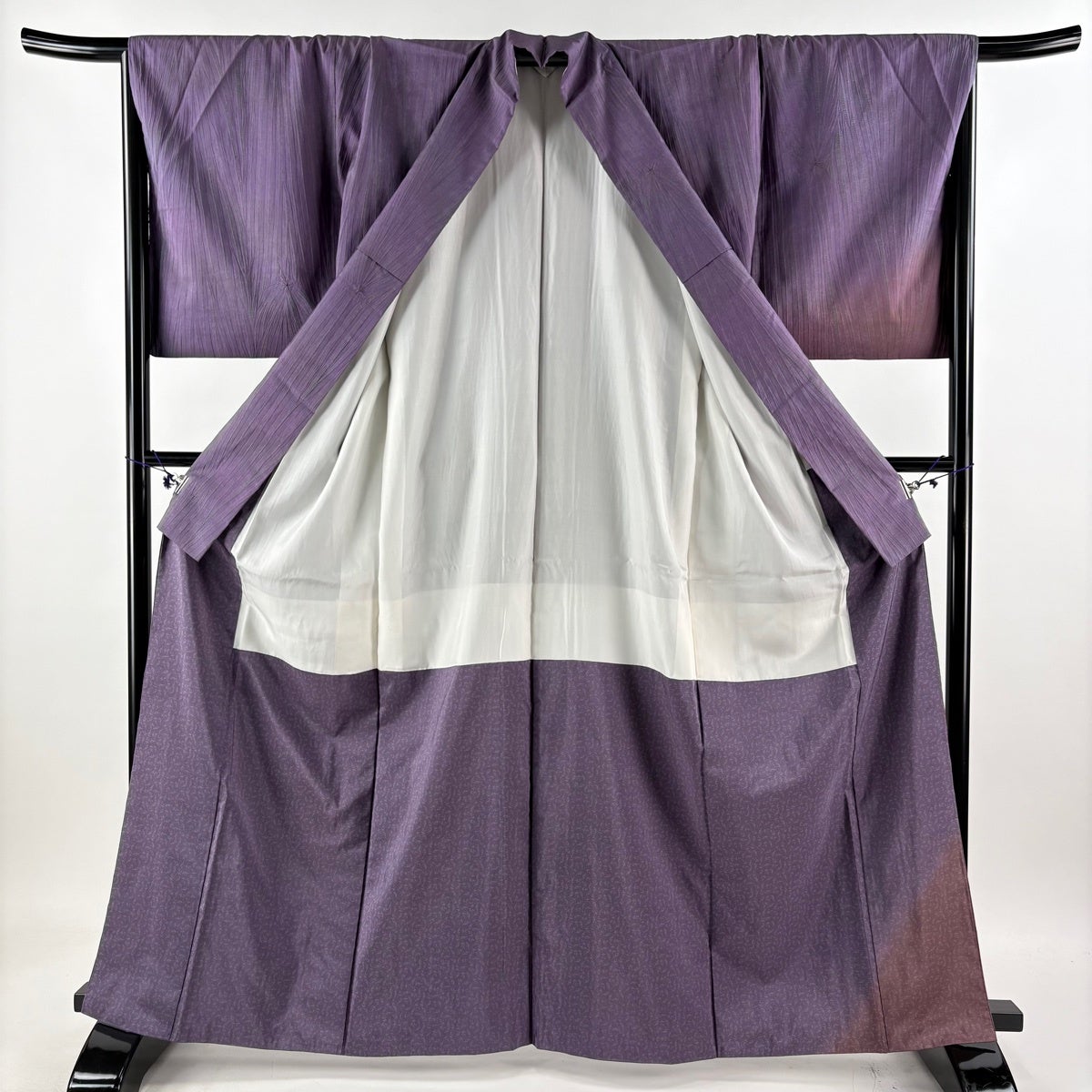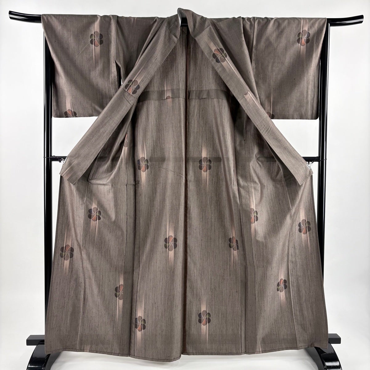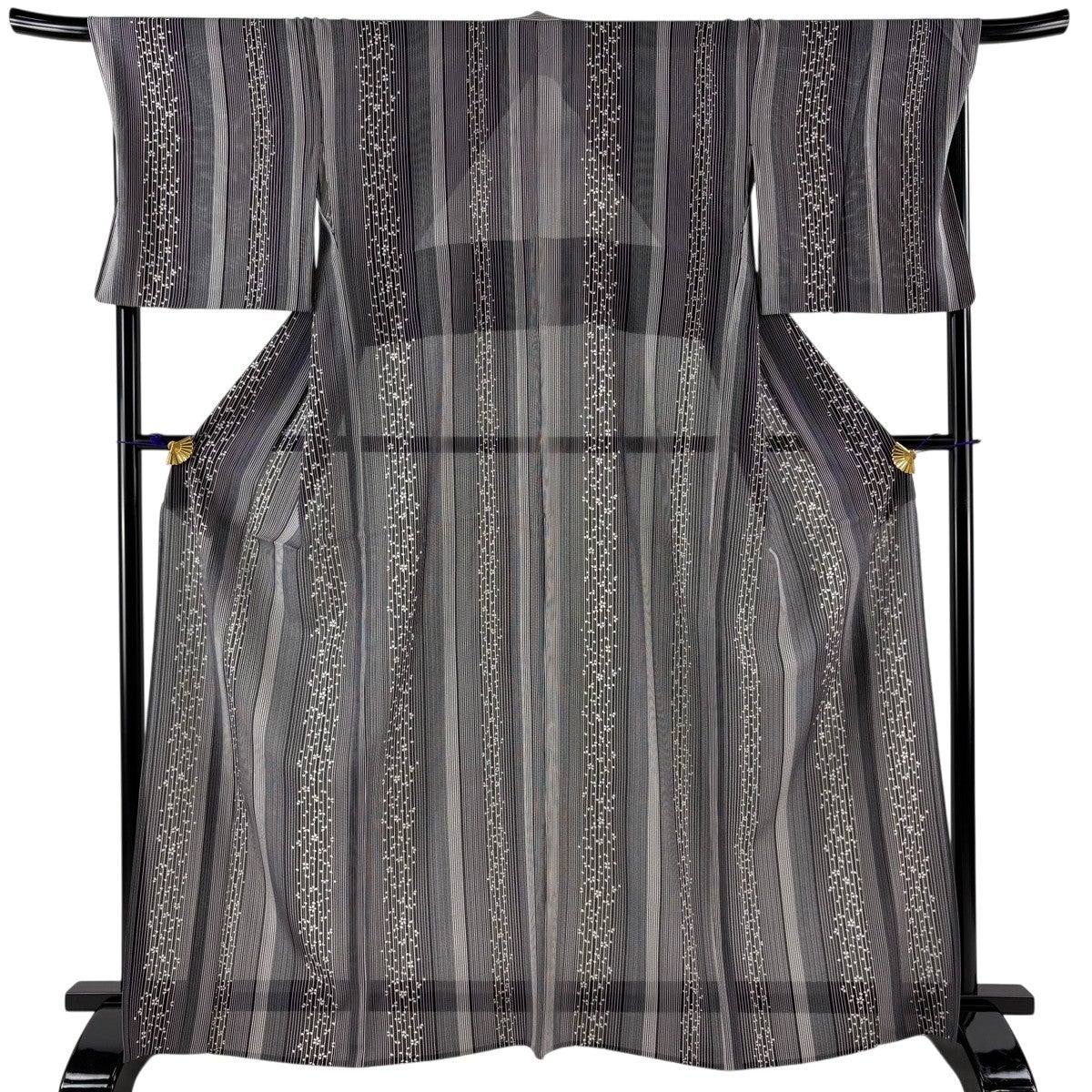 【美品】 小紋 身丈166.5cm 裄丈69cm L 薄物 絽 縦縞 花びら 灰紫 正絹 秀品