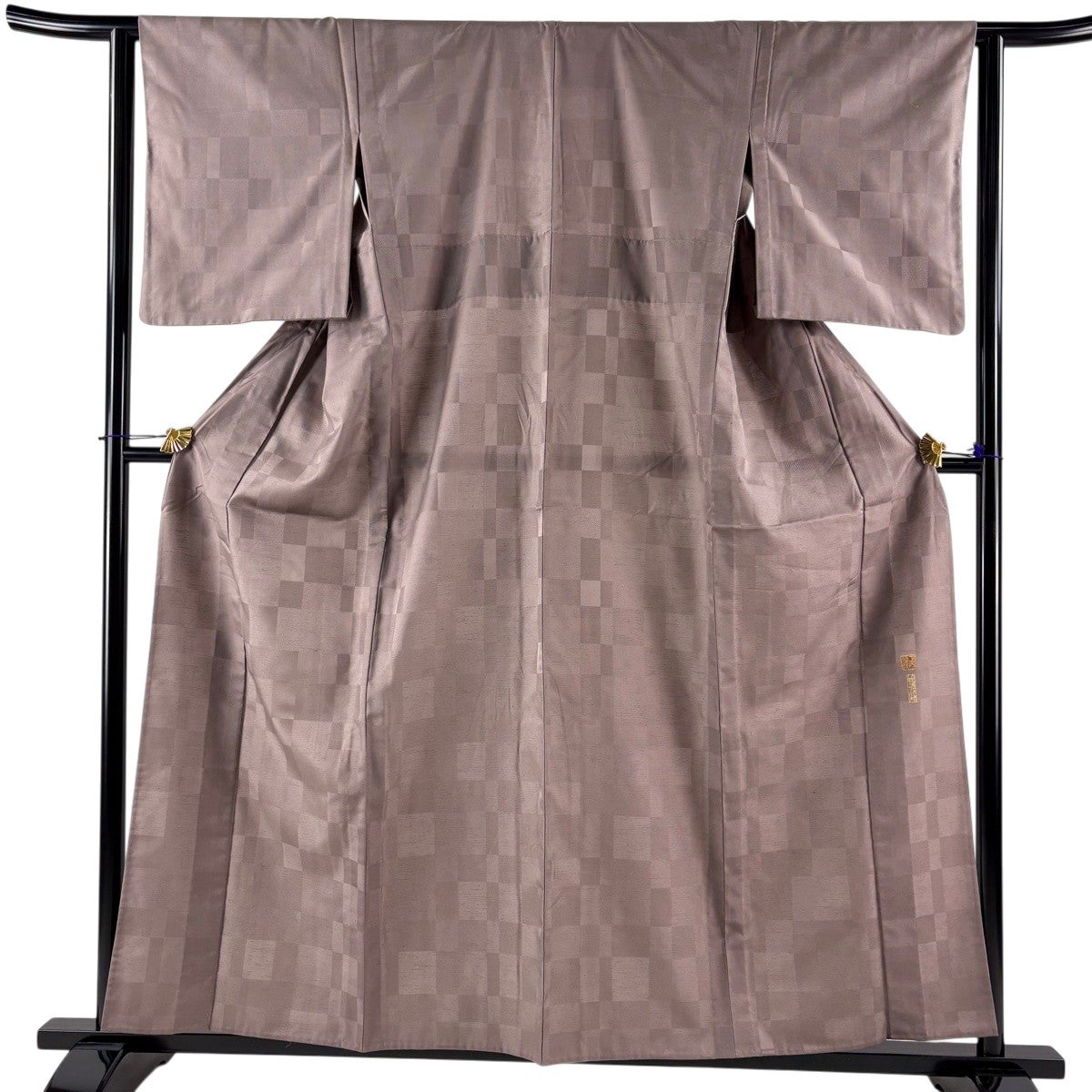 紬 身丈159cm 裄丈63cm S 単衣 落款あり 変わり市松 縞 灰紫 正絹 秀品