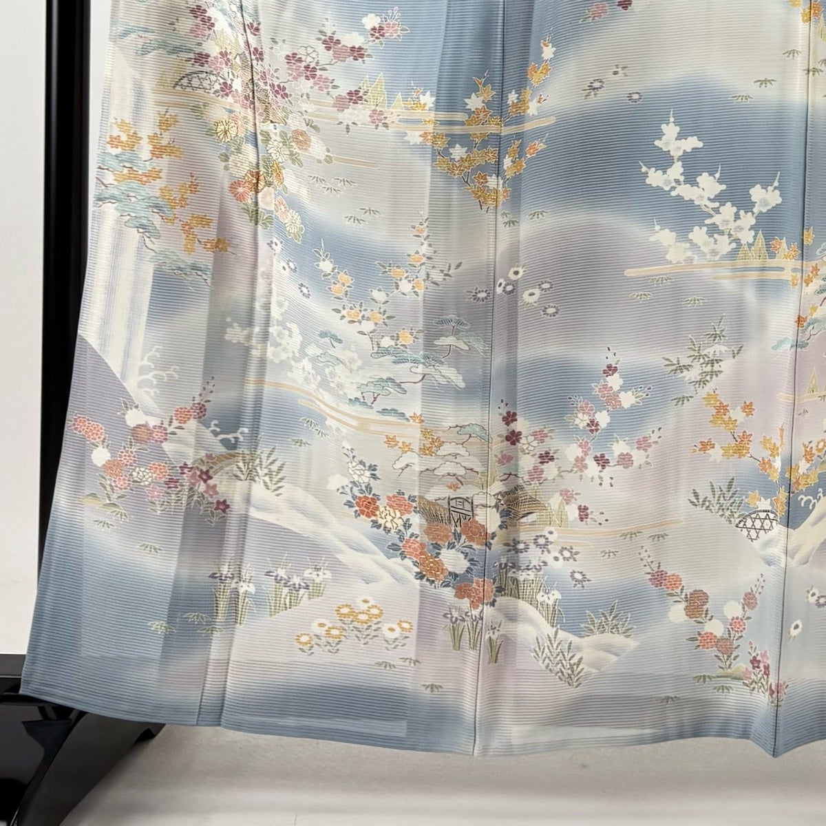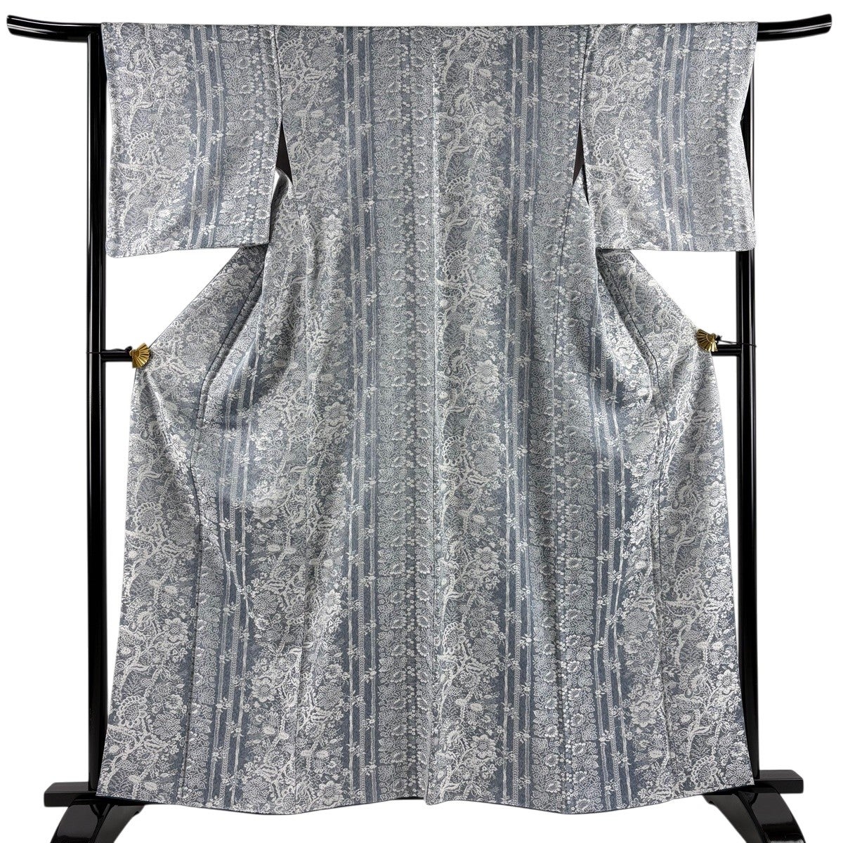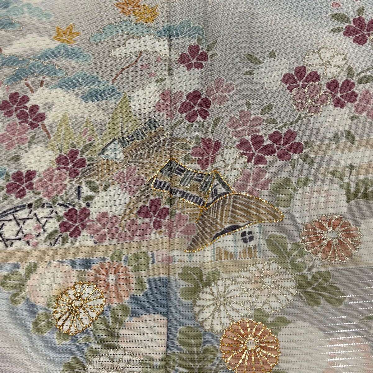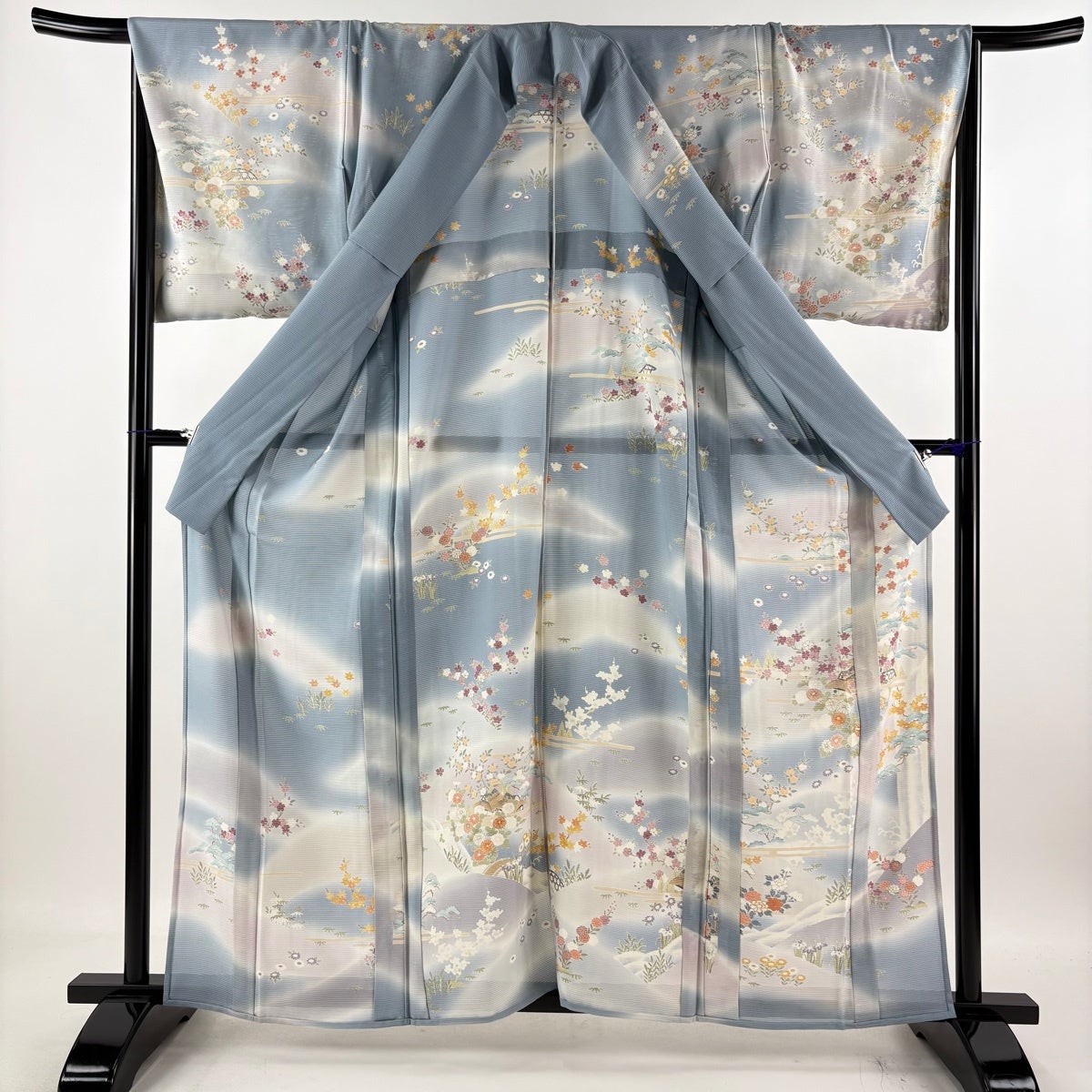 訪問着 身丈161cm 裄丈67cm M 薄物 絽 松竹梅 草花 金糸 金銀彩 青灰色 正絹 秀品