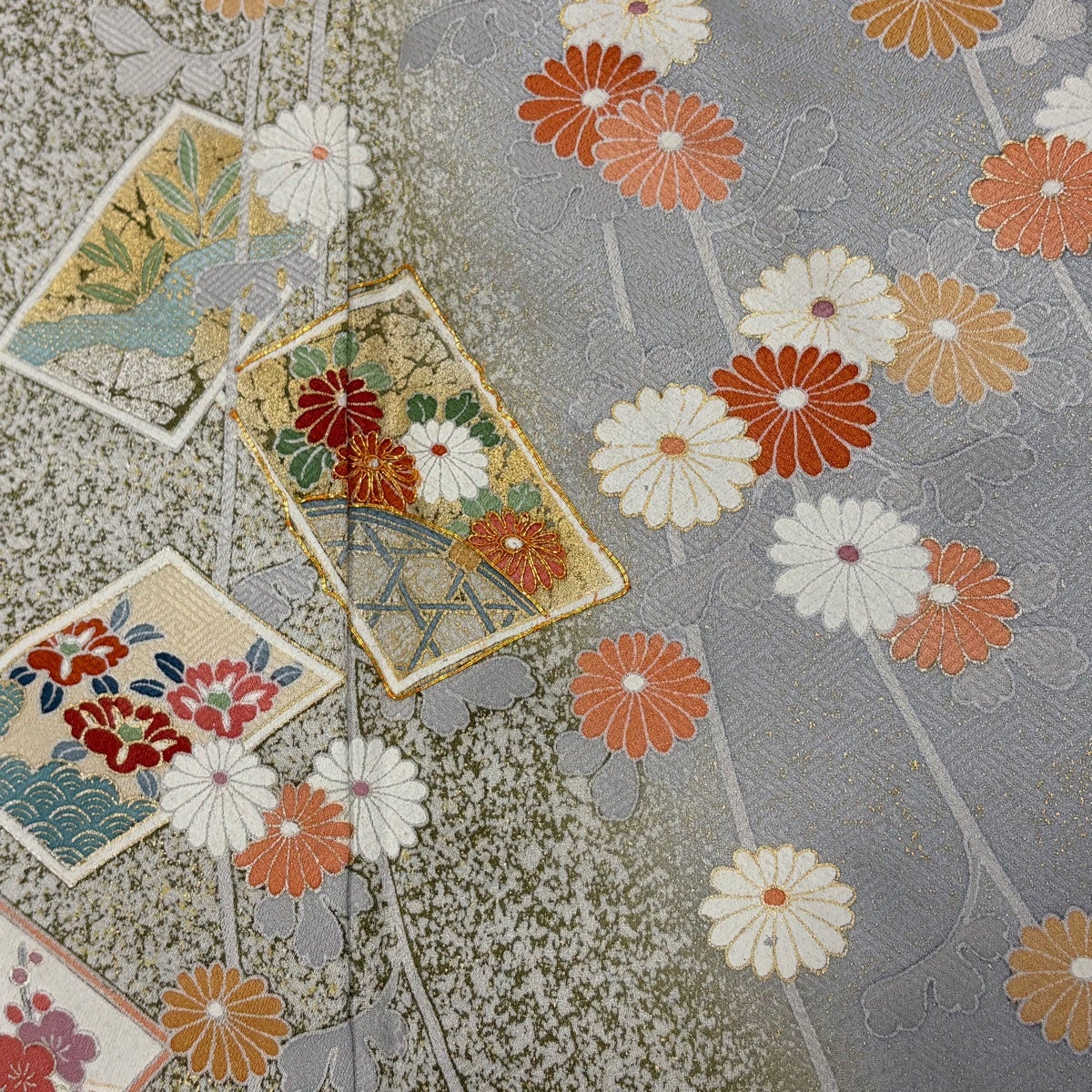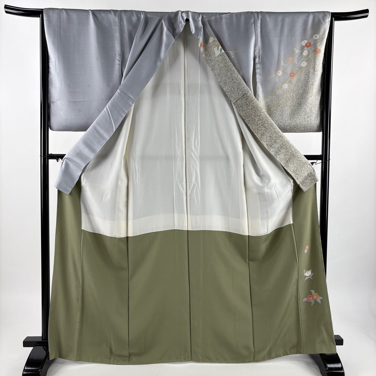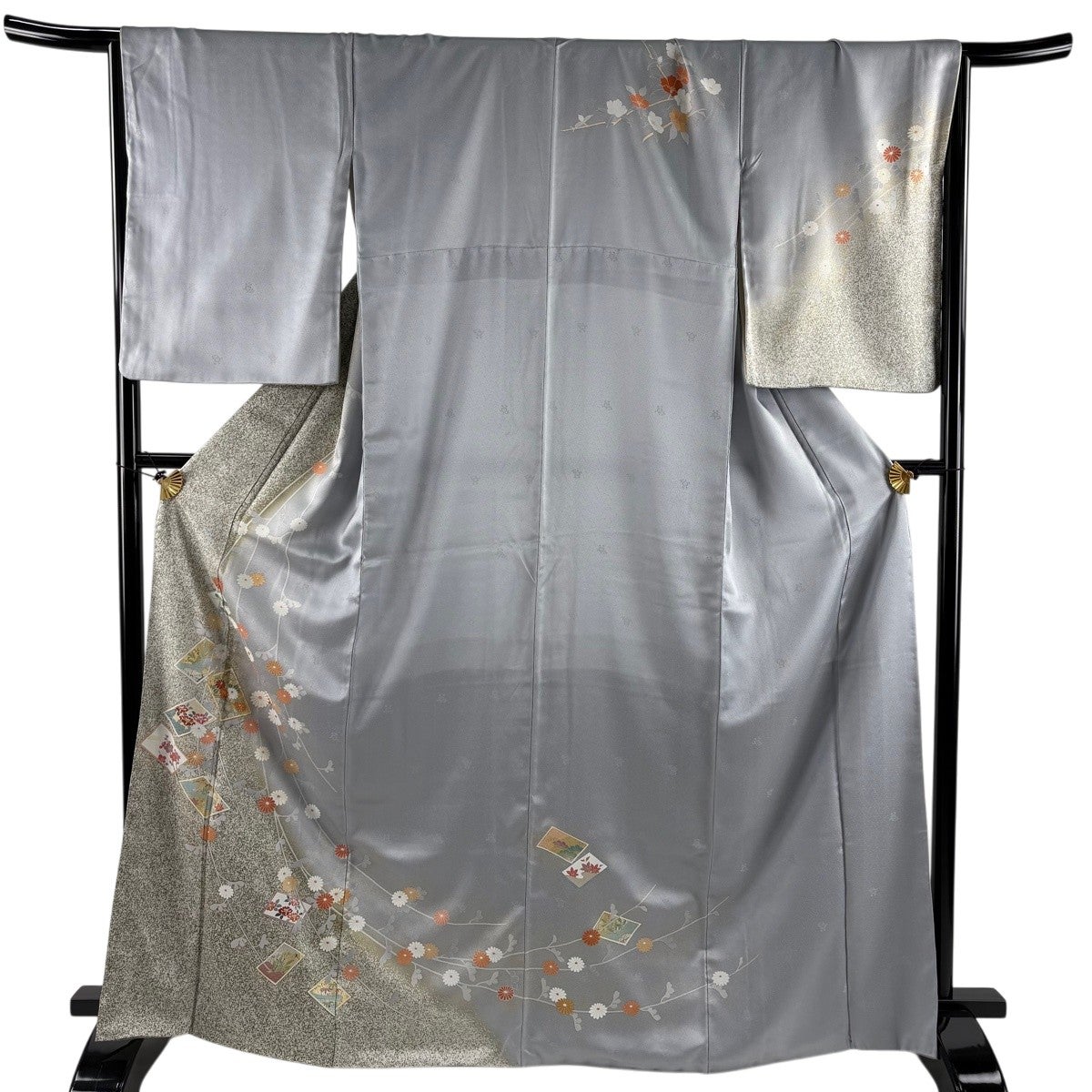 付下げ 身丈168cm 裄丈67cm M 薄物 夏紬地 秋草 光悦垣 刺繍 金糸 灰色 正絹 秀品 一つ紋