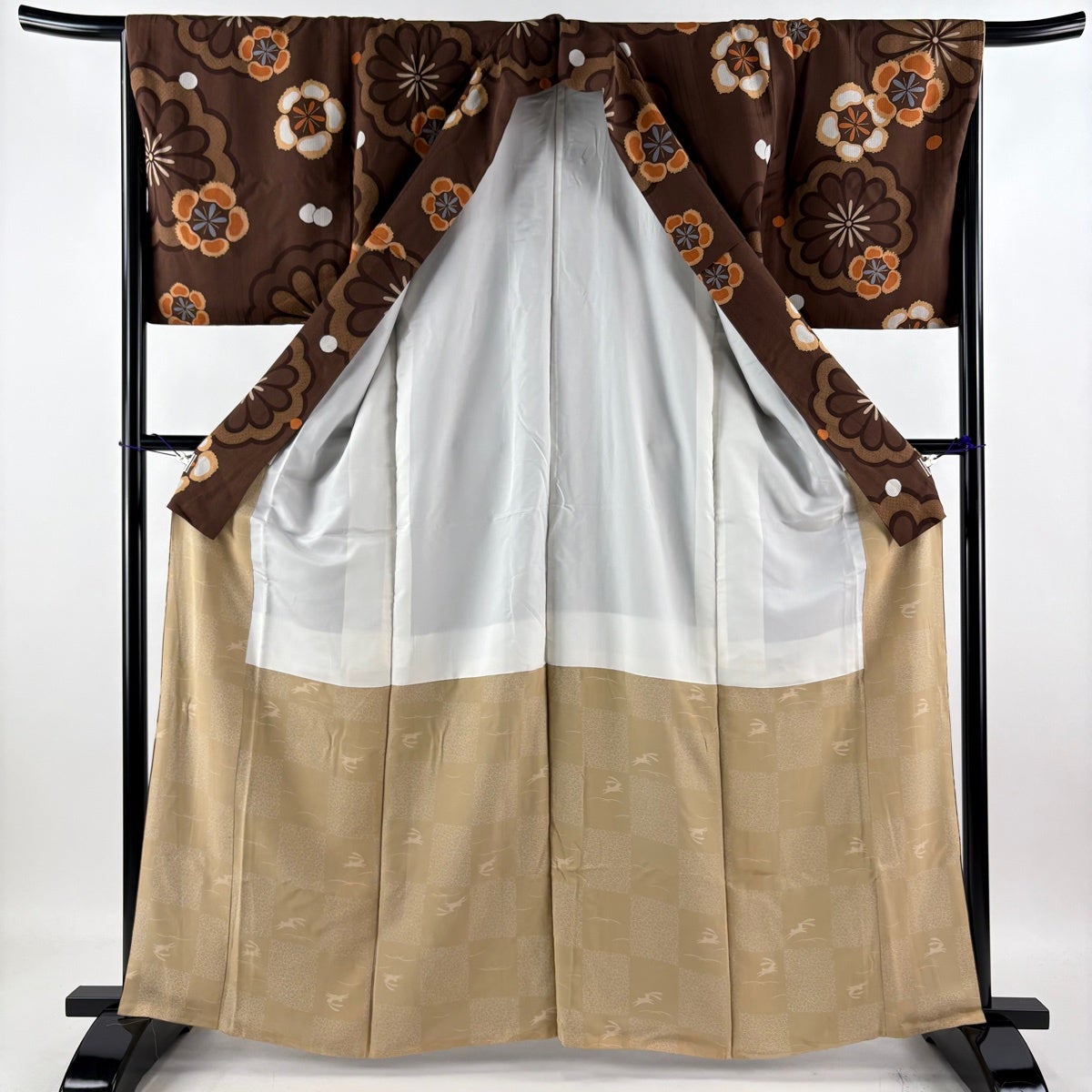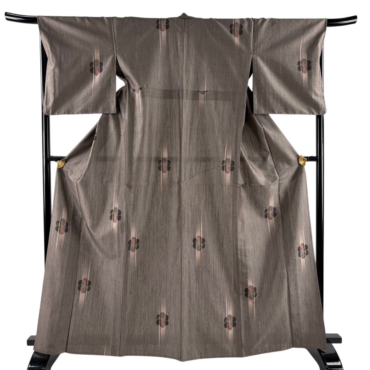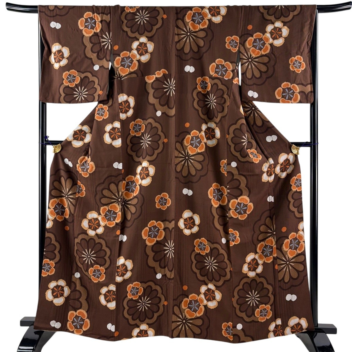 小紋 身丈163.5cm 裄丈66.5cm M 袷 やまと 花 縦縞 金彩 茶色 正絹 秀品
