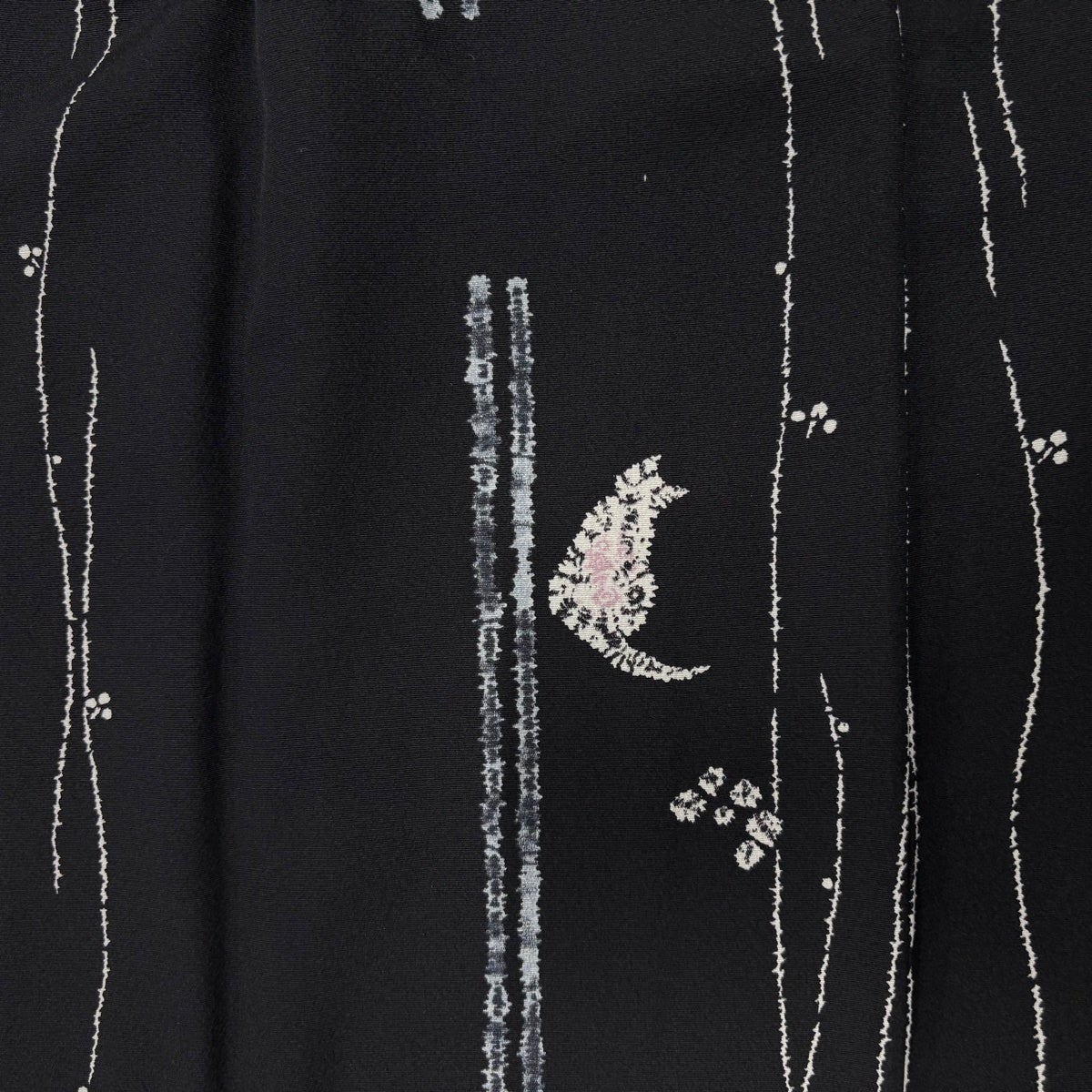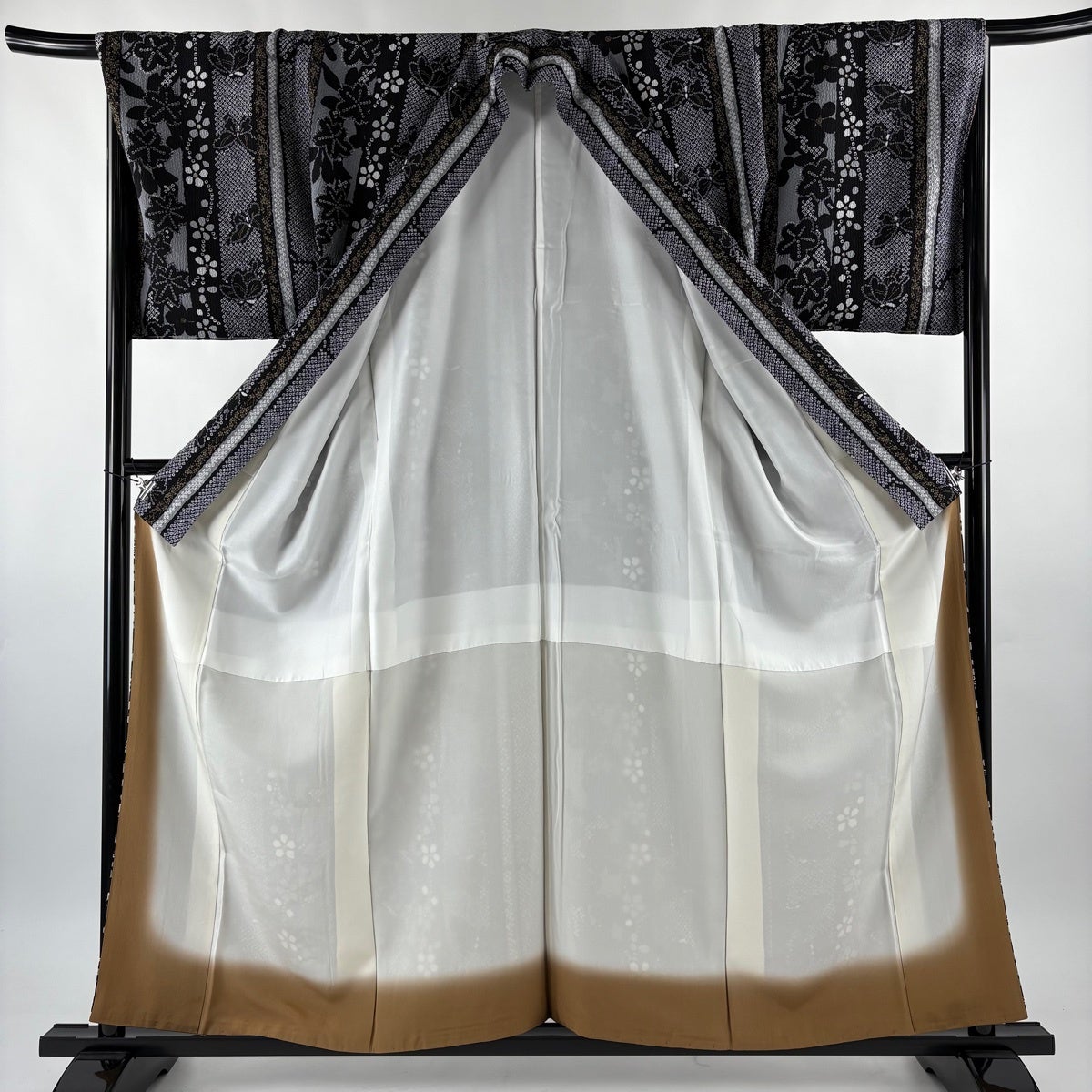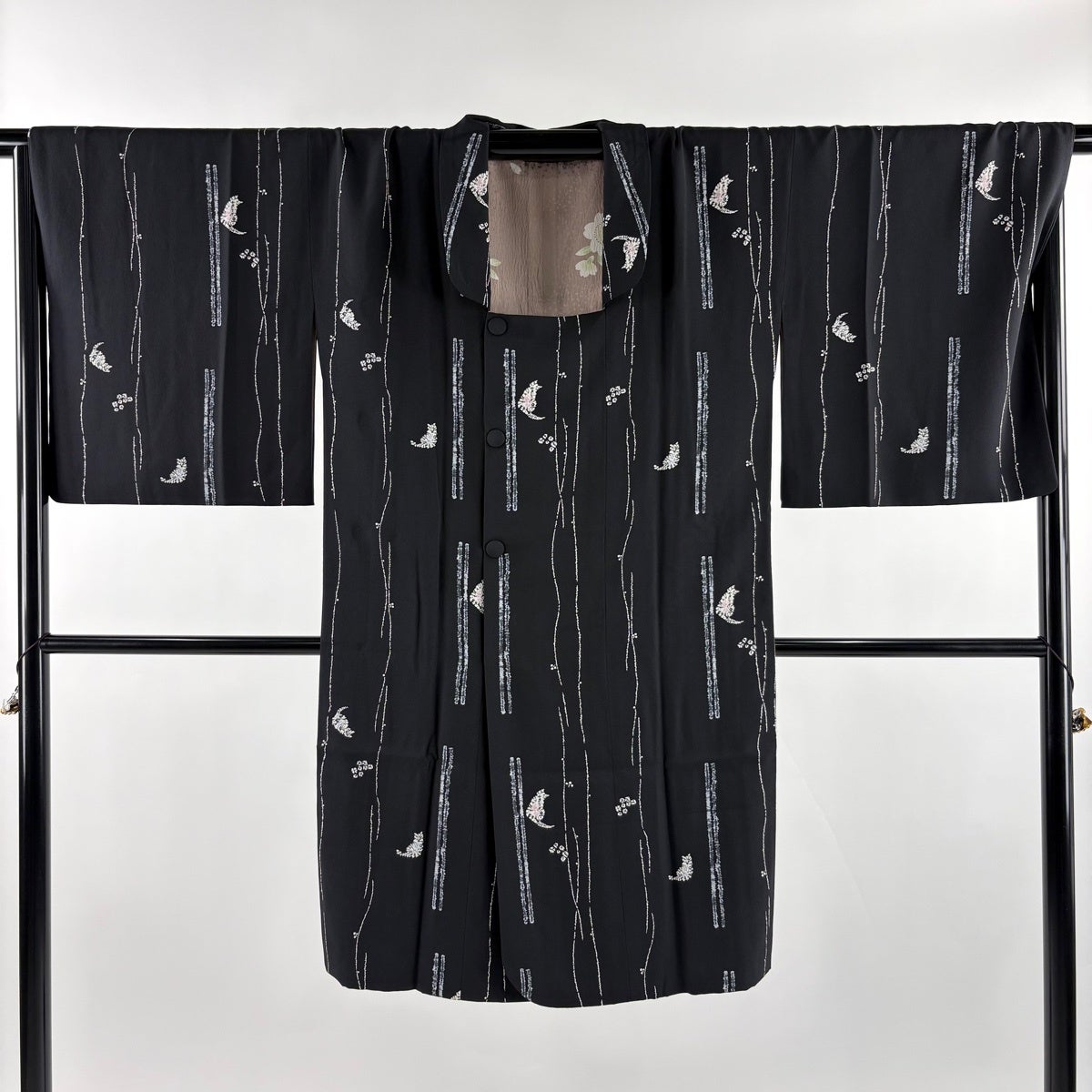 【美品】 小紋 身丈160cm 裄丈68cm L 袷 草花 蝶 金彩 黒灰 正絹 秀品