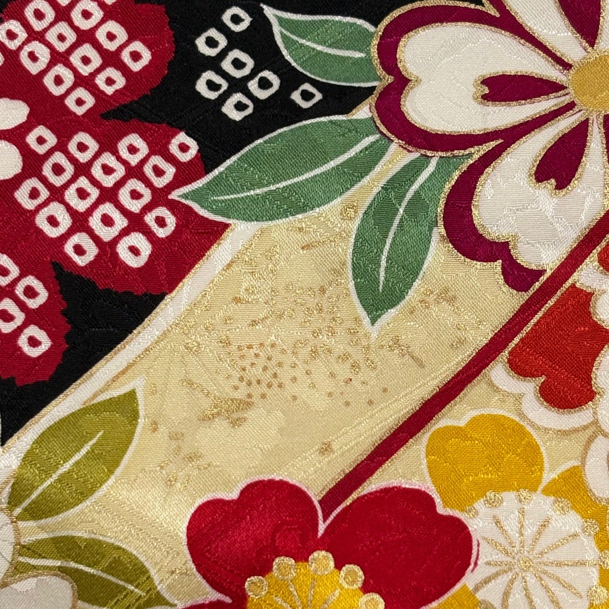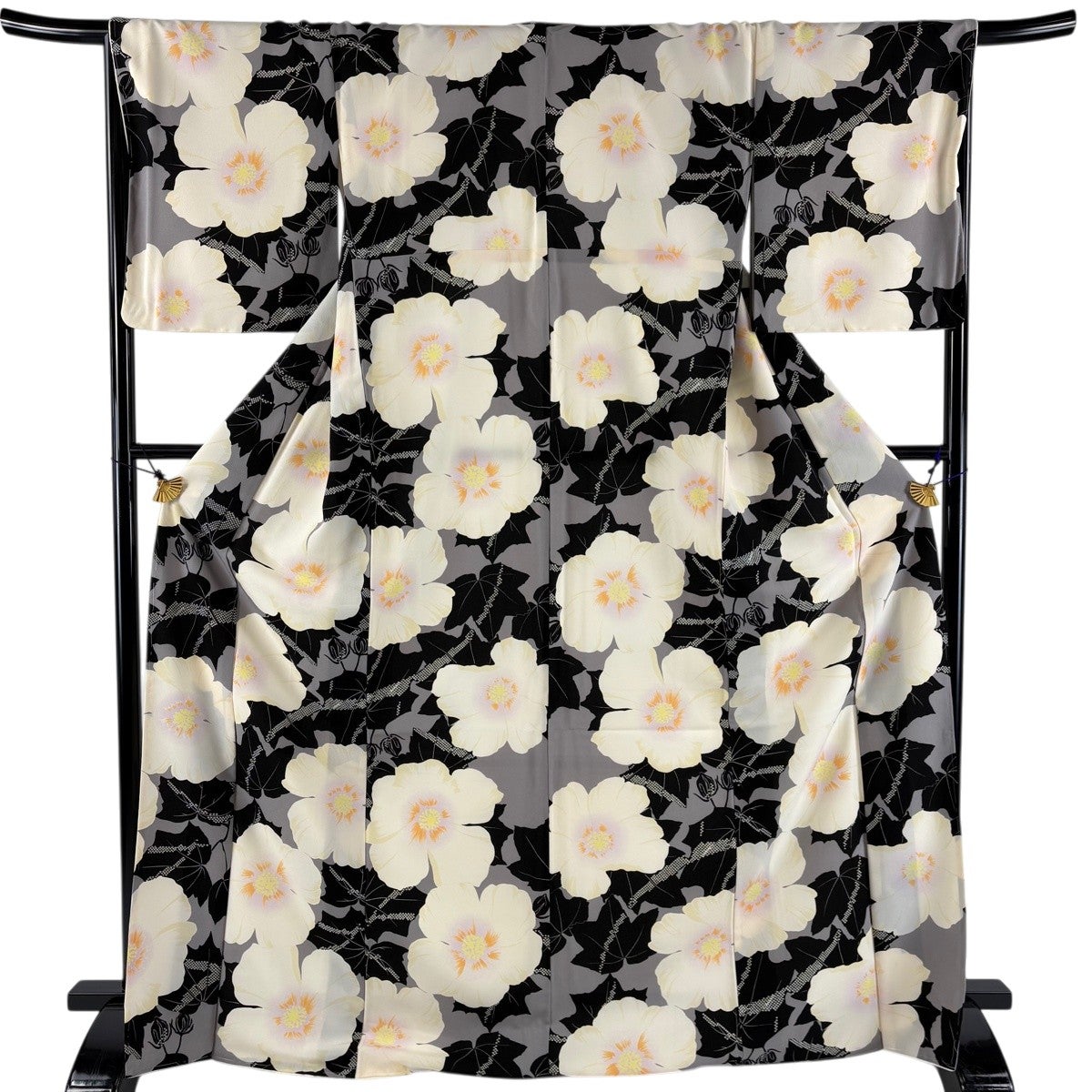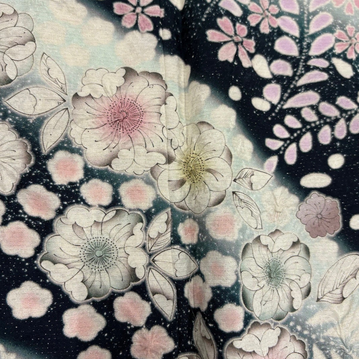 【美品】 振袖 身丈169.5cm 裄丈68.5cm L 袷 洗える着物 牡丹 桜 金彩 黒 化繊 優品