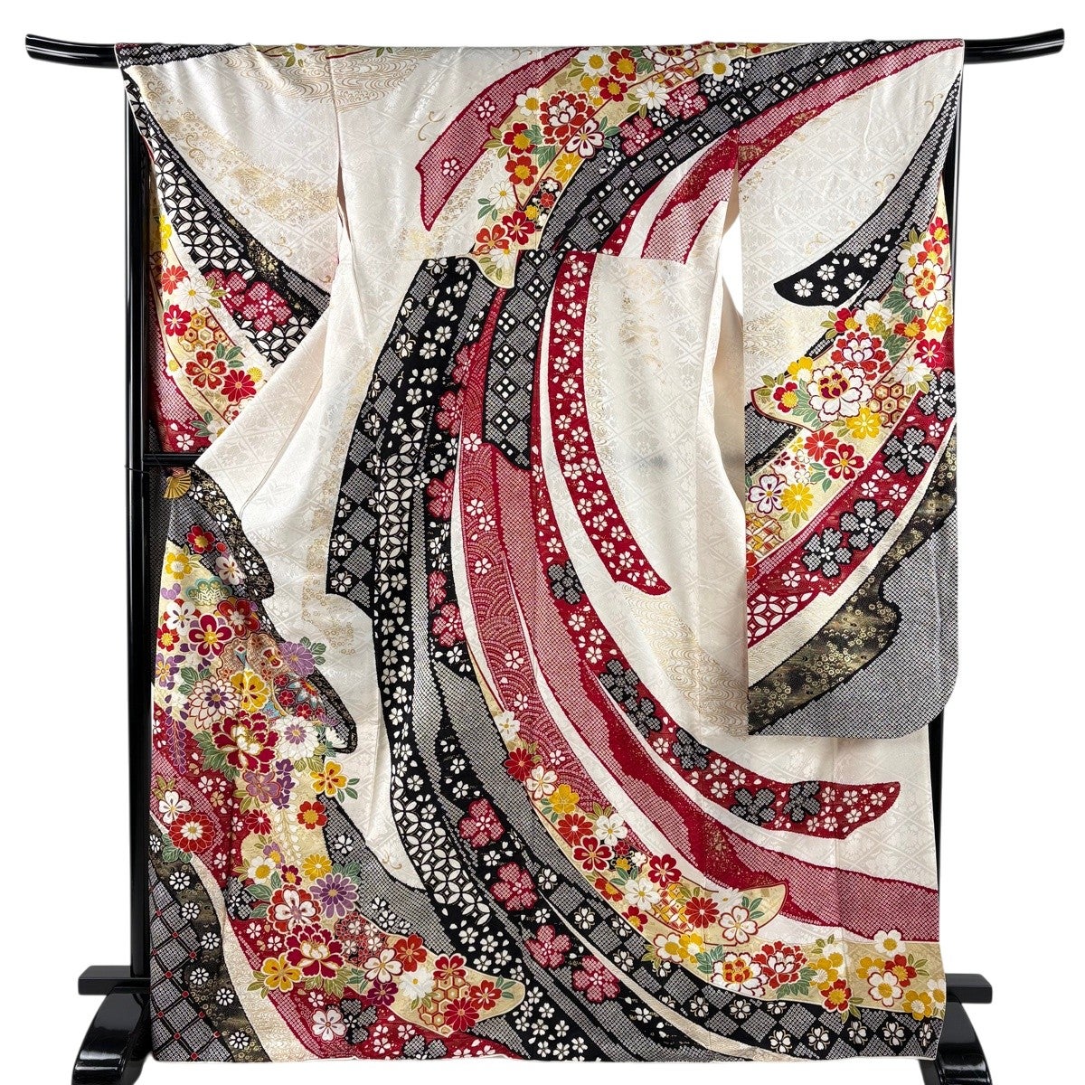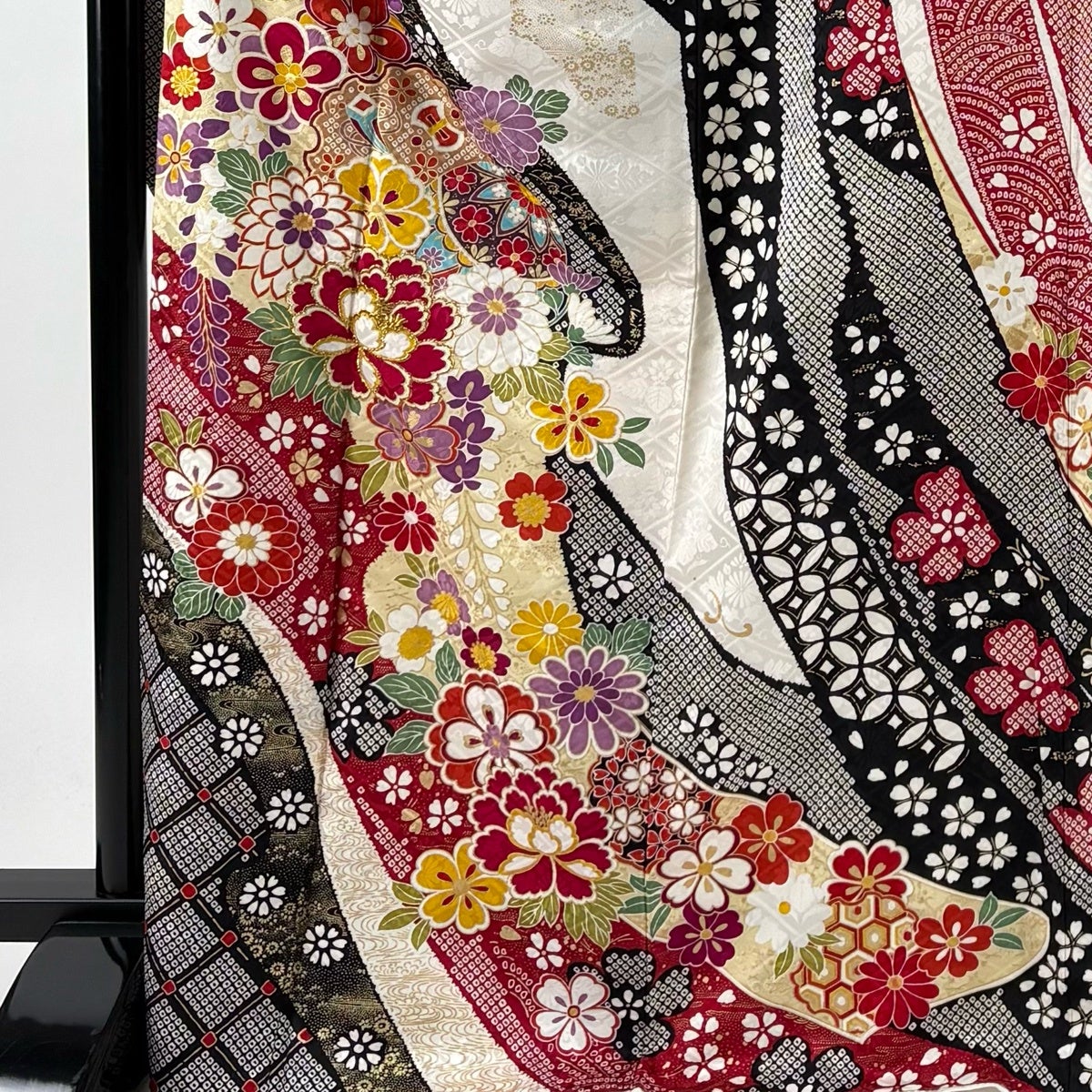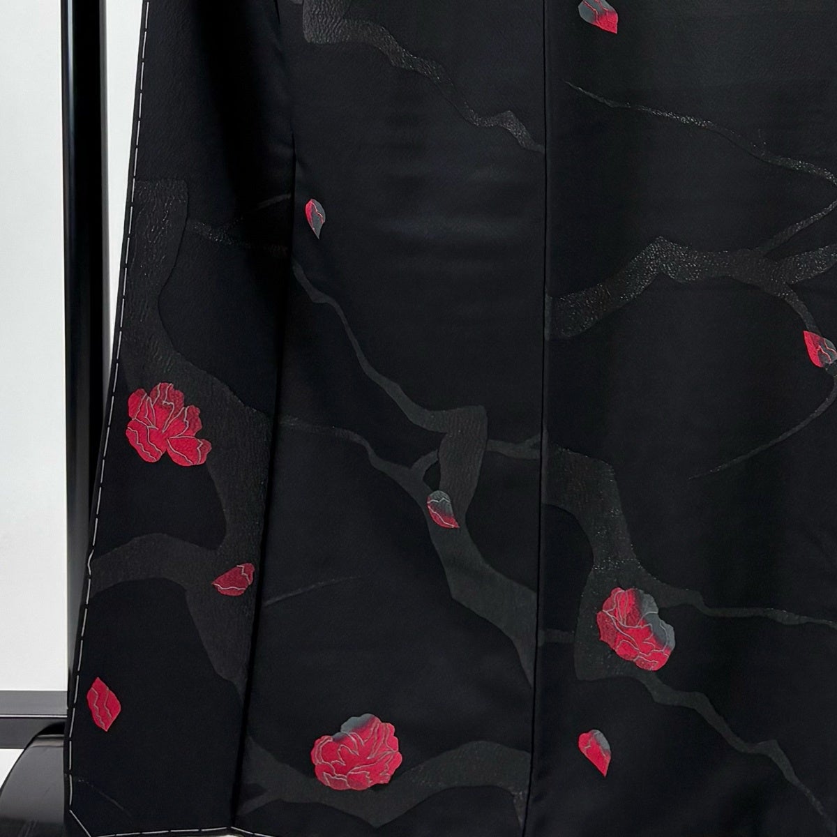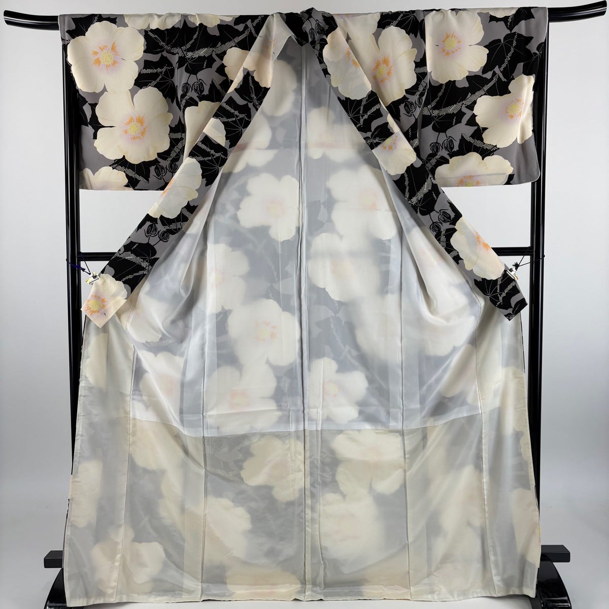 【美品】 振袖 身丈169.5cm 裄丈68.5cm L 袷 洗える着物 牡丹 桜 金彩 黒 化繊 優品