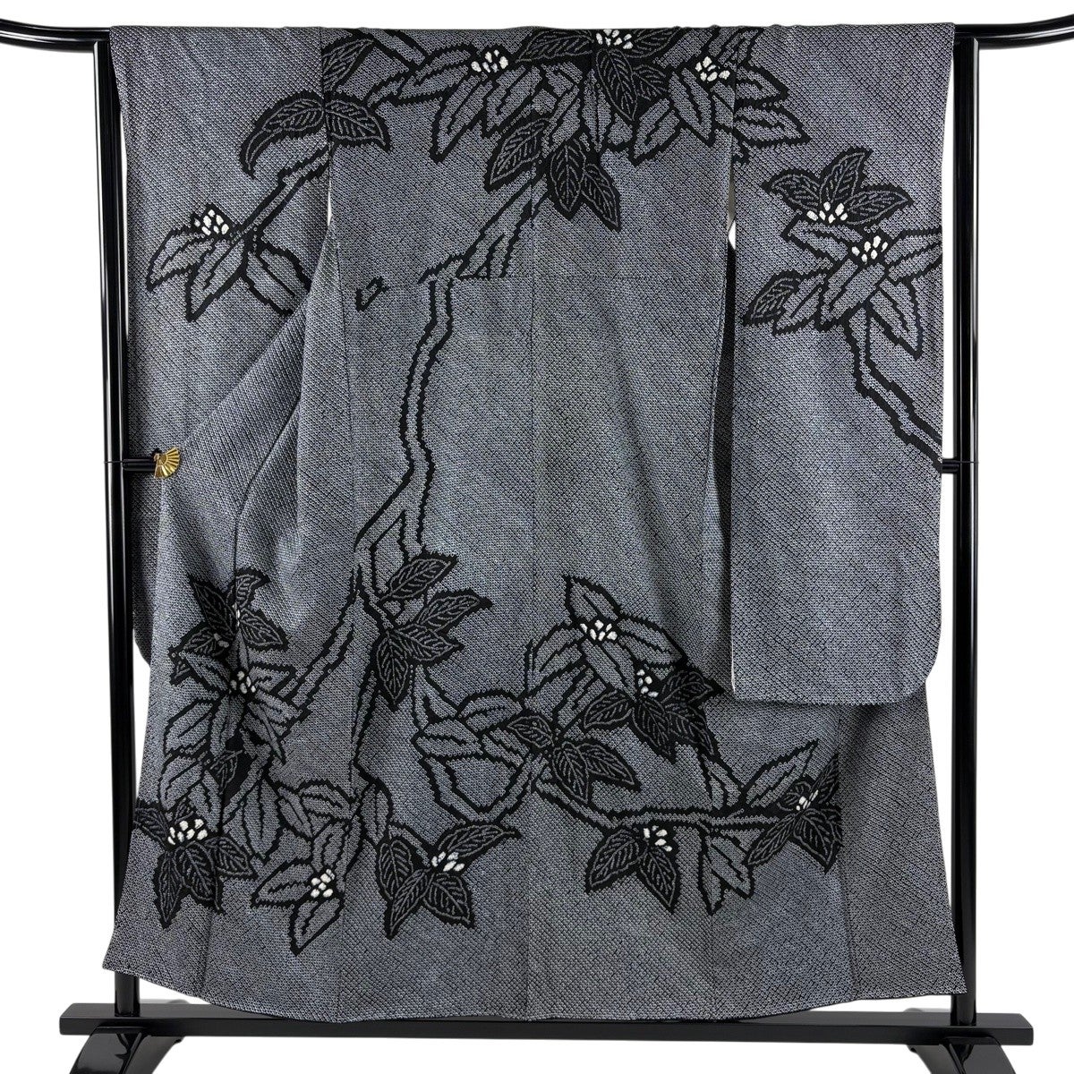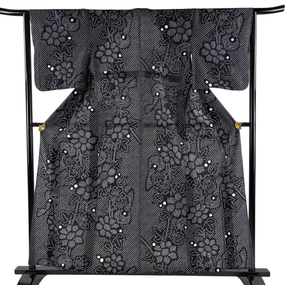 【美品】 小紋 身丈172cm 裄丈68cm L 袷 洗える着物 草花 黒 化繊 優品