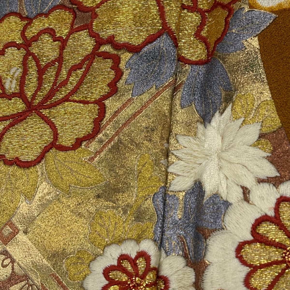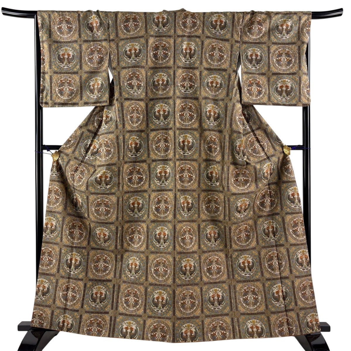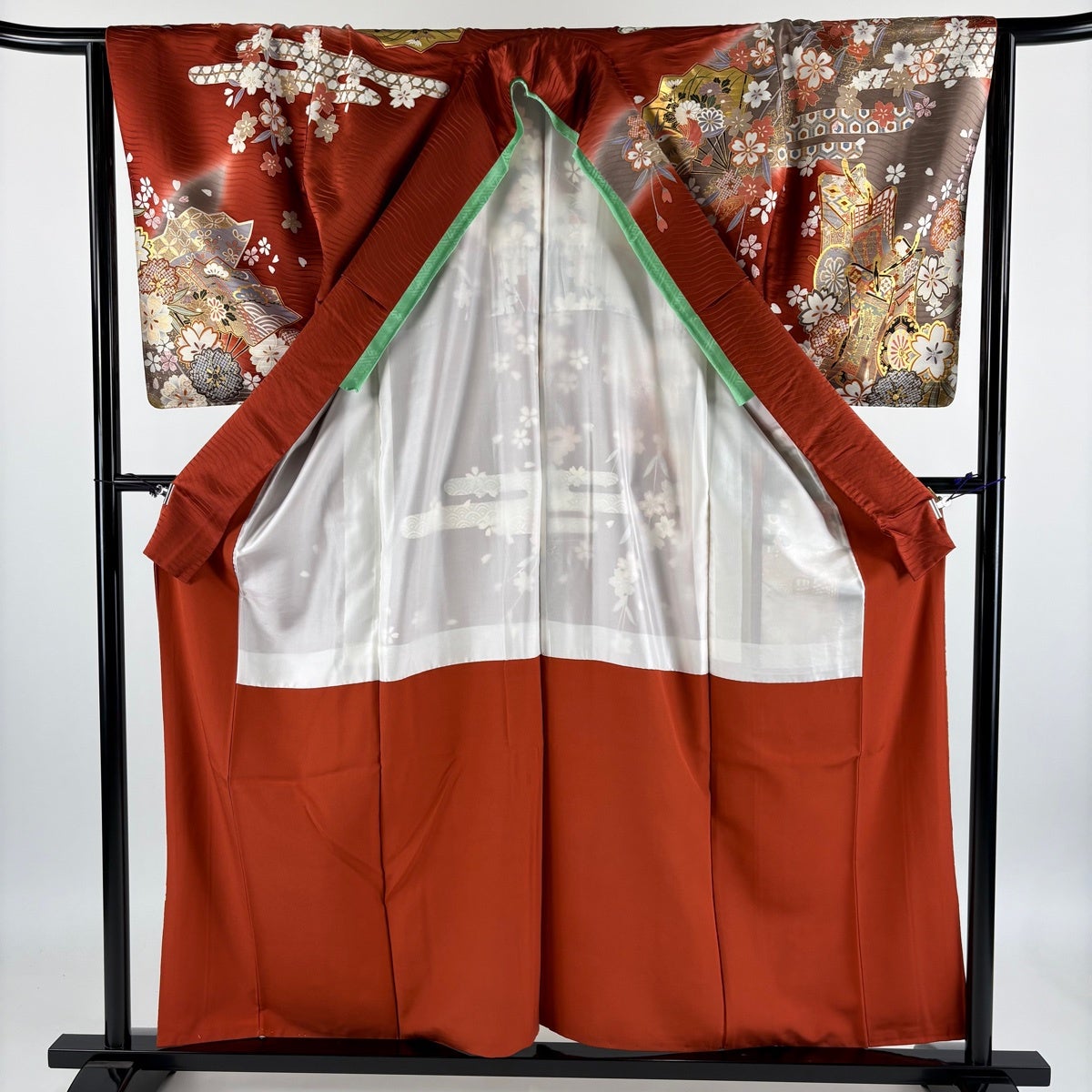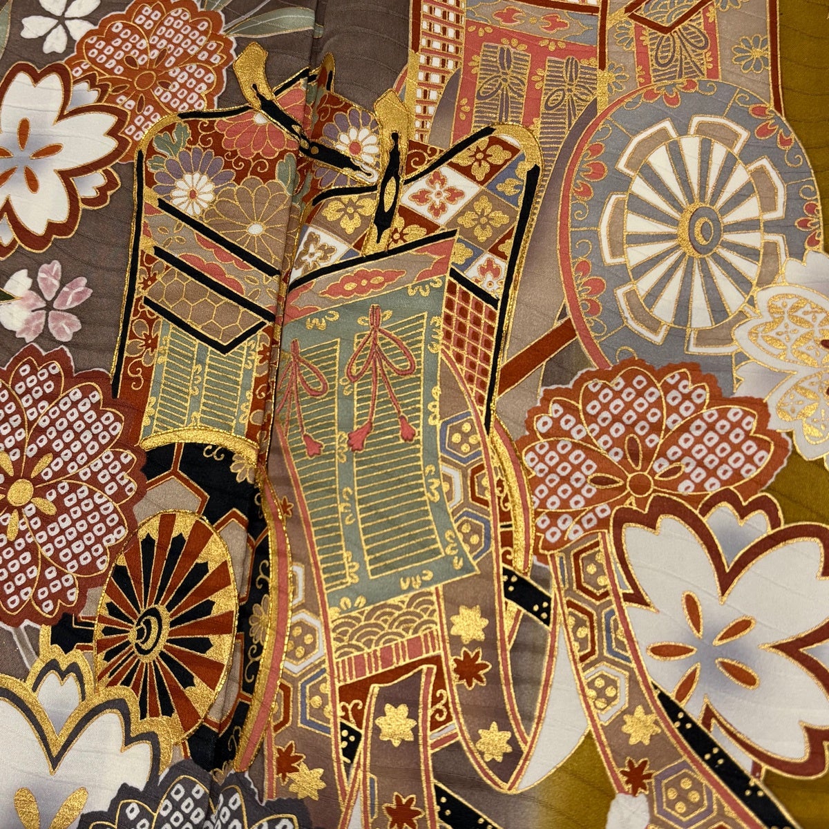 【美品】 振袖 身丈168cm 裄丈68cm L 袷 草花 熨斗 金糸 金彩 焦茶色 正絹 秀品