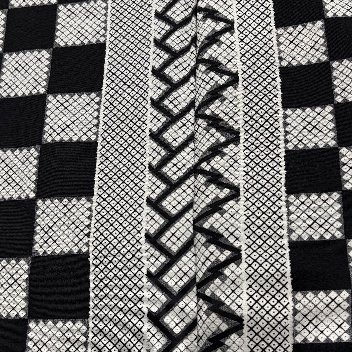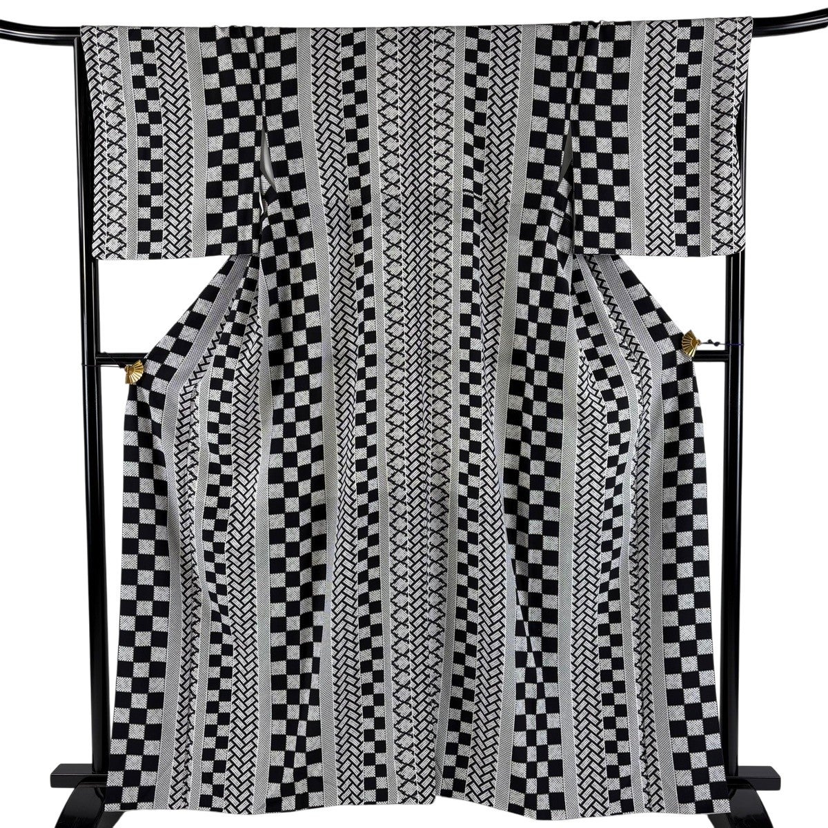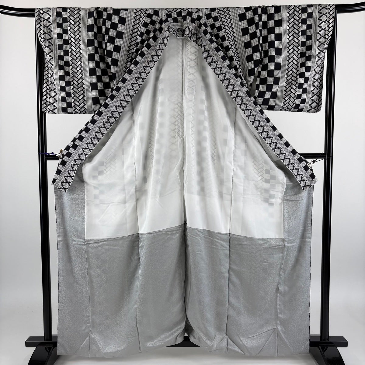 小紋 身丈162cm 裄丈67.5cm L 袷 市松 桧垣 黒灰 正絹 秀品