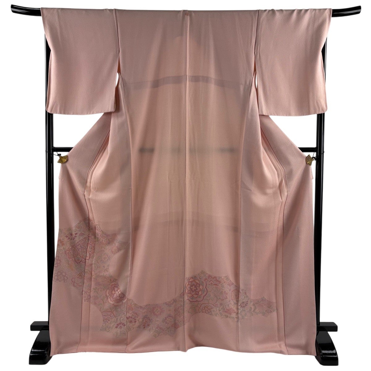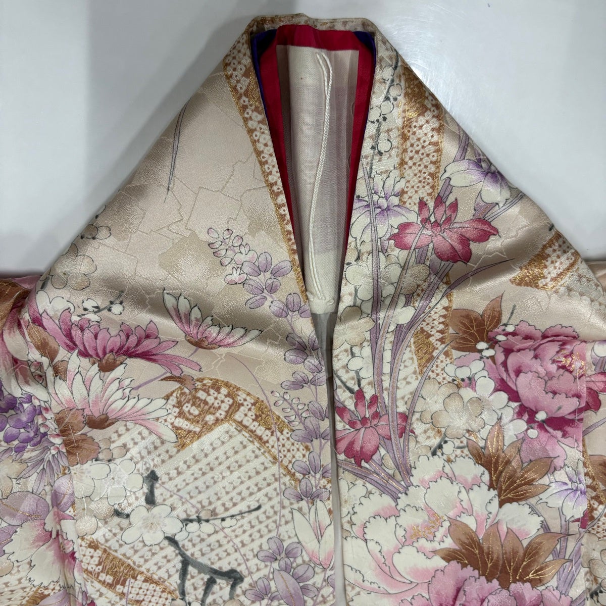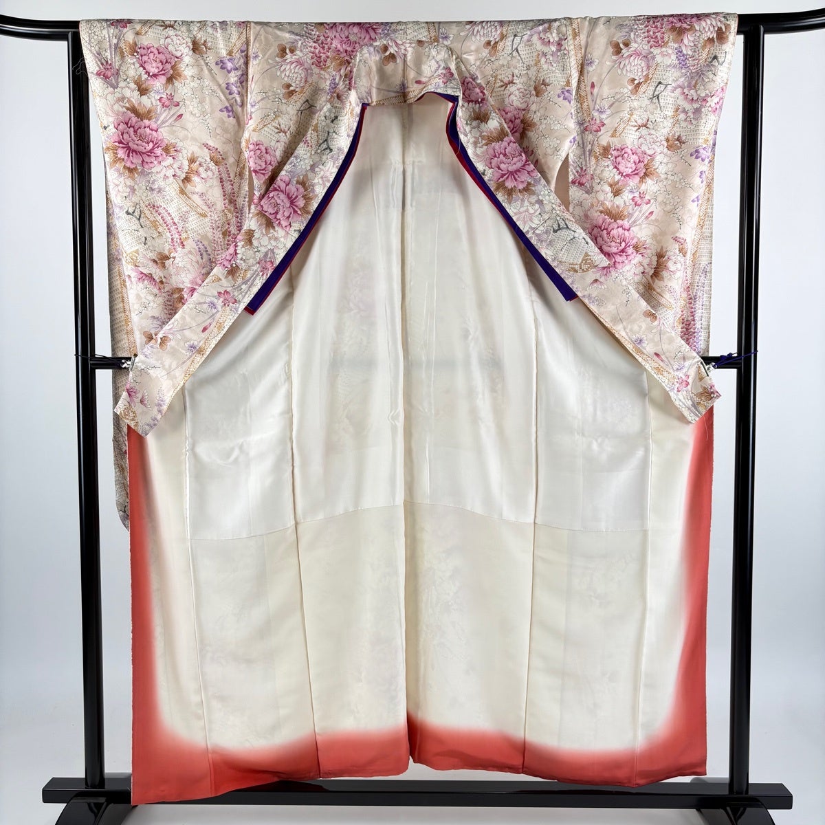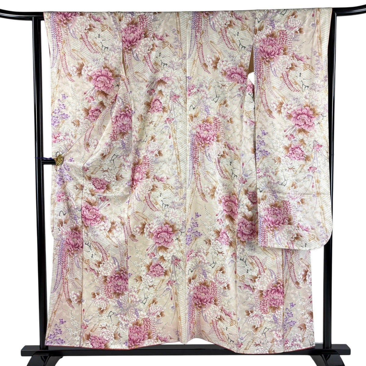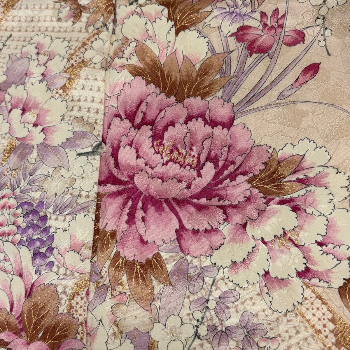 【美品】 振袖 身丈156cm 裄丈63cm S 袷 牡丹 藤 金彩 ピンクベージュ 正絹 秀品
