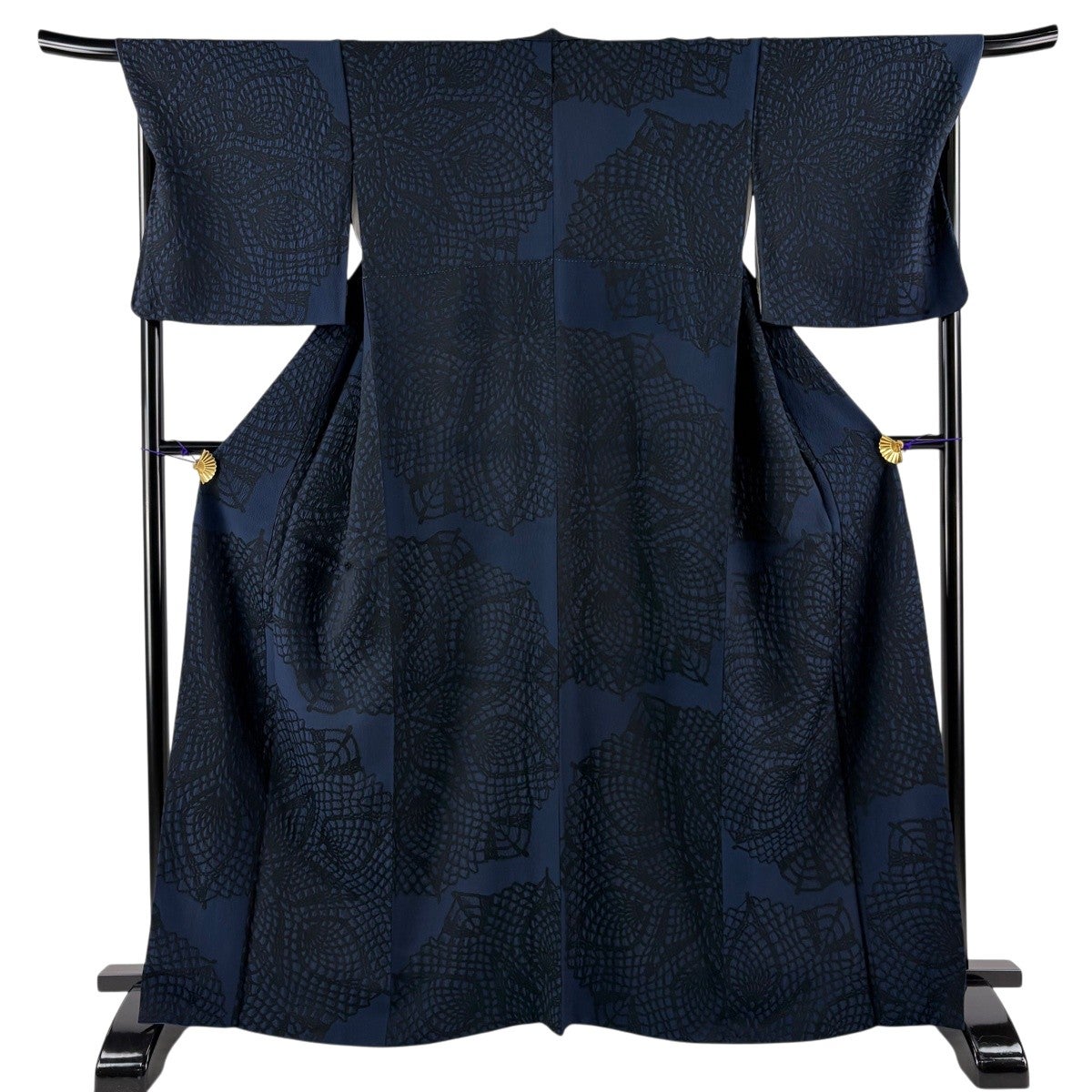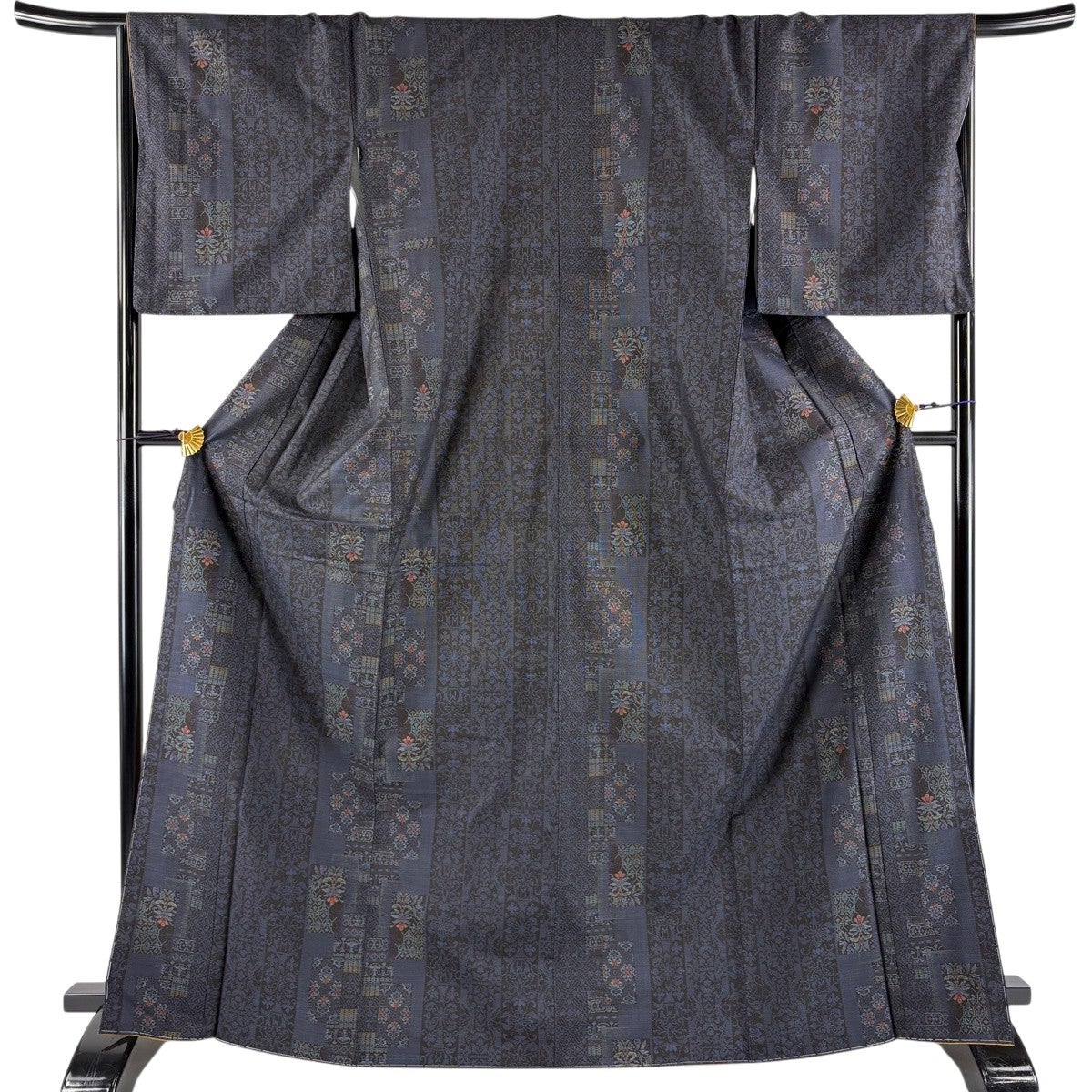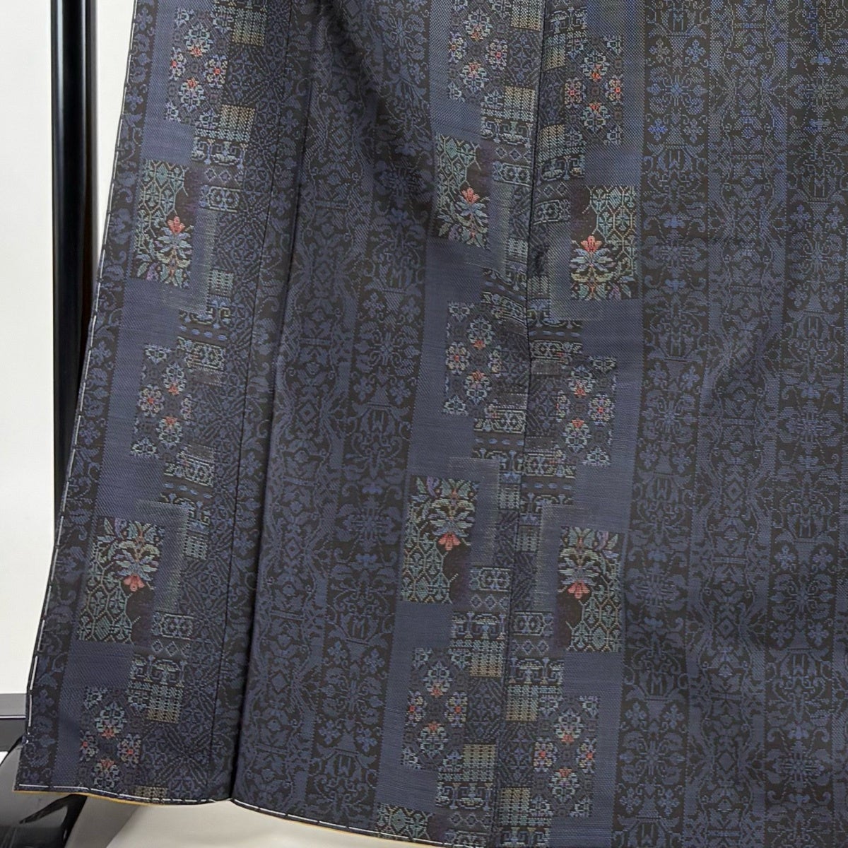 【美品】 男着物 身丈103.5cm 裄丈72.5cm L 羽織 洗える着物 幾何学模様 刺繍 銀糸 黒 化繊 優品