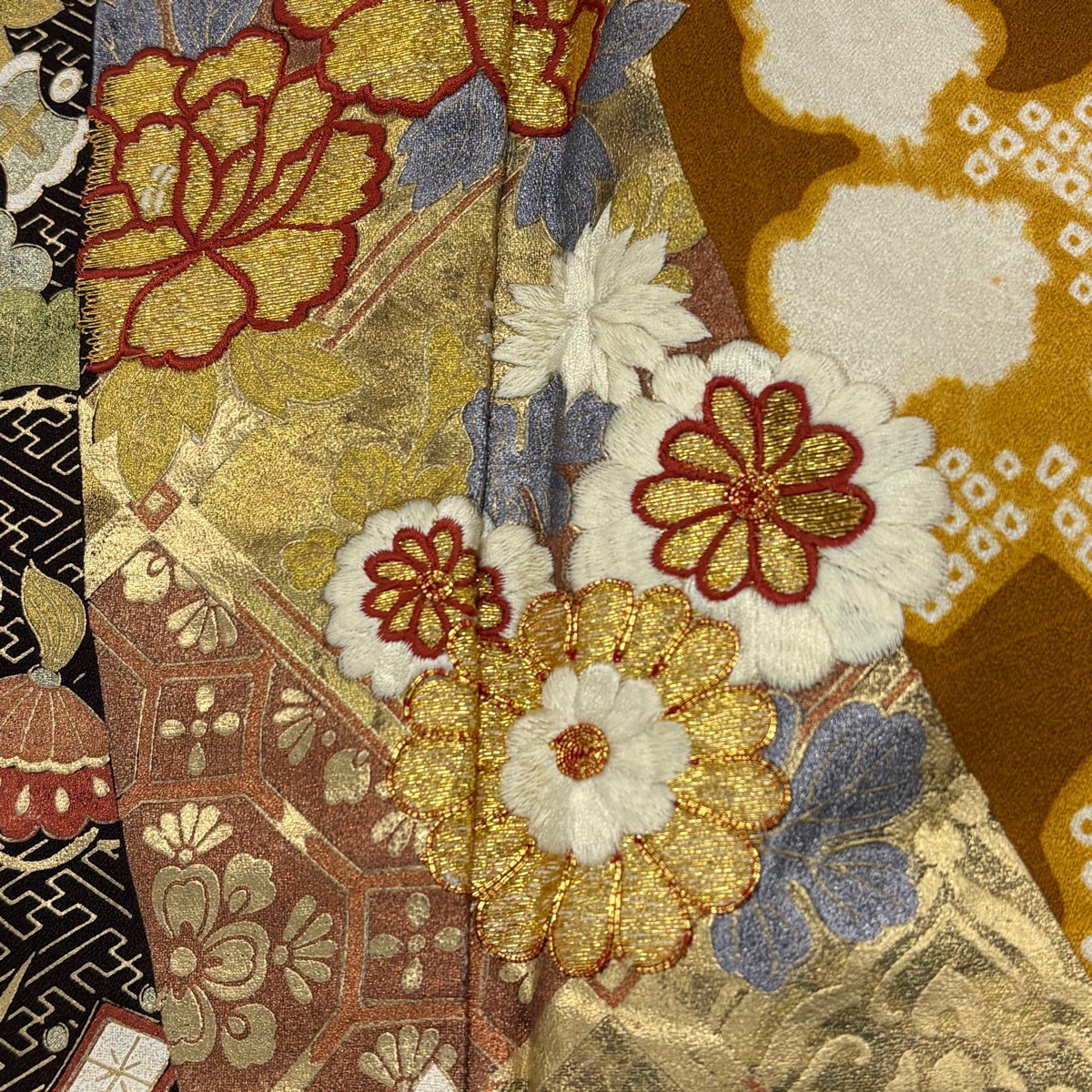 振袖 身丈165cm 裄丈67.5cm L 袷 向かい鳥 草花 金糸 金彩 山吹色 正絹 秀品