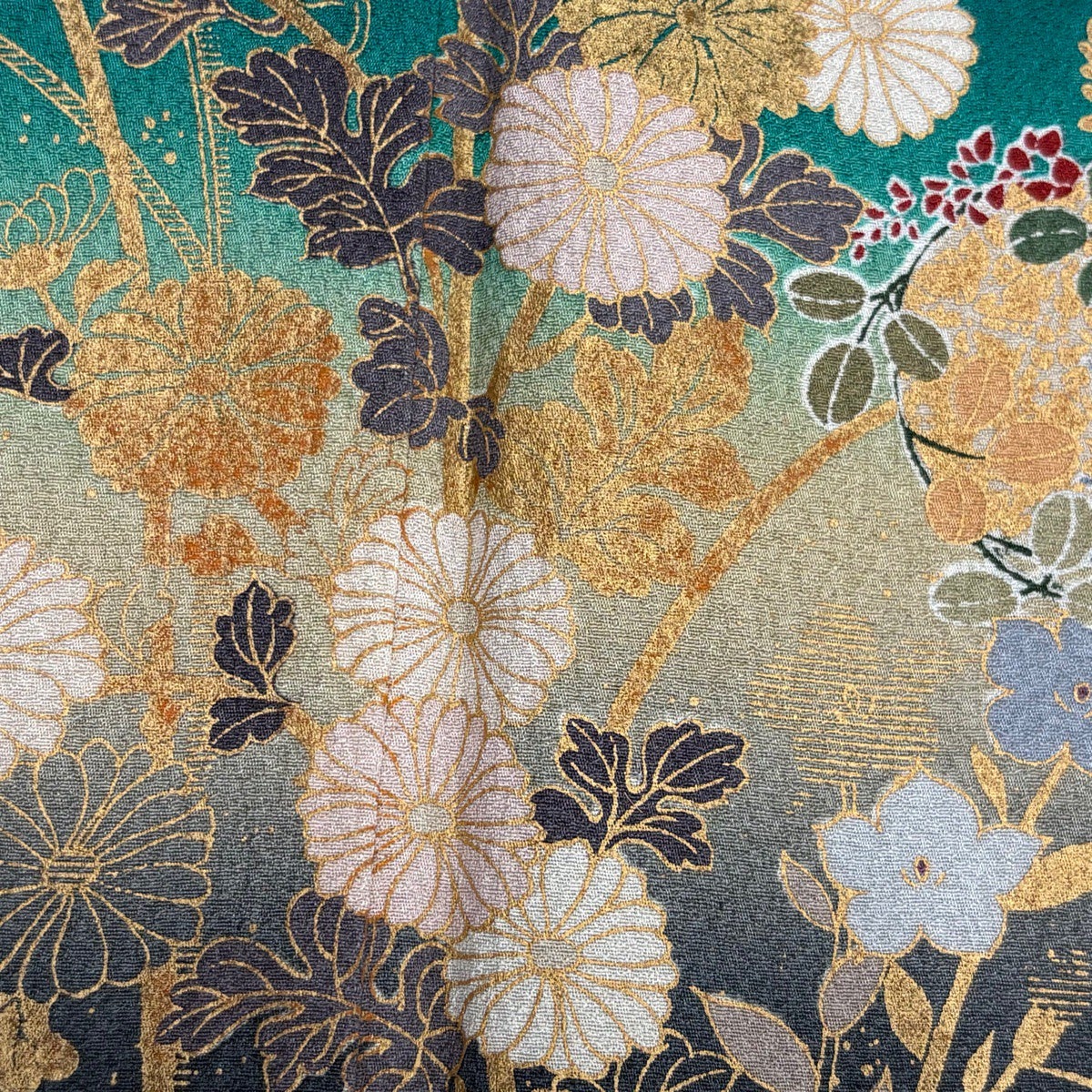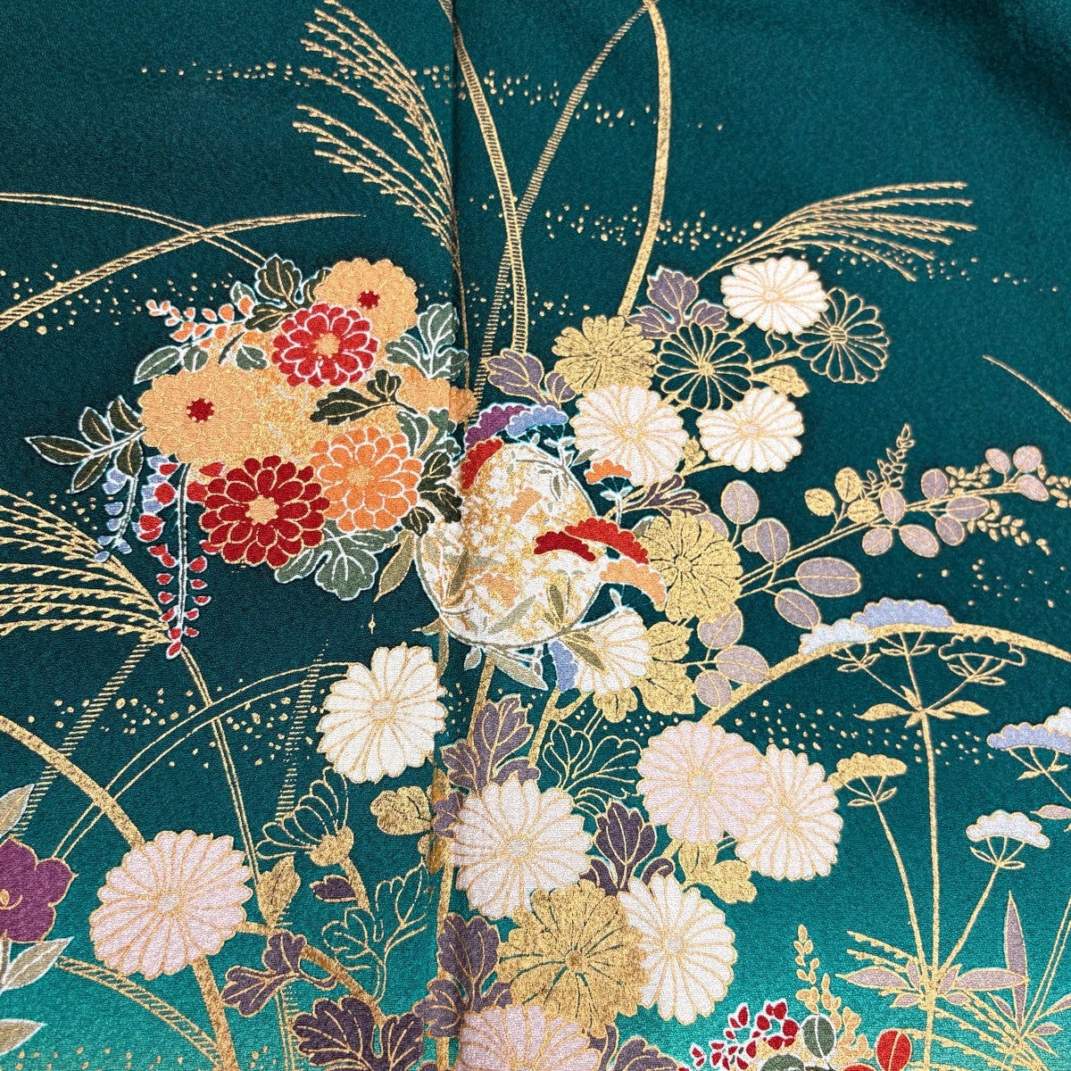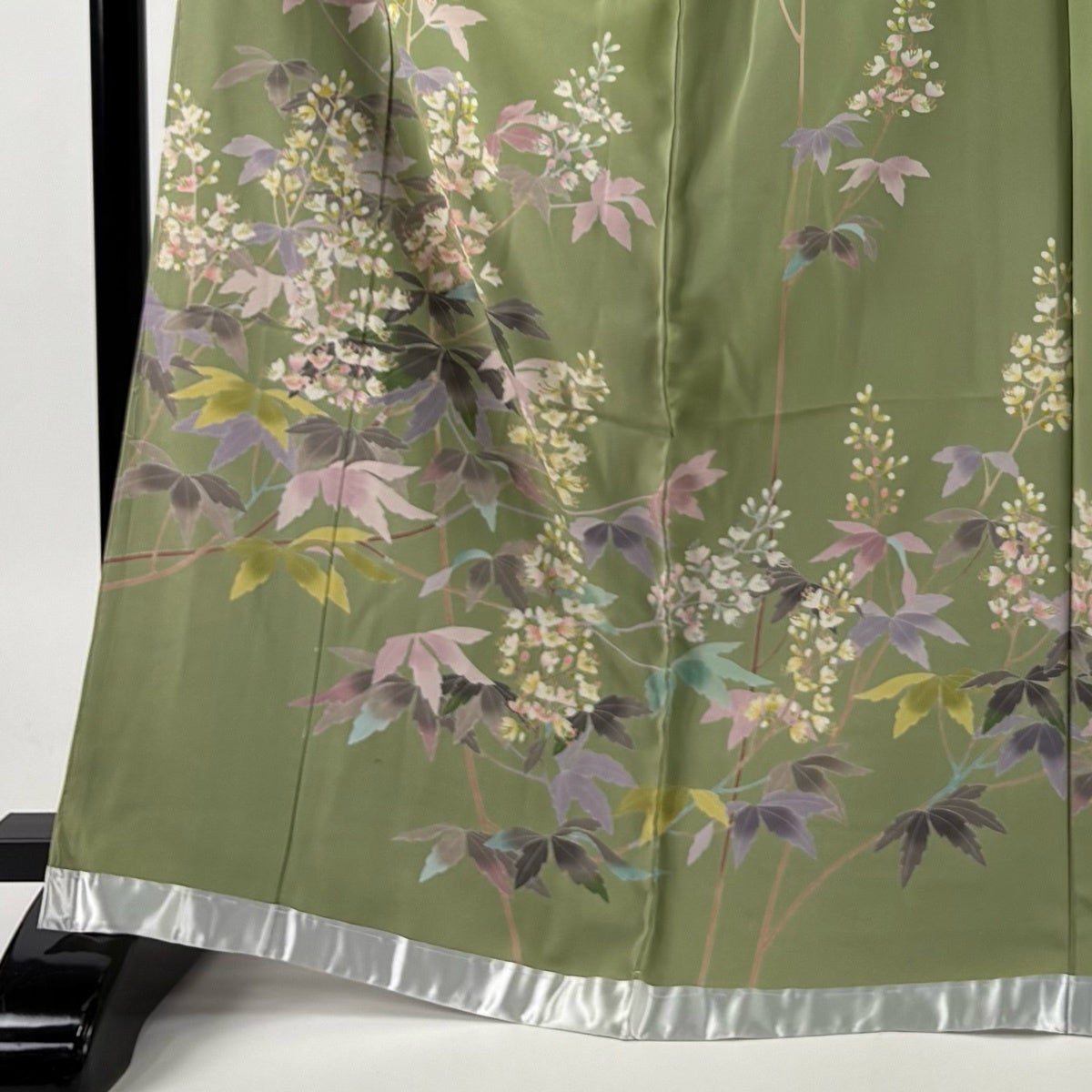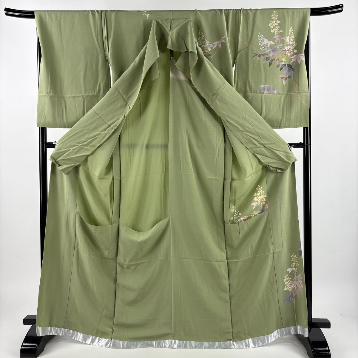 【美品】 小紋 身丈162cm 裄丈65.5cm M 袷 草花 灰緑 正絹 秀品