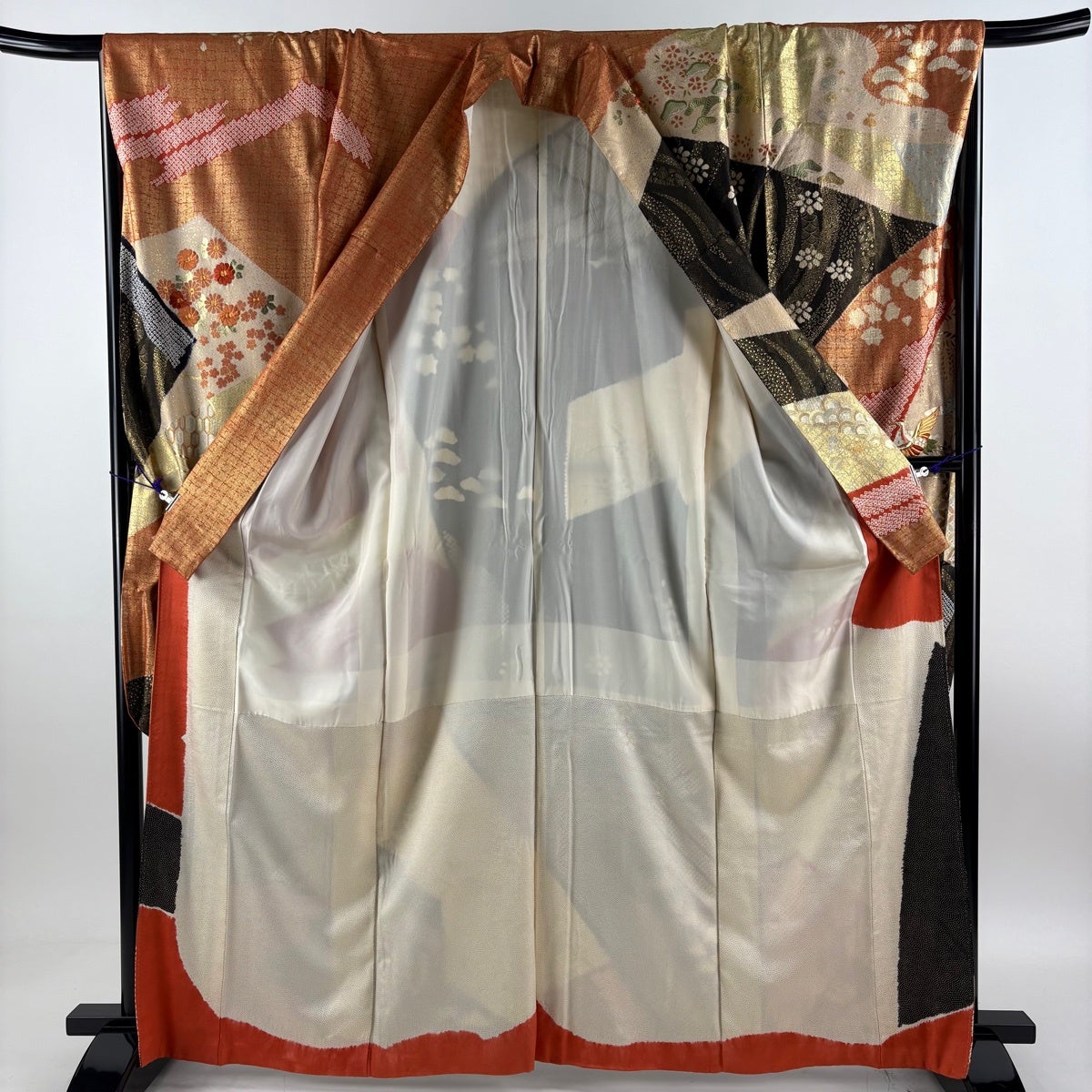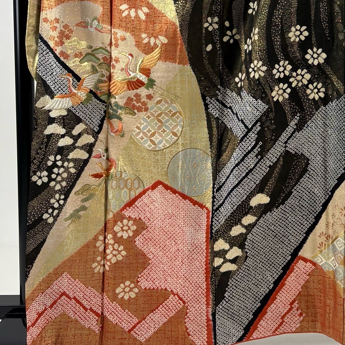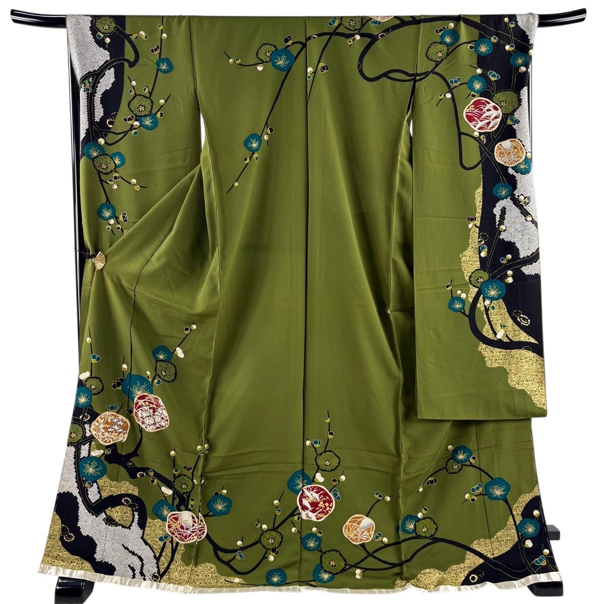 黒留袖 身丈164.5cm 裄丈65cm M 袷 落款あり 扇 花車 金糸 金銀彩 黒 正絹 優品