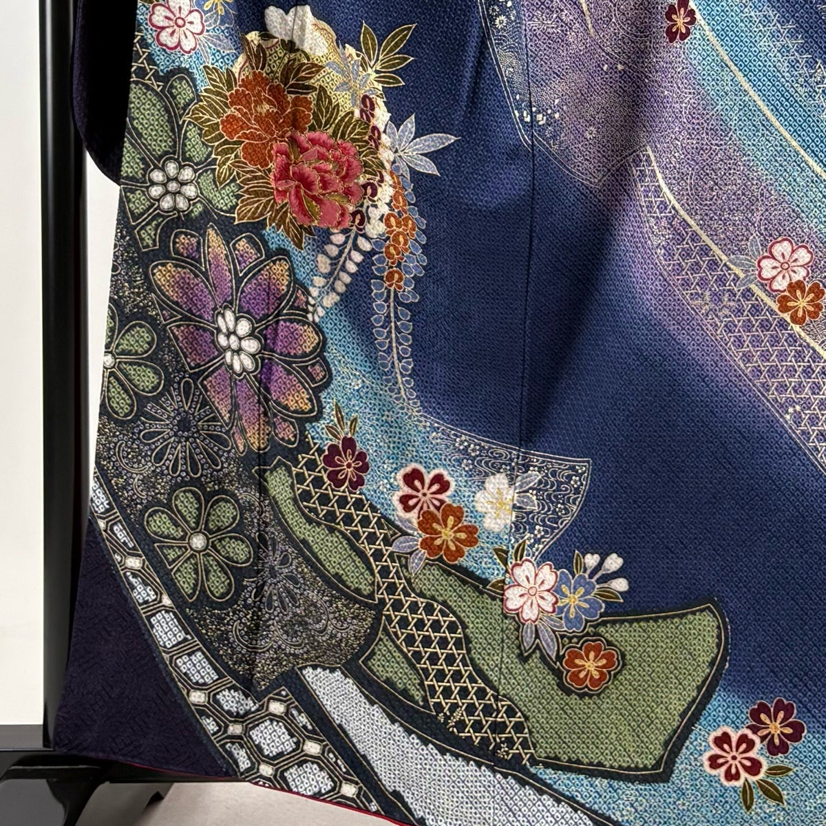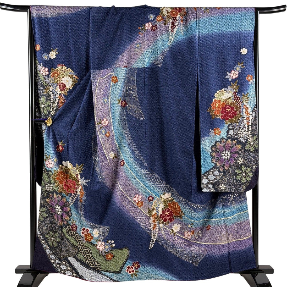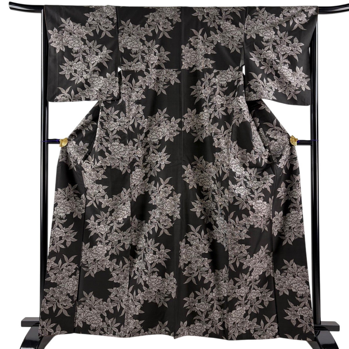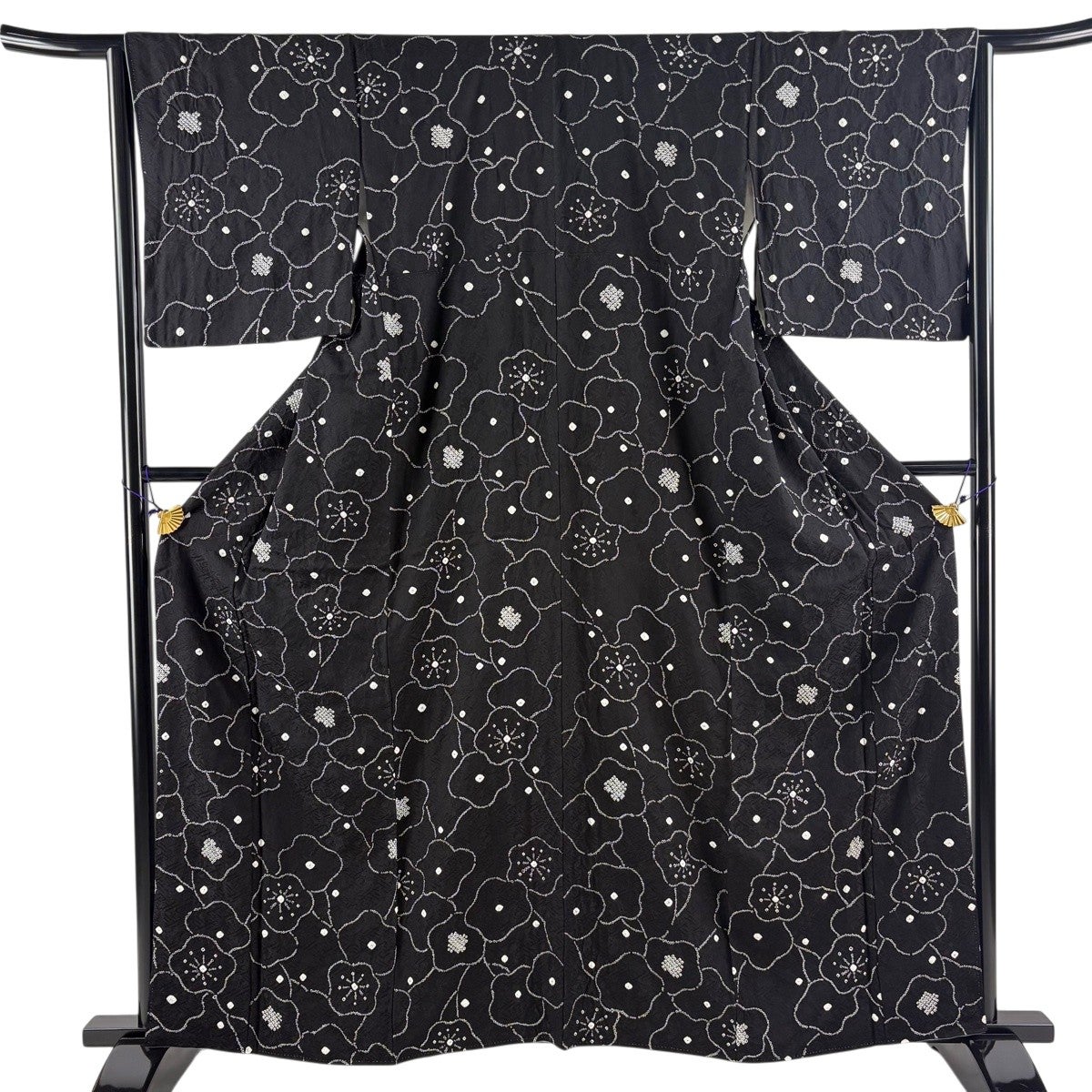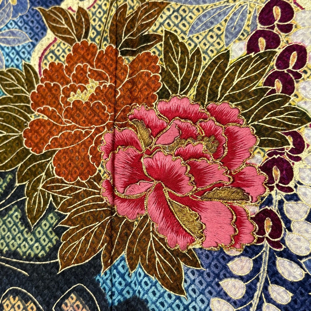 振袖 身丈169cm 裄丈67cm M 袷 牡丹 菊 金糸 総絞り 黒 正絹 名品