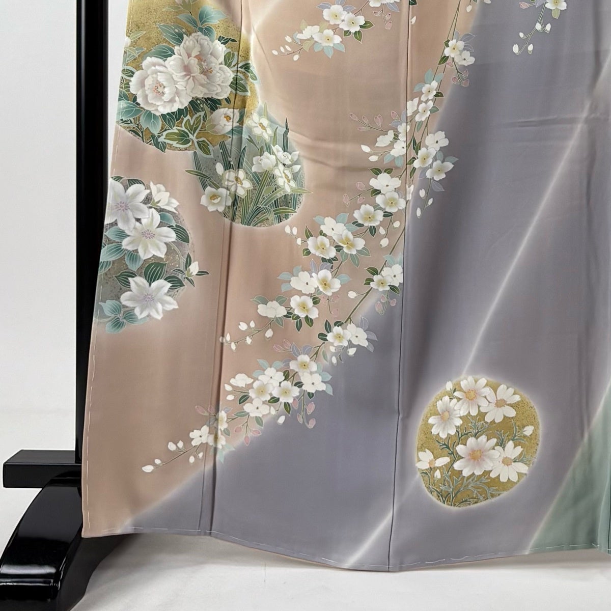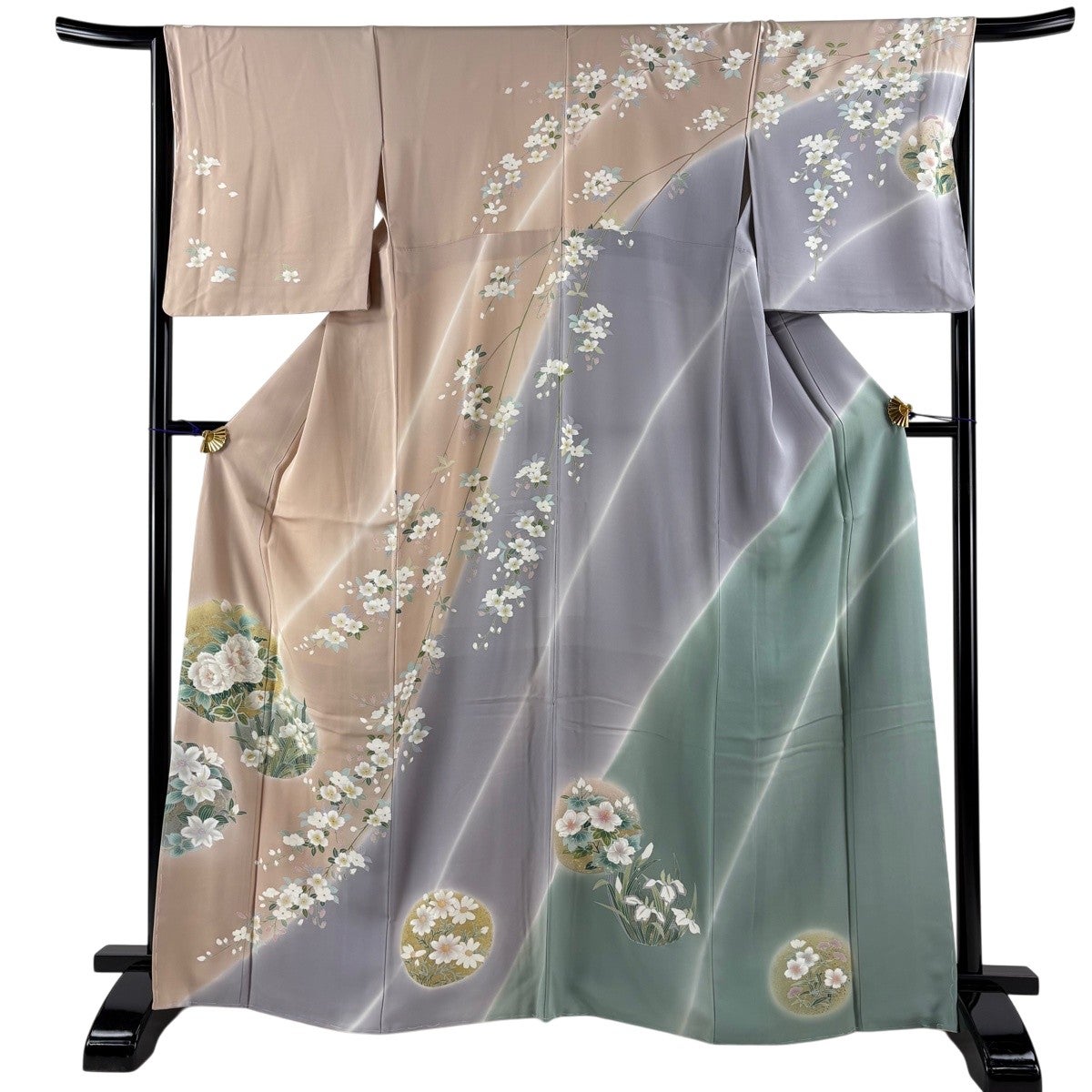 訪問着 身丈167.5cm 裄丈66.5cm M 袷 丸文 草花 金彩 染め分け 薄茶色 正絹 秀品