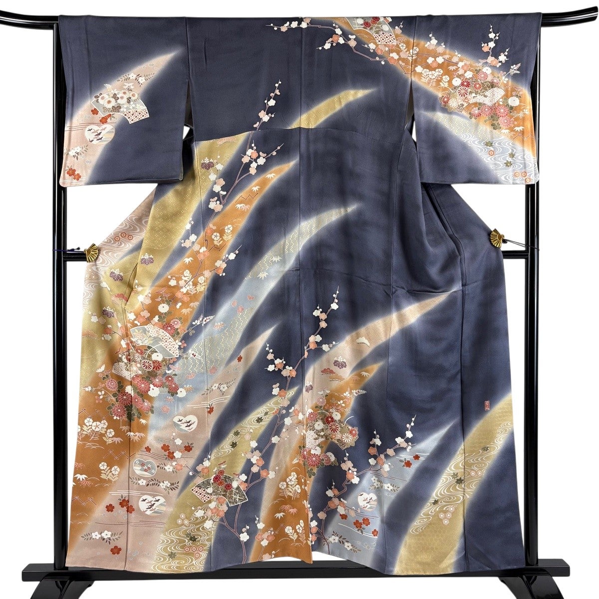訪問着 身丈155.5cm 裄丈66cm M 袷 蒼風 落款あり 扇面 菊 金彩 染め分け 灰紫 正絹 秀品