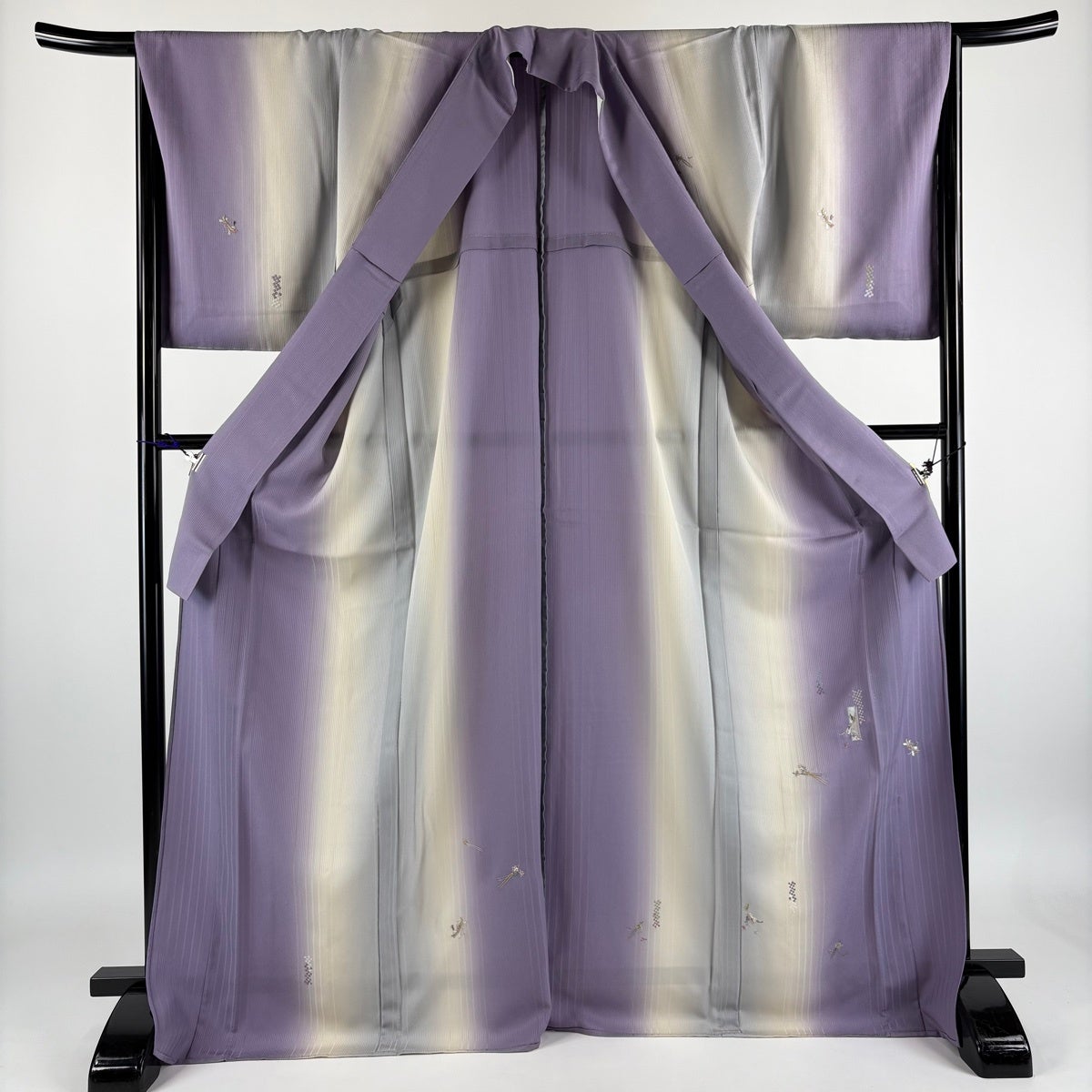 【美品】 小紋 身丈160.5cm 裄丈63.5cm S 薄物 段縞 ぼかし 紫 正絹 秀品