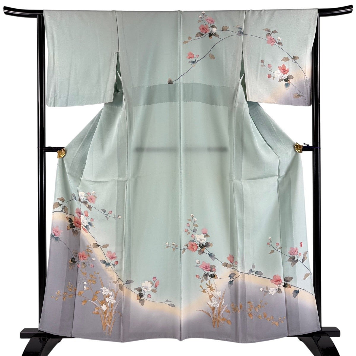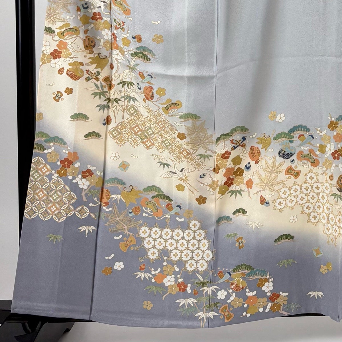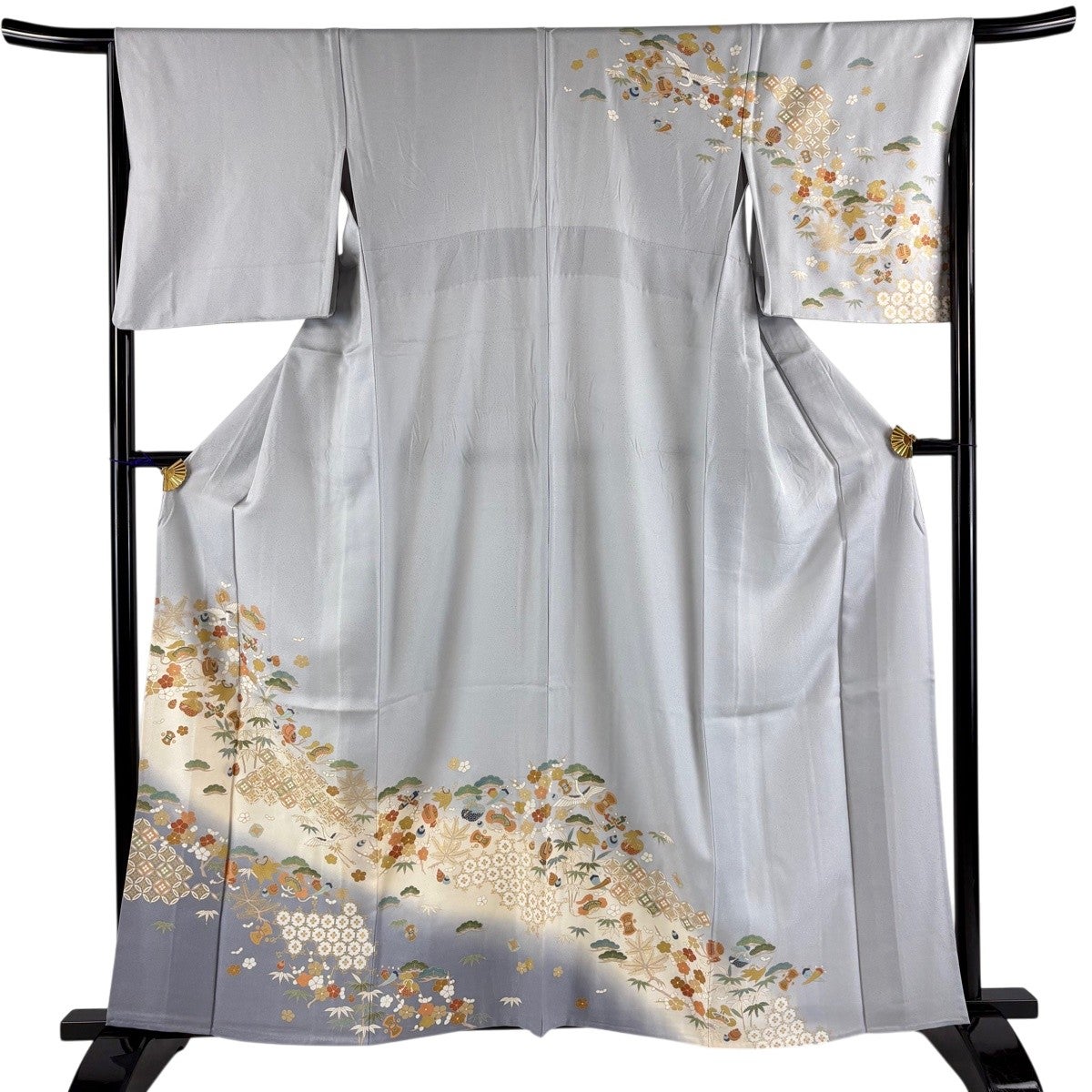 訪問着 身丈173.5cm 裄丈70.5cm L 袷 檜扇 草花 金彩 ぼかし 水色 正絹 名品
