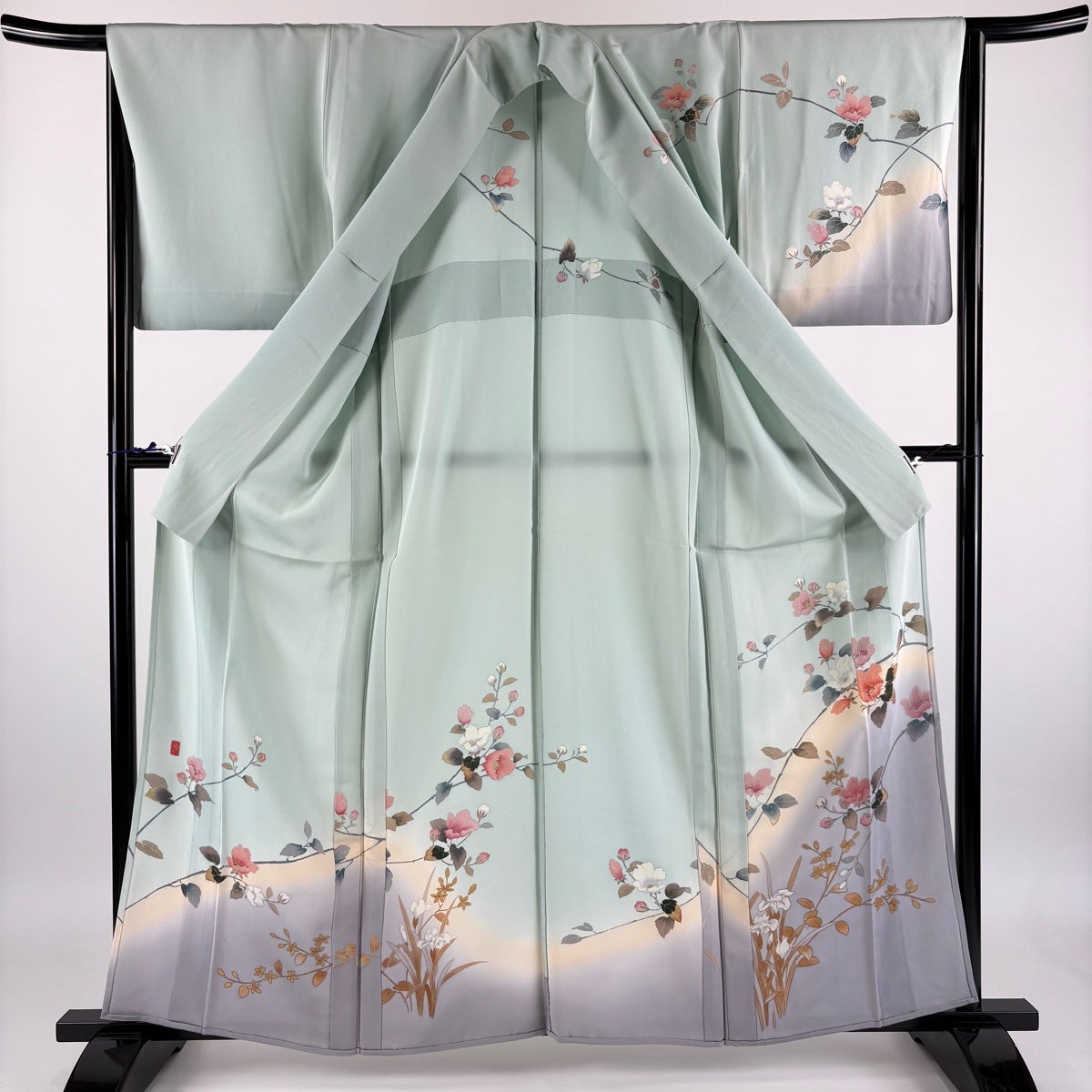 【美品】 訪問着 身丈163cm 裄丈65.5cm M 袷 落款あり 花籠 草花 染め分け ぼかし 青緑 正絹 逸品