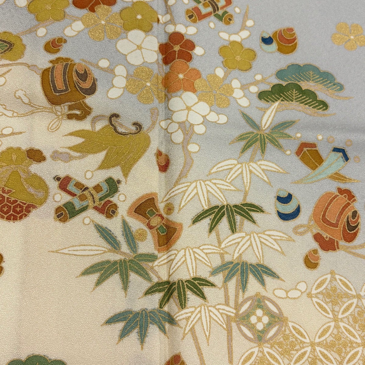 付下げ 身丈158.5cm 裄丈64cm M 袷 紬地 宝尽くし 霞 クリーム 正絹 秀品