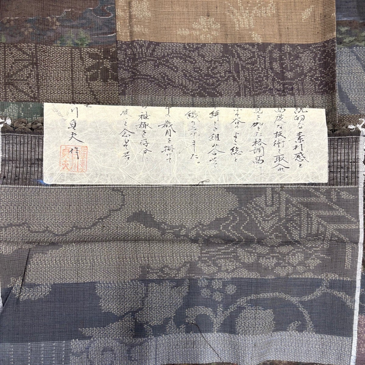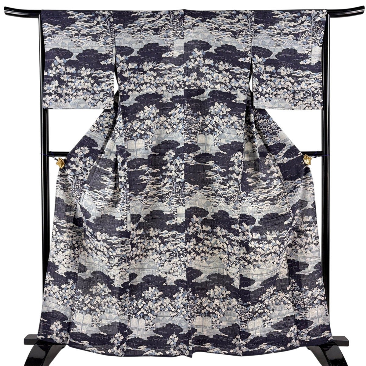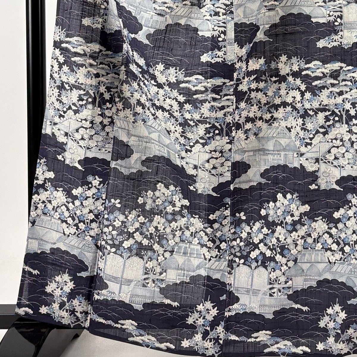 小紋 身丈163cm 裄丈65cm M 単衣 紬地 風景 草花 紺色 正絹 名品