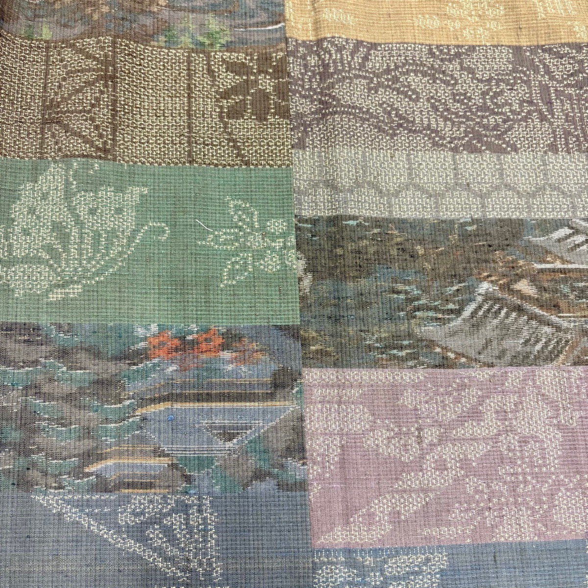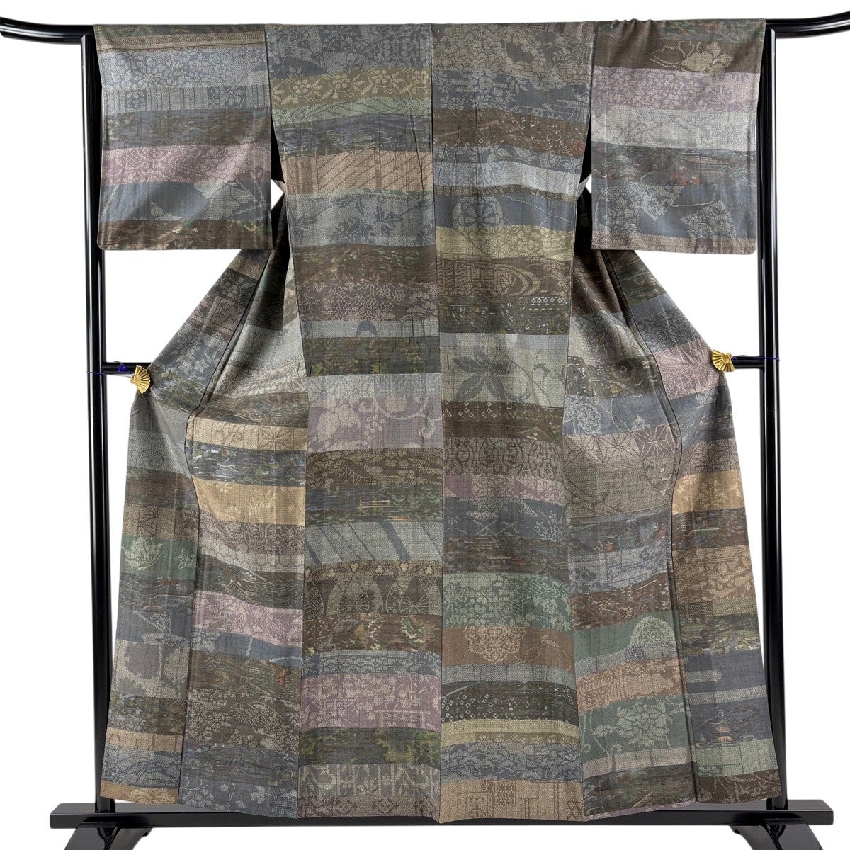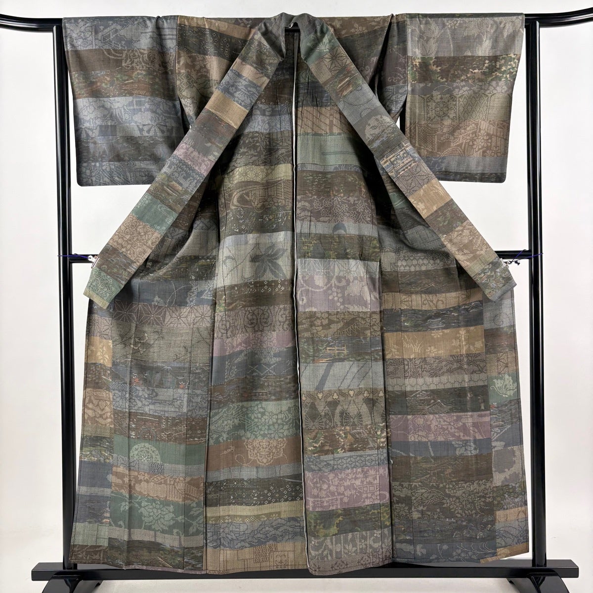 【美品】 紬 身丈159cm 裄丈64cm M 単衣 白川貞夫 落款あり 蝶 段縞 灰緑 正絹 名品