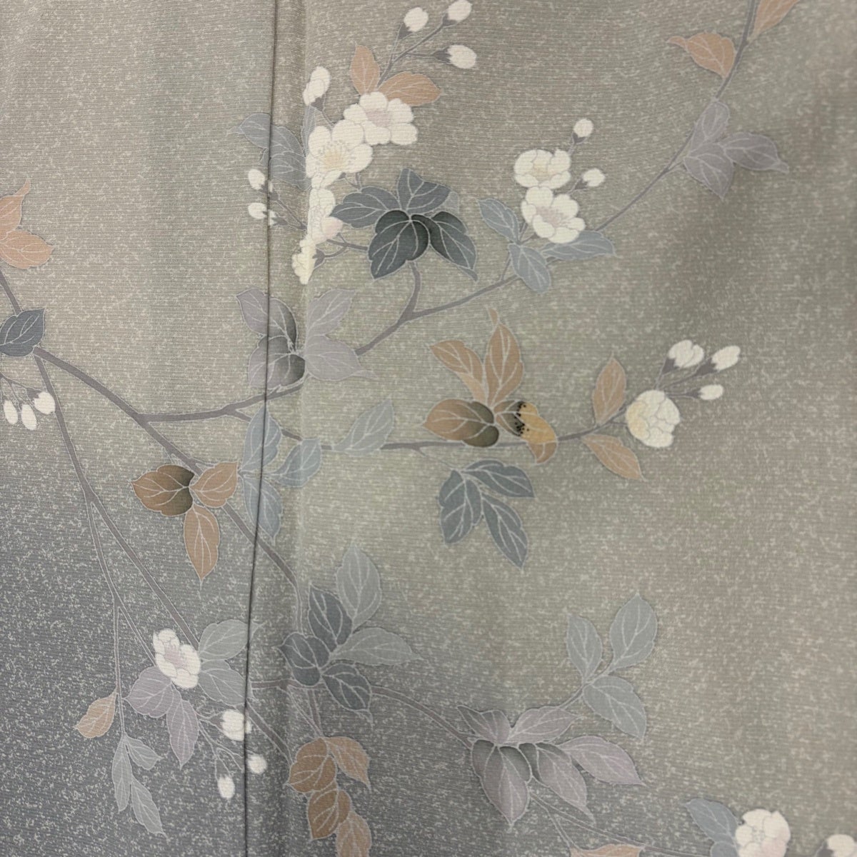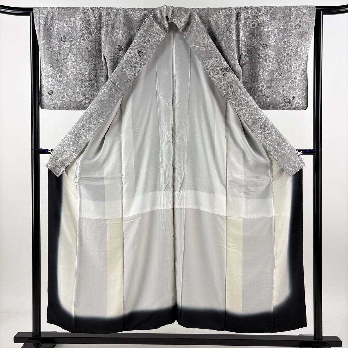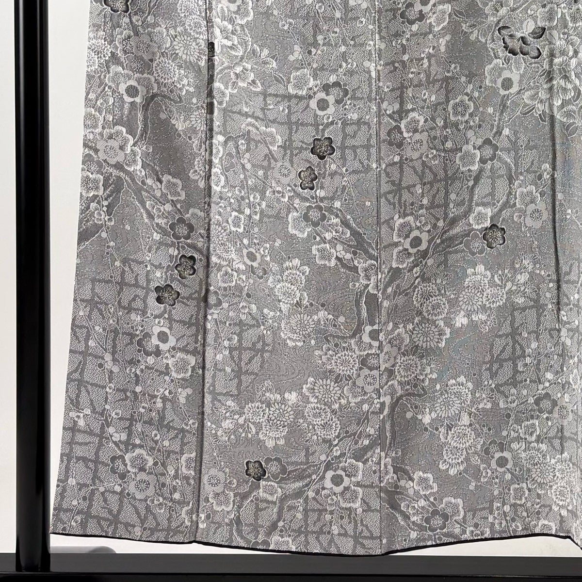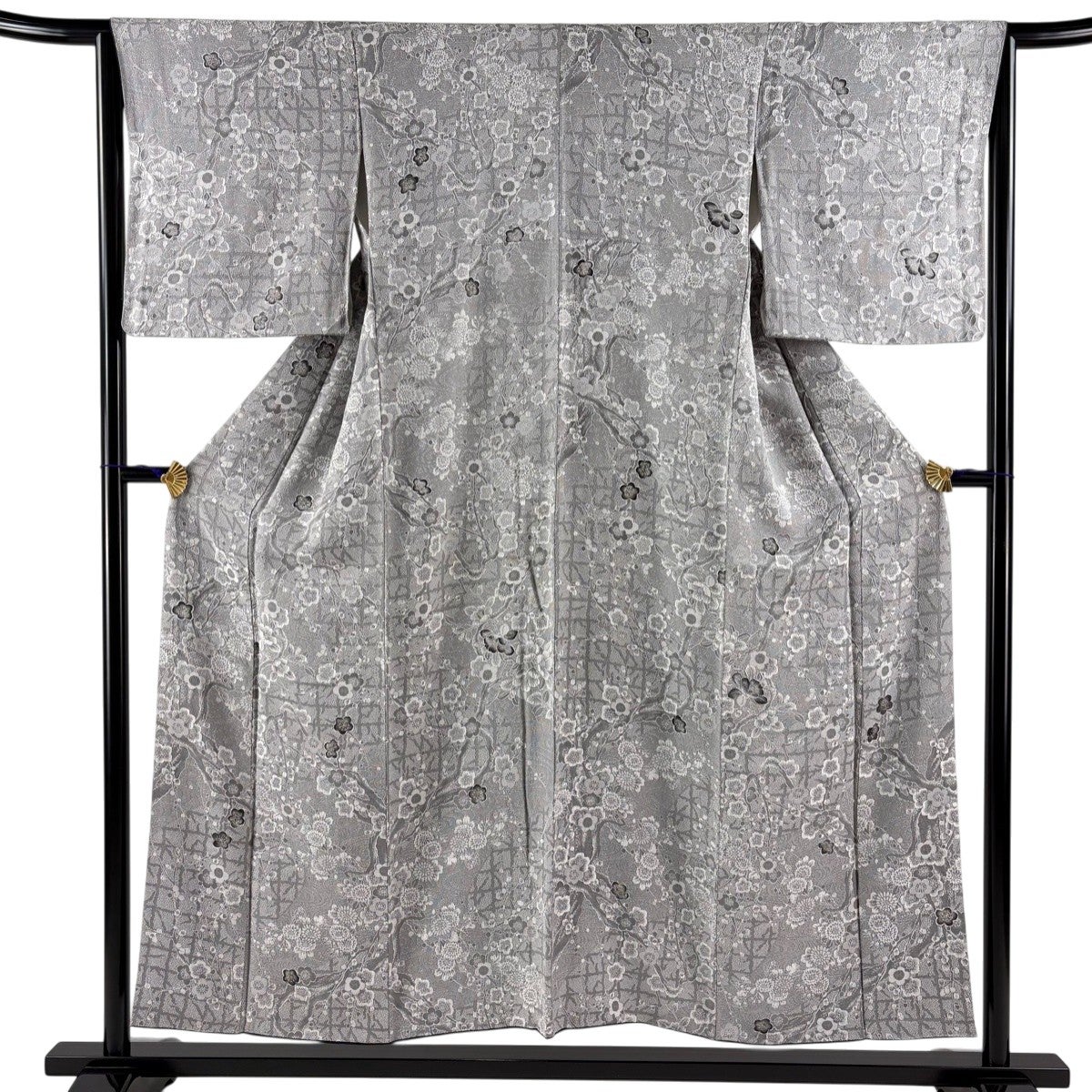 小紋 身丈153cm 裄丈64cm M 袷 梅 格子 金彩 紋意匠 灰色 正絹 名品