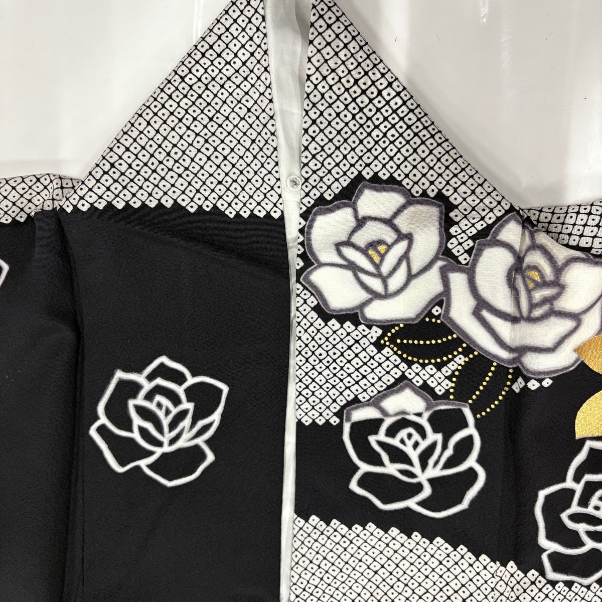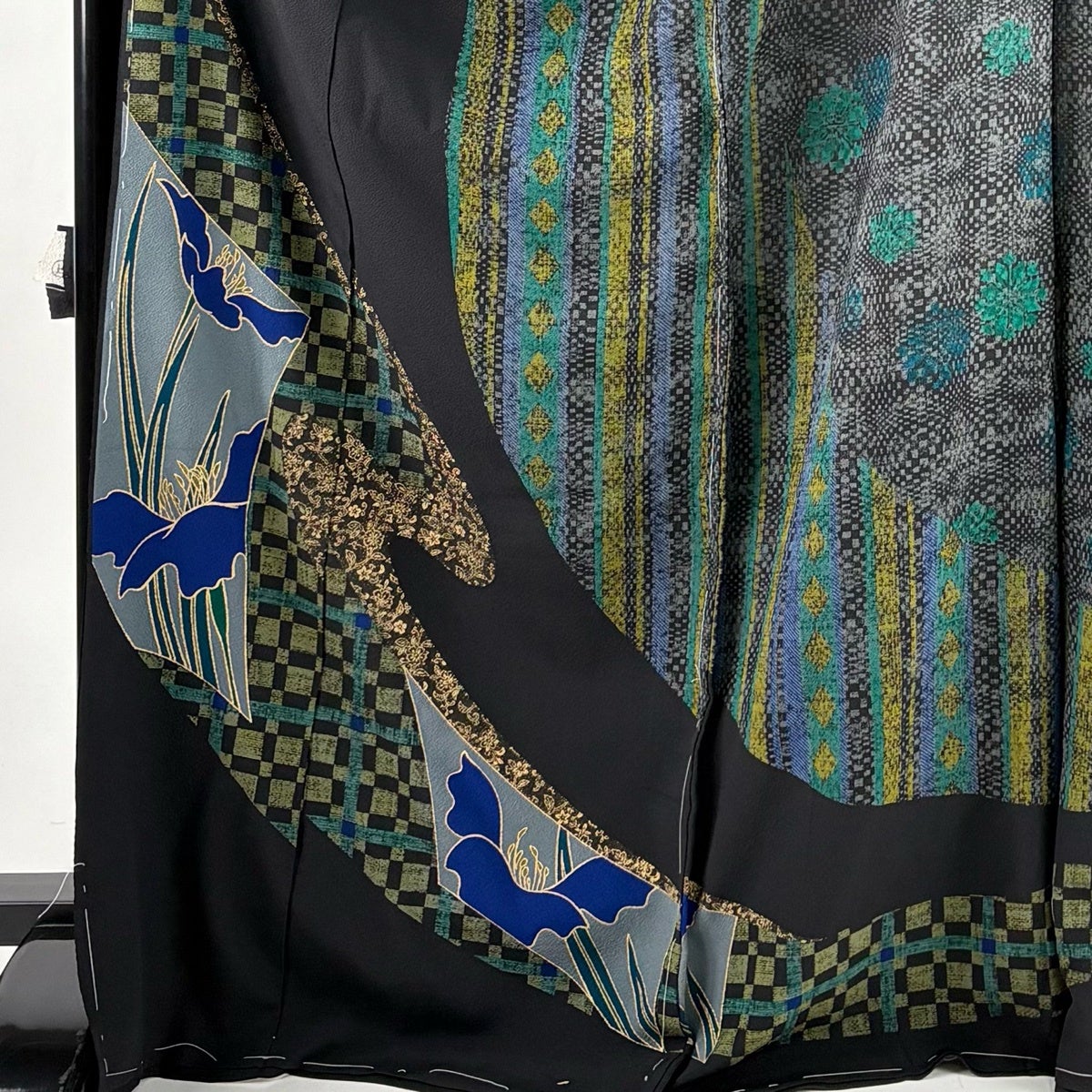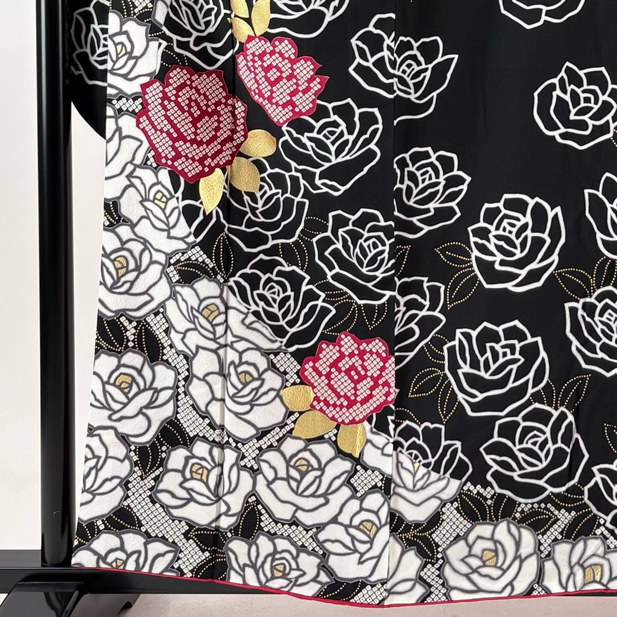 【美品】 振袖 身丈158cm 裄丈66cm M 袷 薔薇 疋田 金彩 黒 正絹 名品