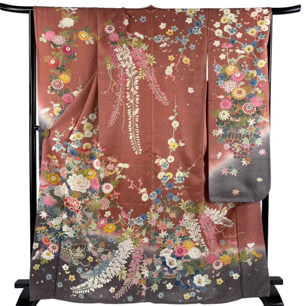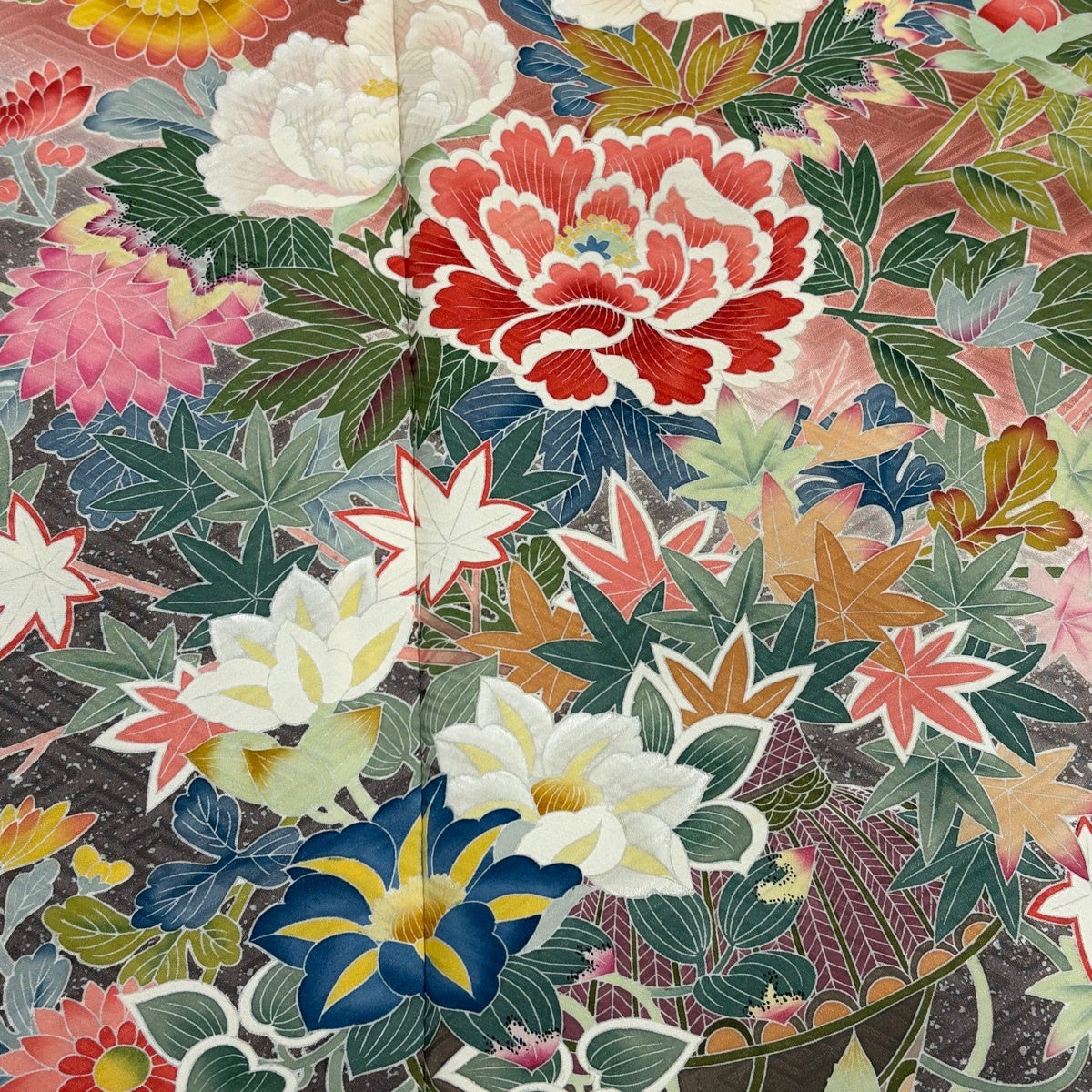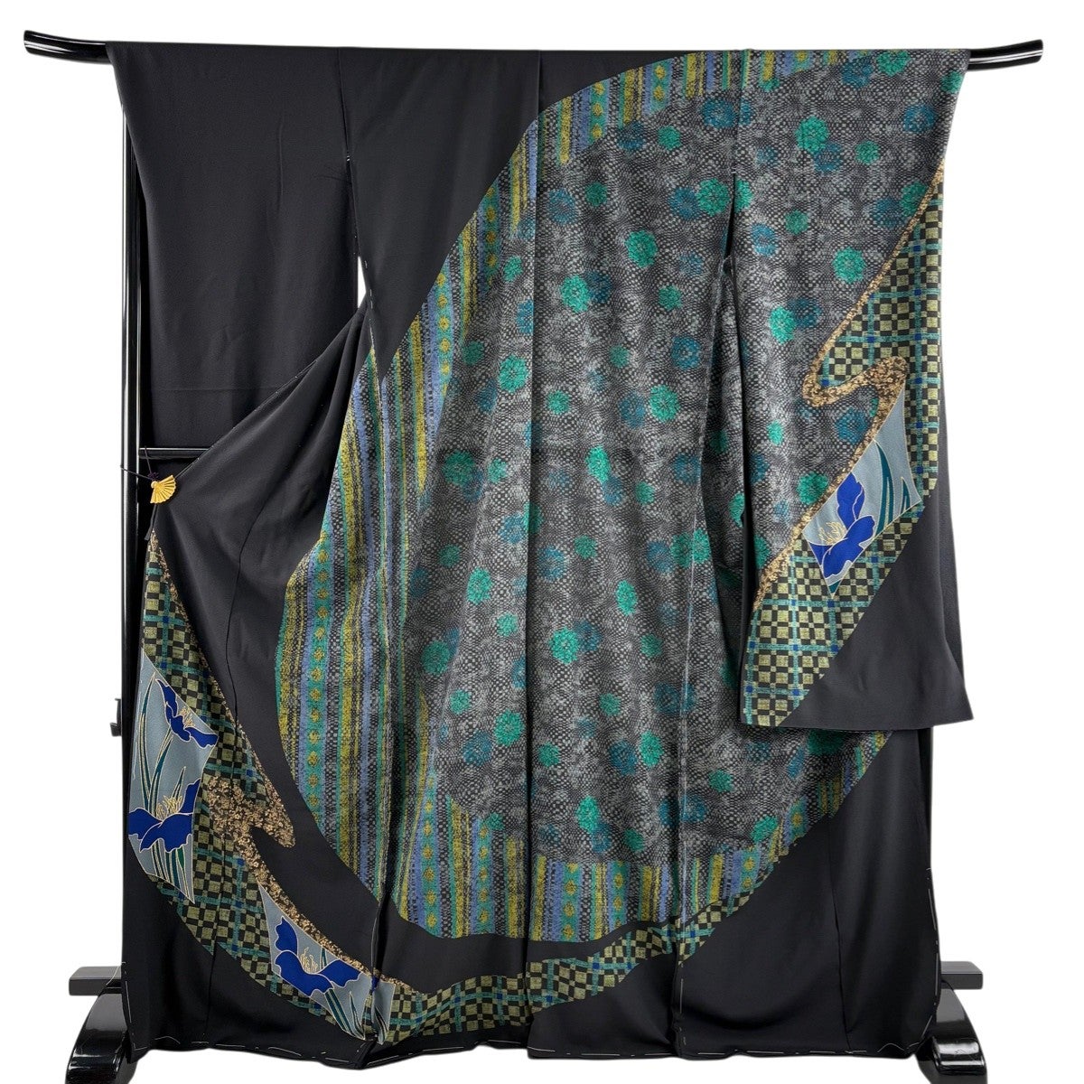 【美品】 振袖 身丈158cm 裄丈66cm M 袷 薔薇 疋田 金彩 黒 正絹 名品