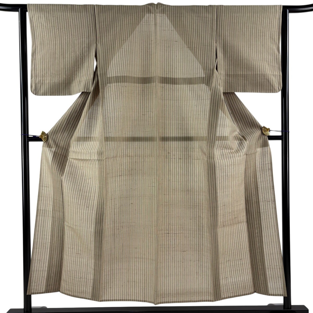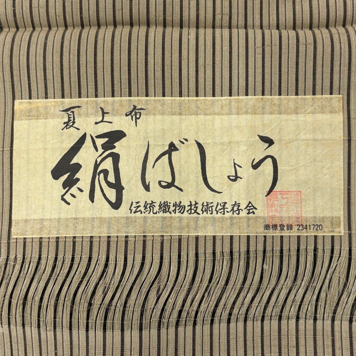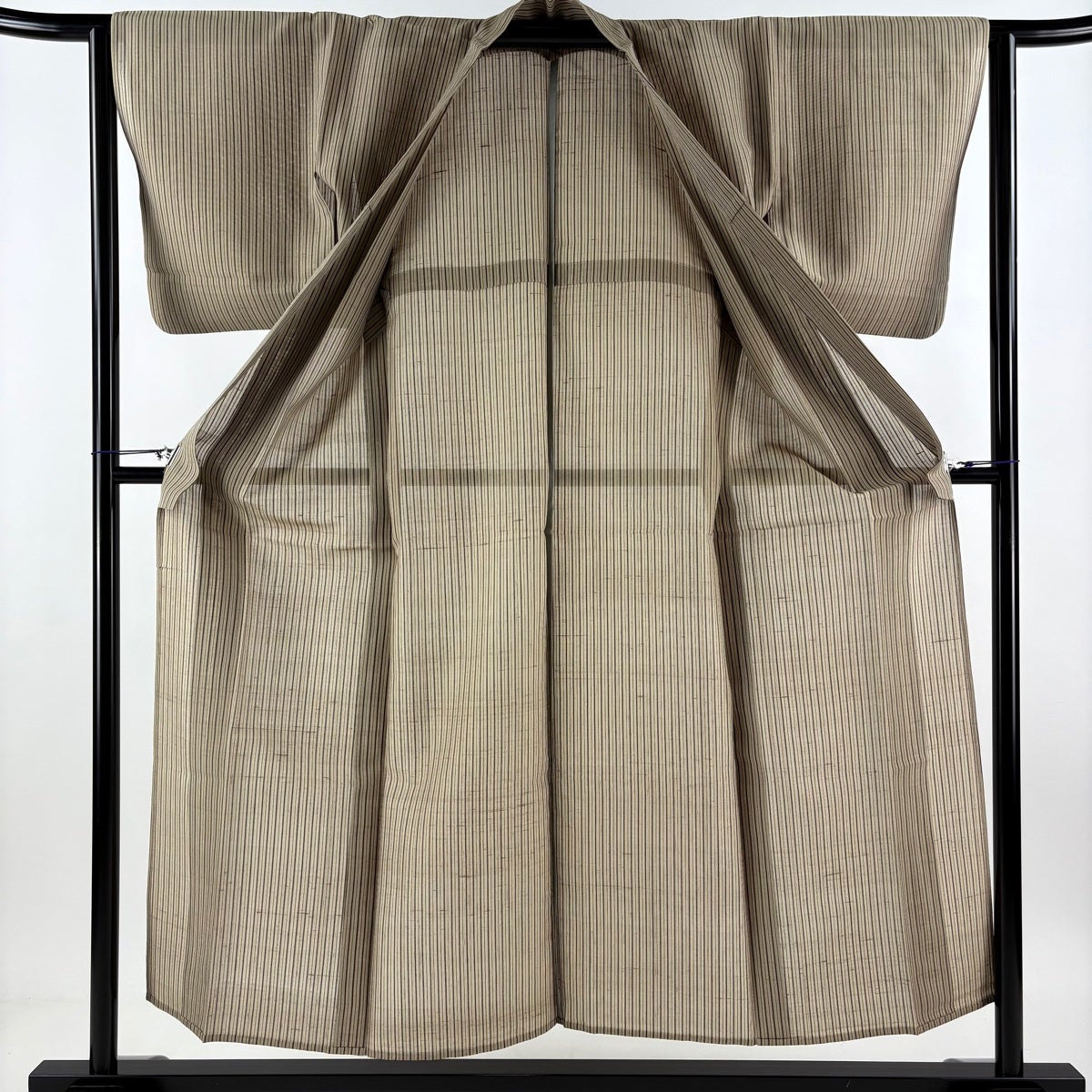 【美品】 紬 身丈153cm 裄丈63cm S 薄物 夏ばしょう 夏紬 バチ衿 証紙あり 縦縞 灰茶 正絹 秀品