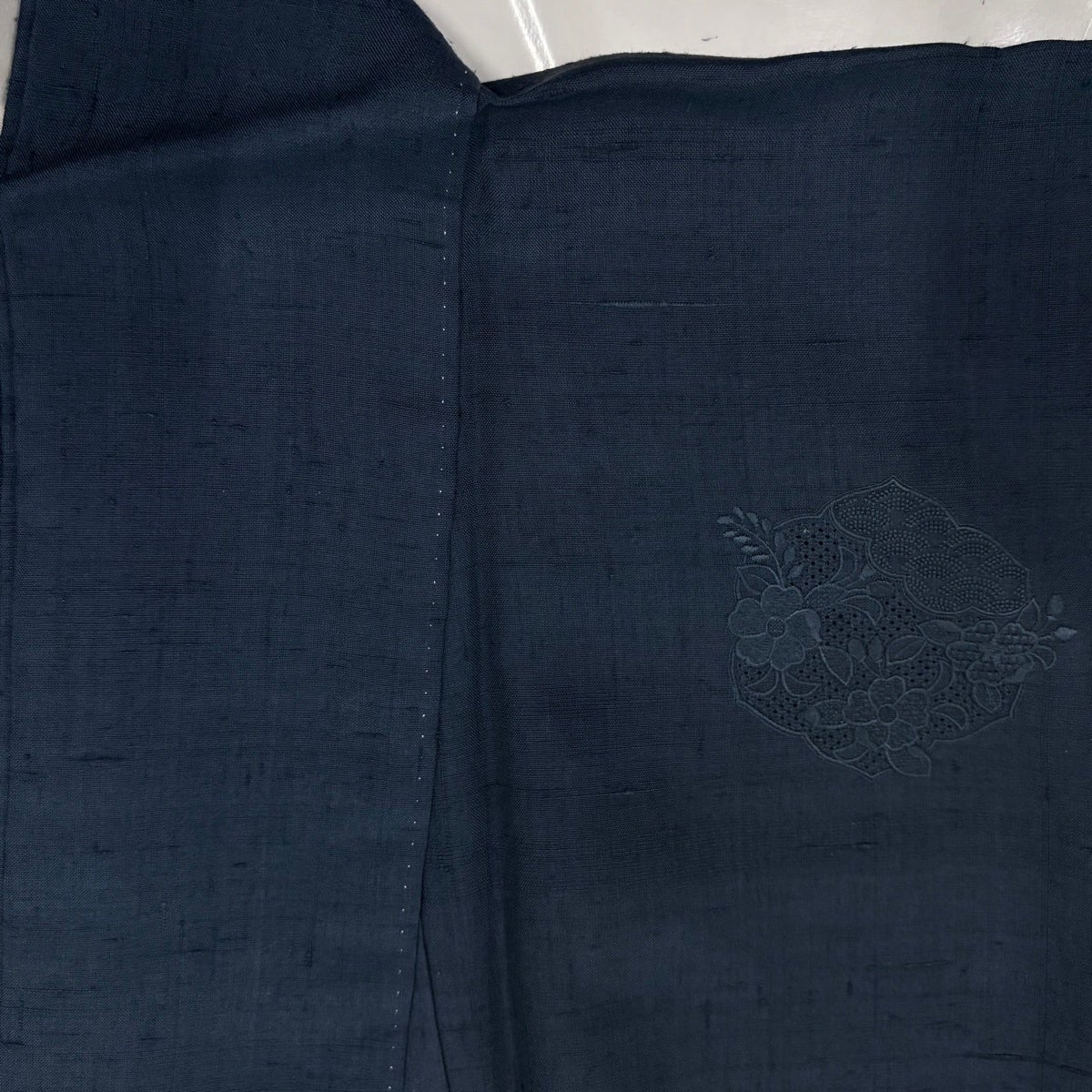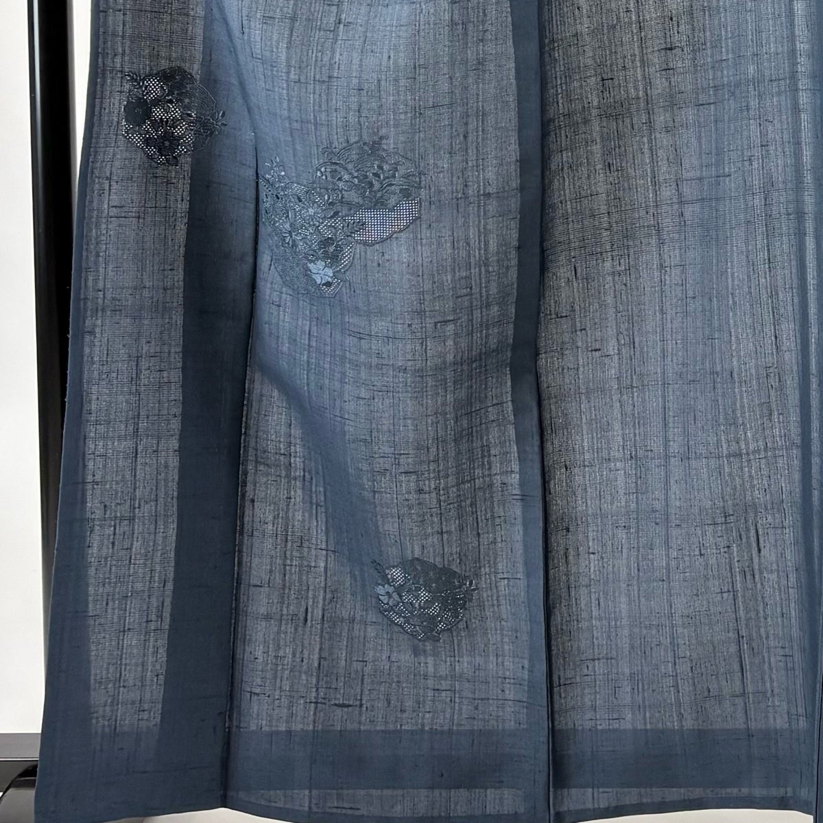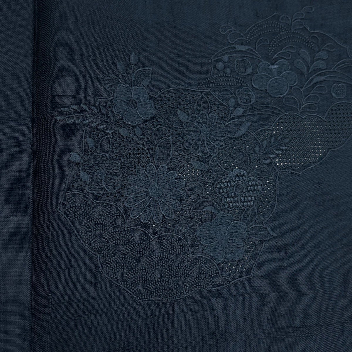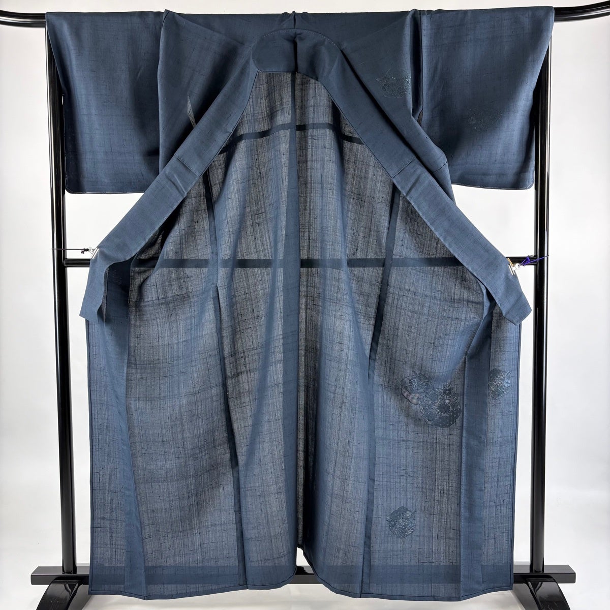 付下げ 身丈162.5cm 裄丈70.5cm L 薄物 夏紬地 菊 青海波 刺繍 紺色 正絹 秀品