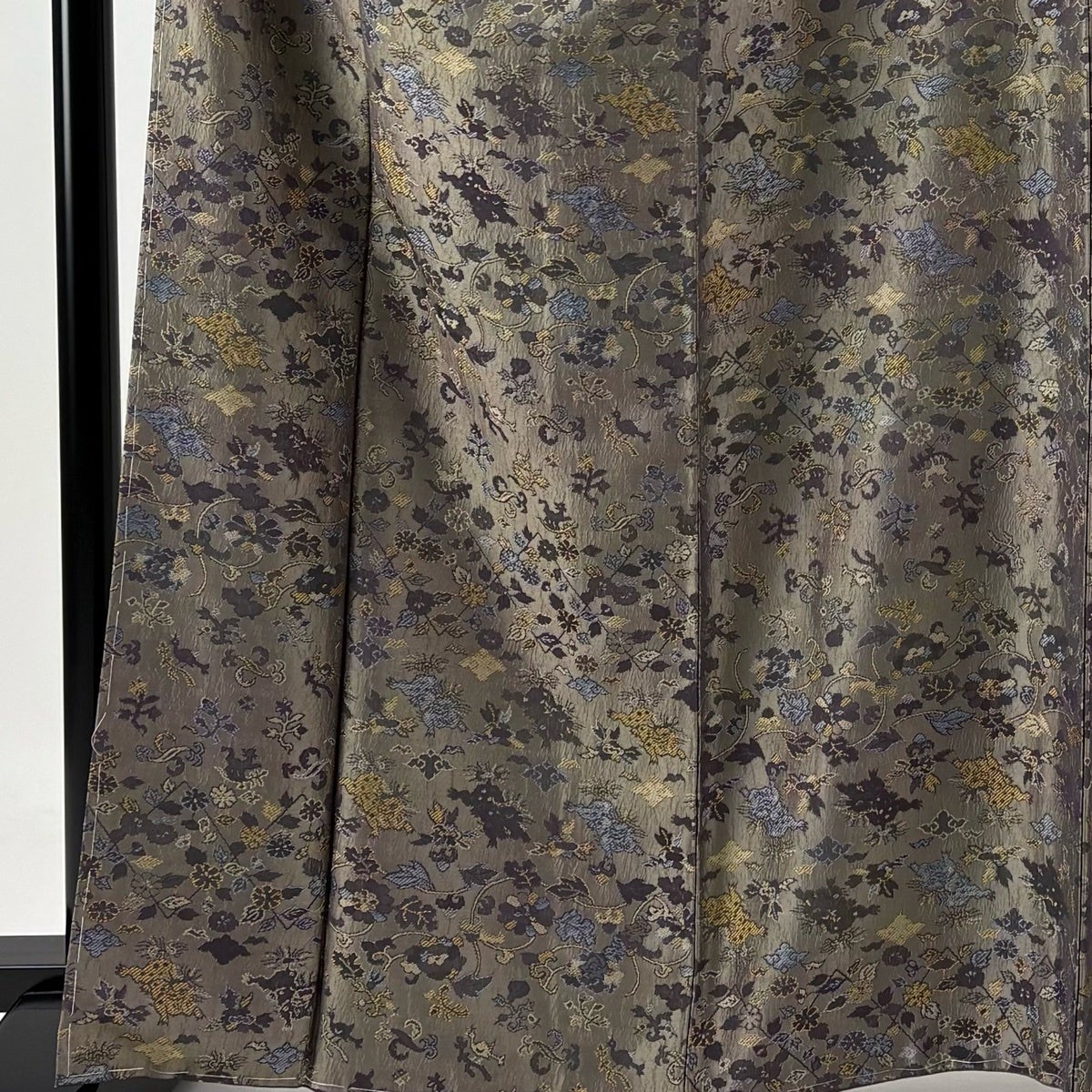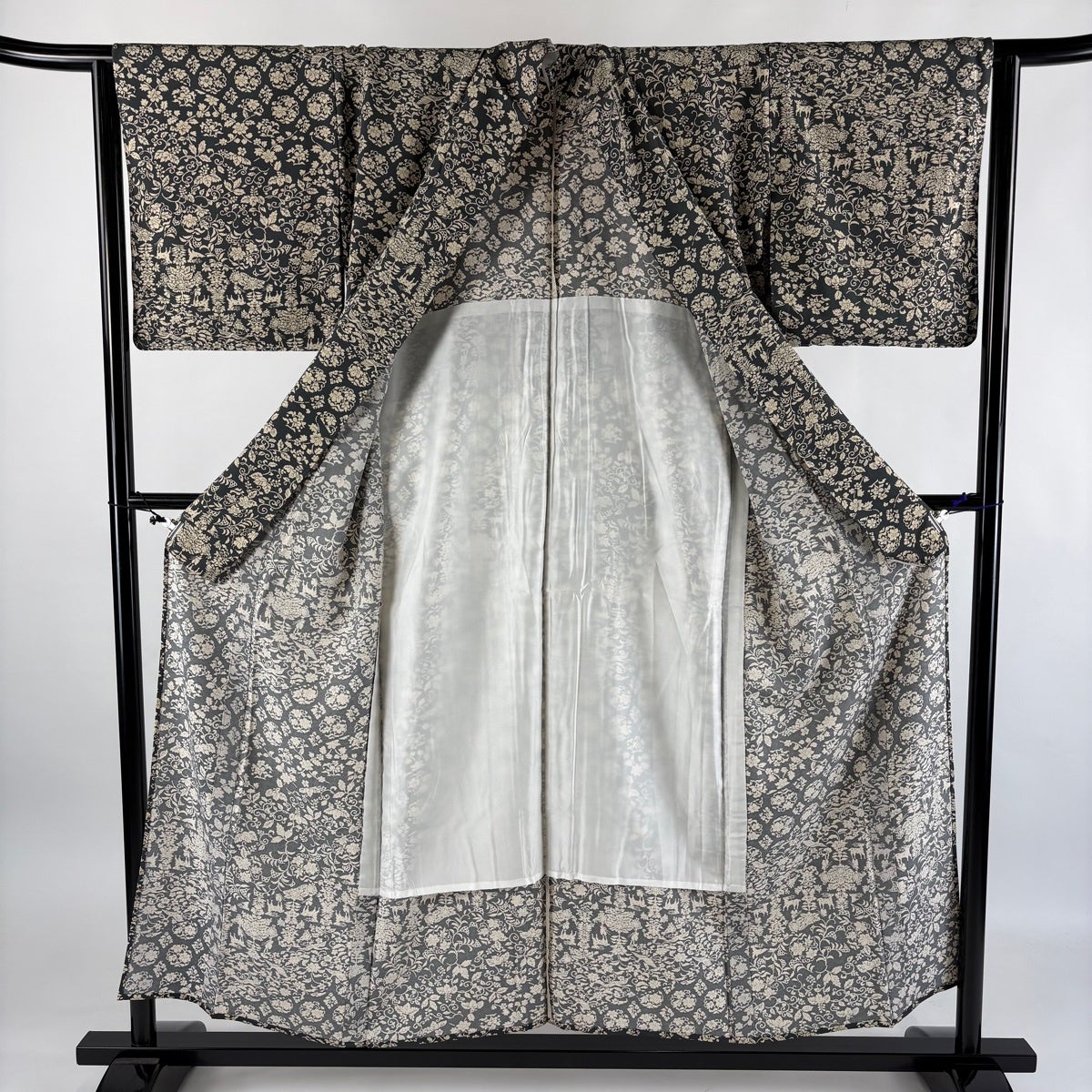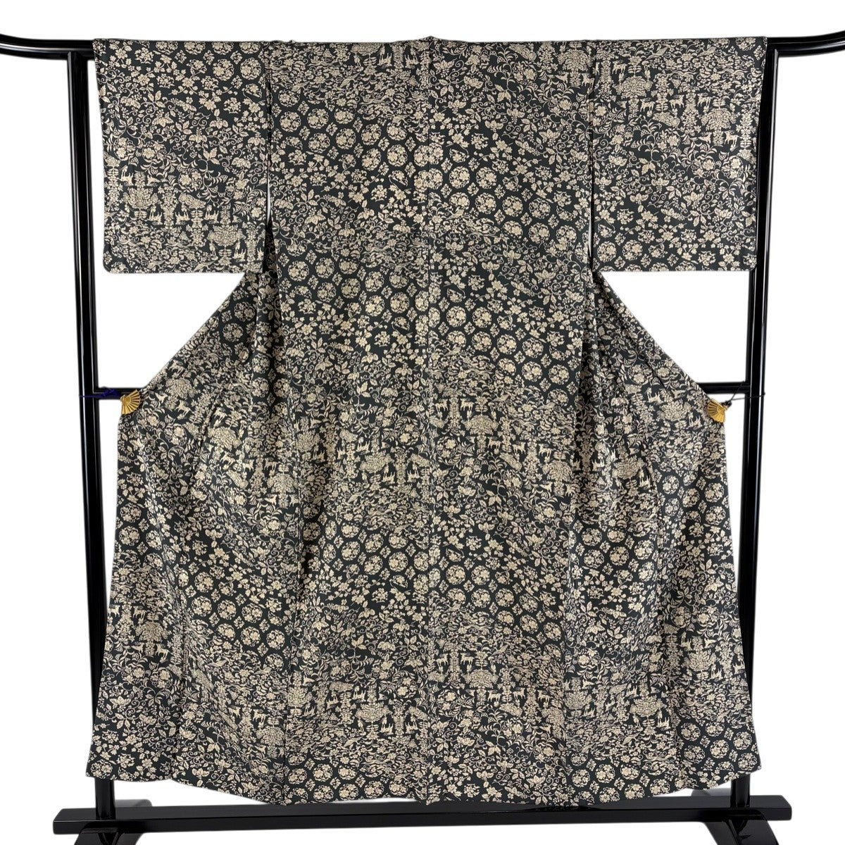 【美品】 小紋 身丈156cm 裄丈65.5cm M 単衣 樹下双獣 草花 灰緑 正絹 秀品