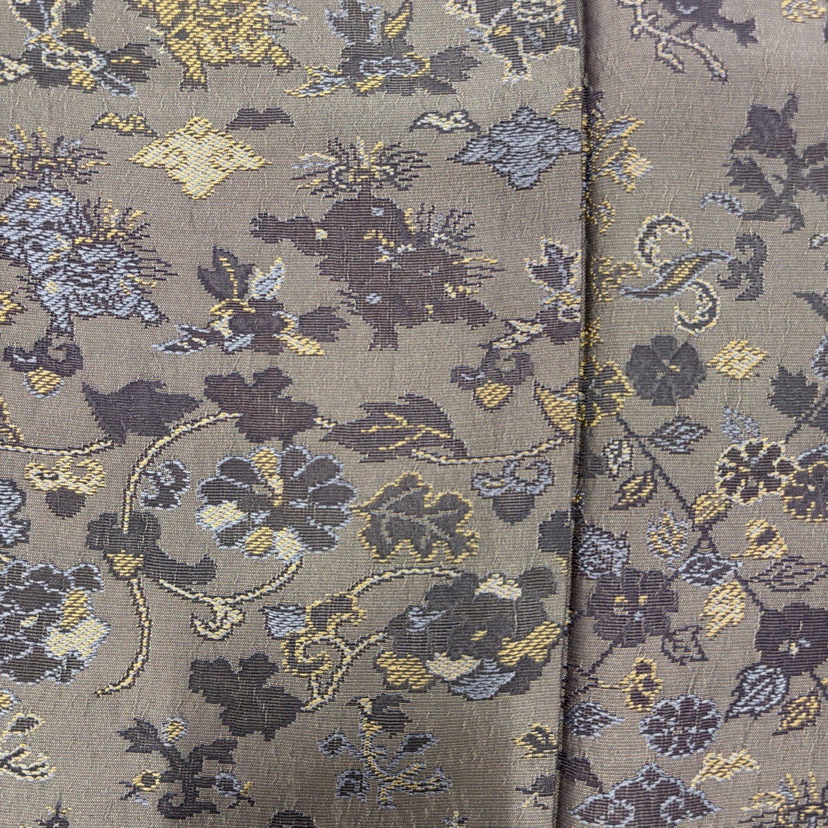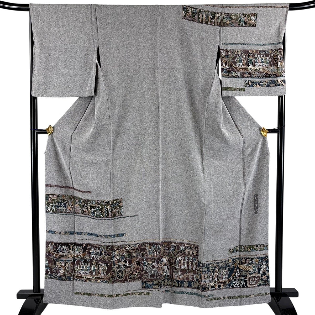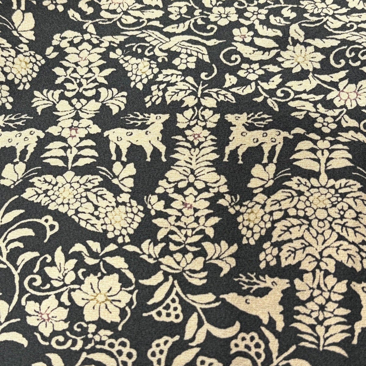 【美品】 小紋 身丈156cm 裄丈65.5cm M 単衣 樹下双獣 草花 灰緑 正絹 秀品