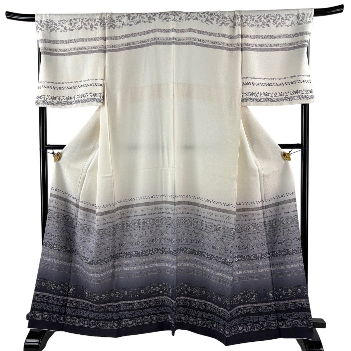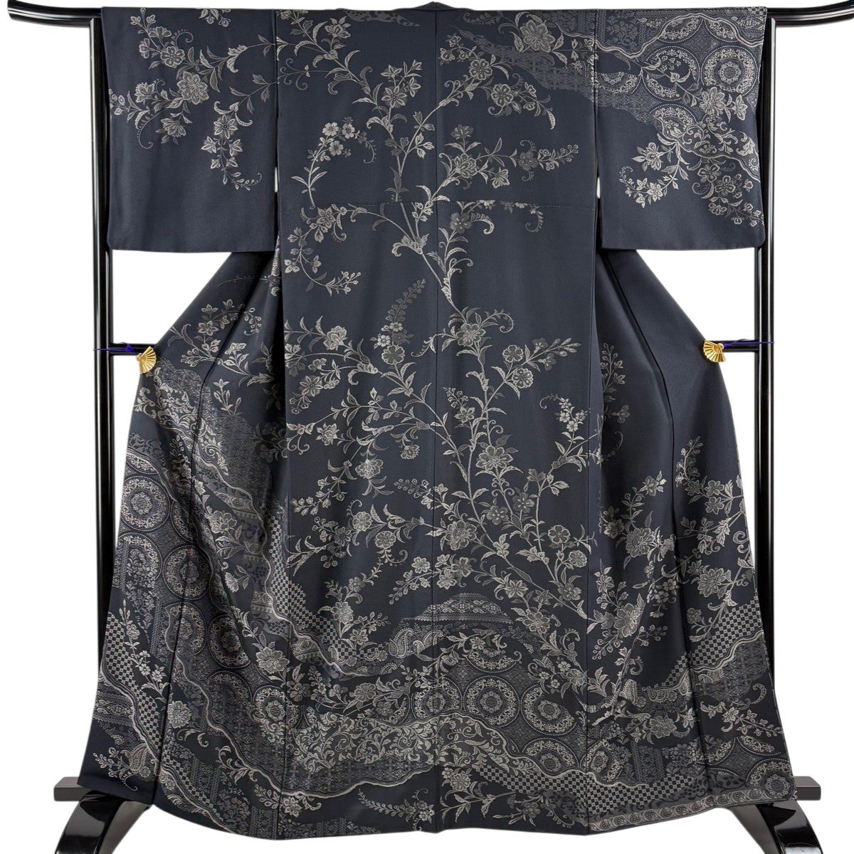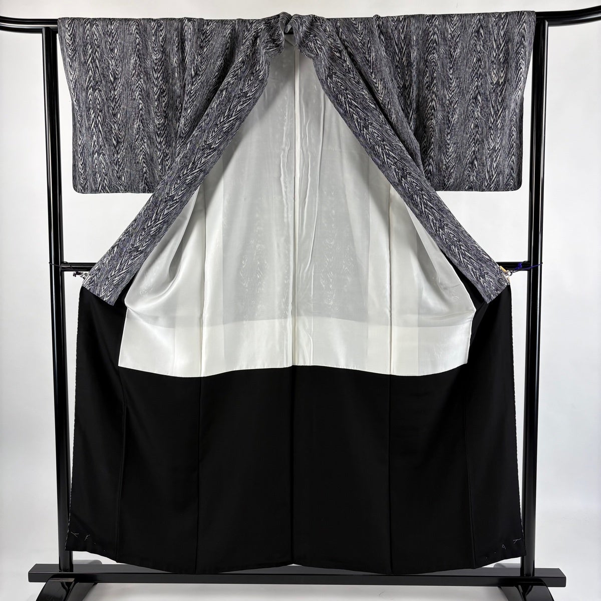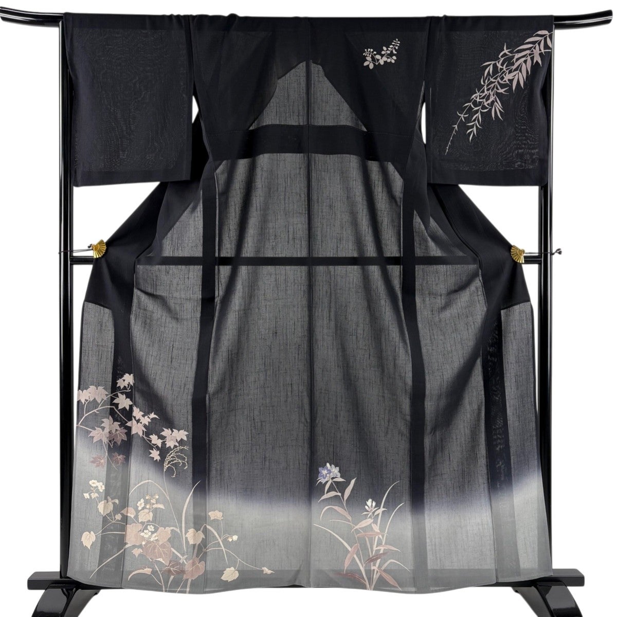 訪問着 身丈160cm 裄丈66cm M 薄物 紬地 枝葉 草花 染め分け ぼかし 墨色 正絹 秀品