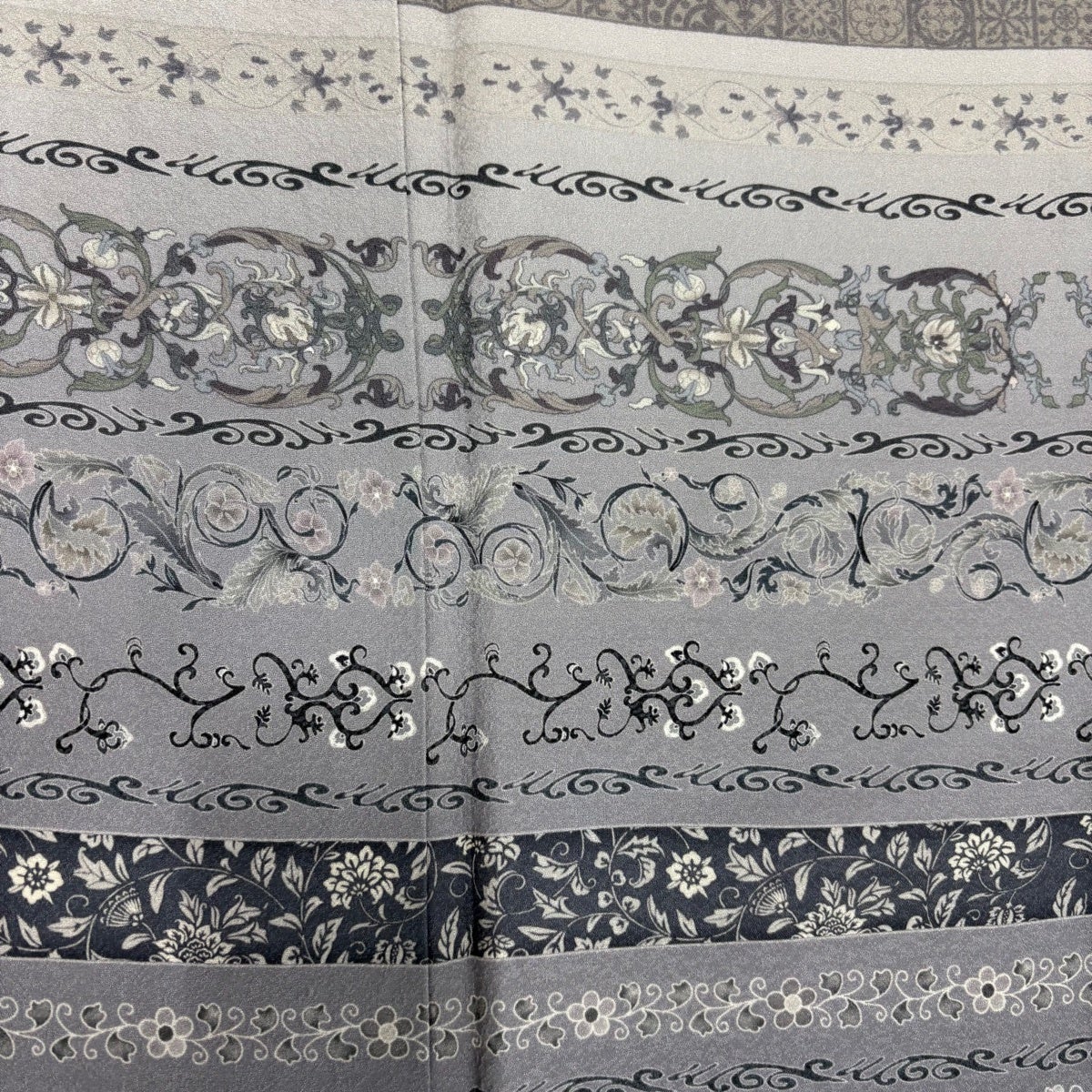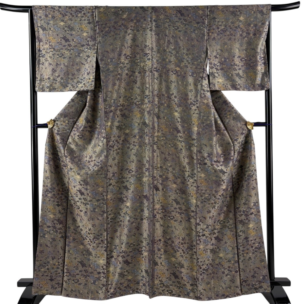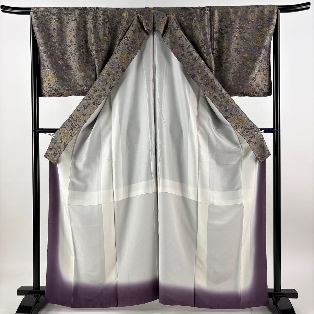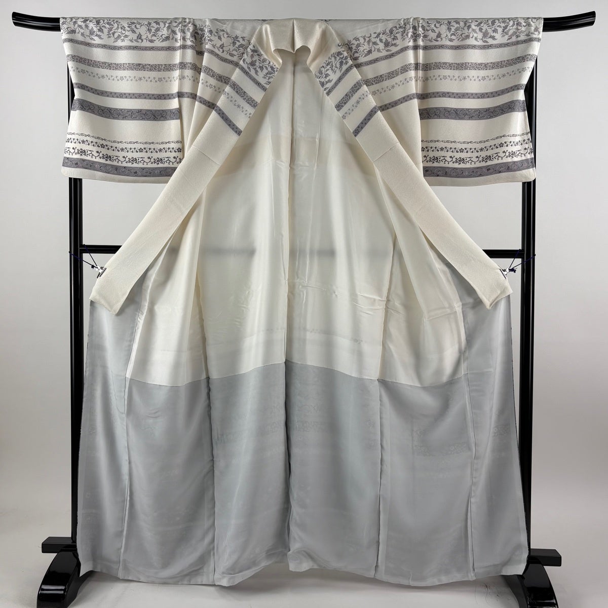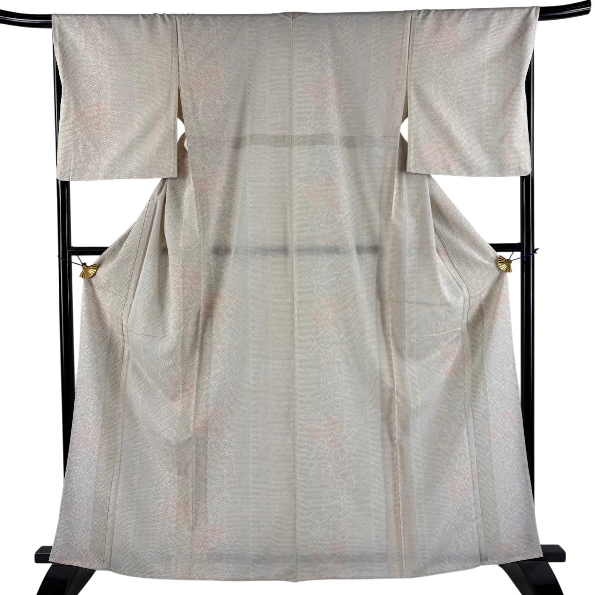 小紋 身丈158.5cm 裄丈62cm S 袷 落款あり 草花 縦縞 ぼかし 灰茶 正絹 秀品